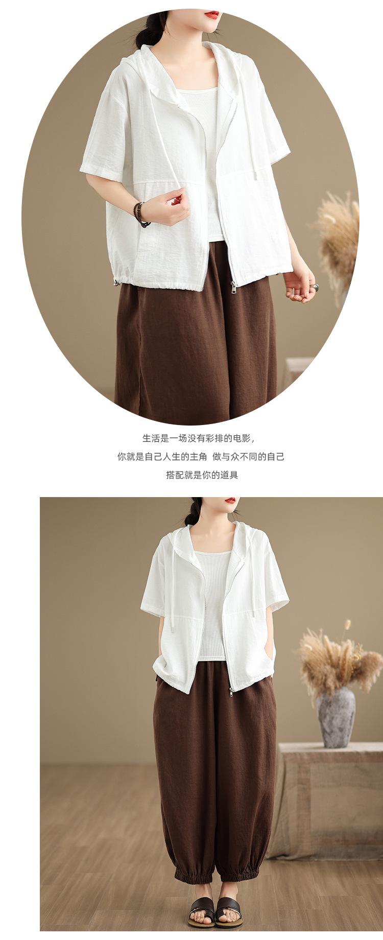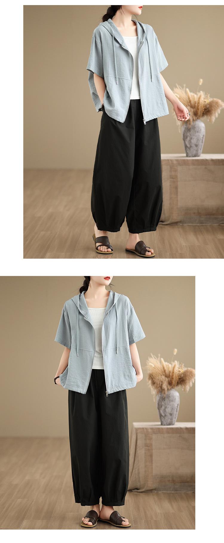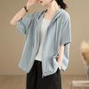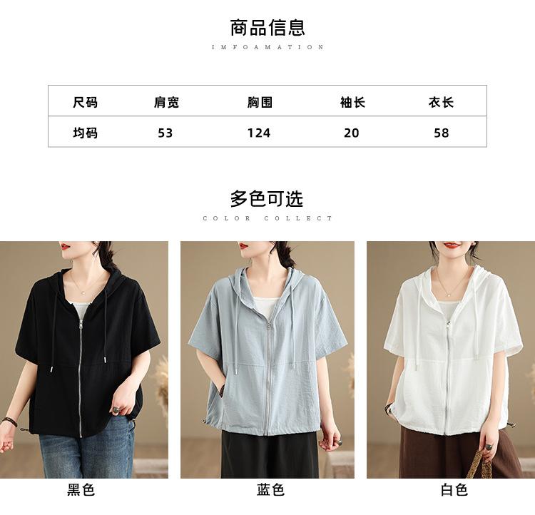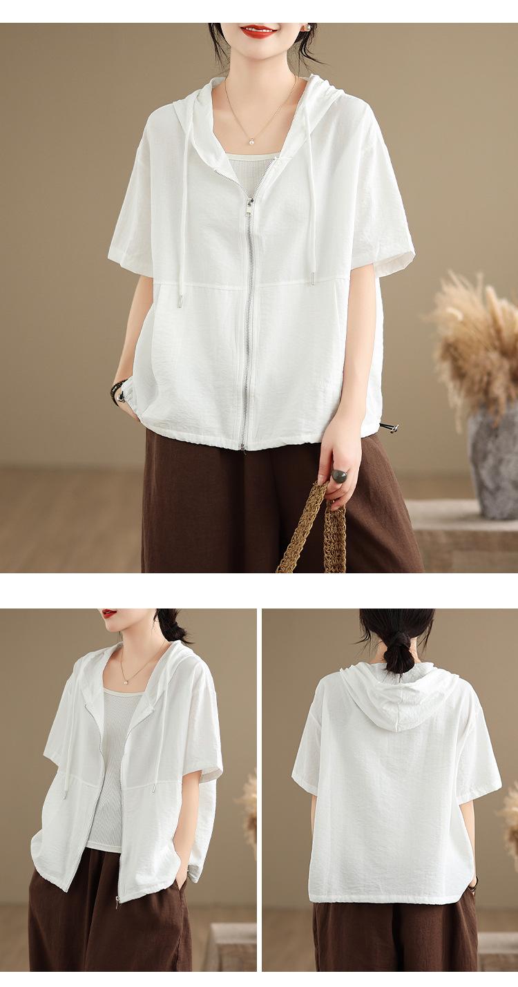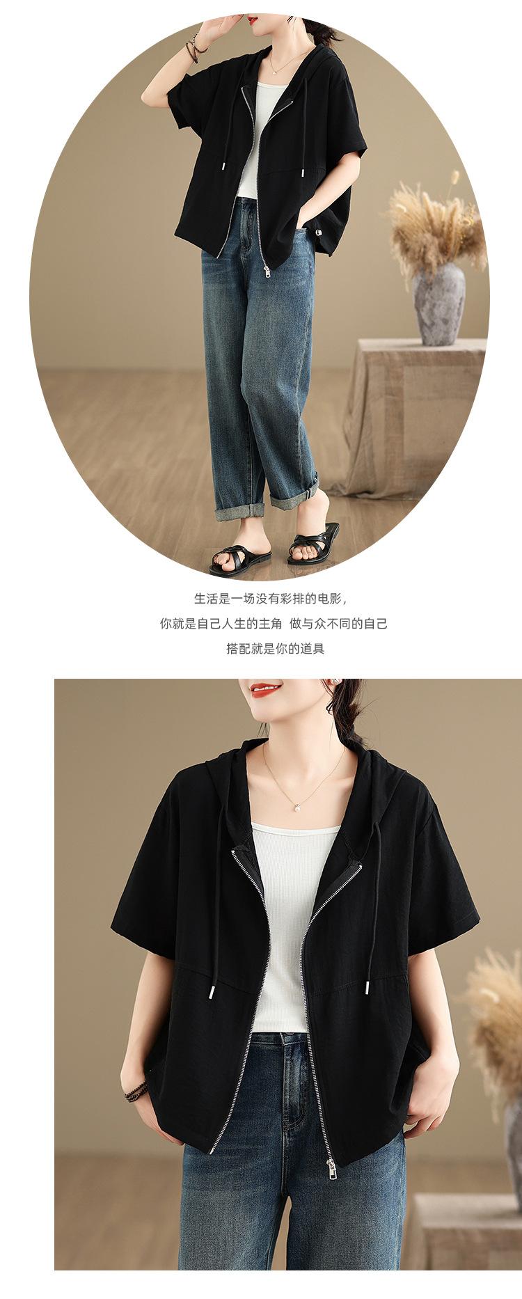 Verano Japonés y Coreano Nuevo Estilo Talla Grande con Capucha Color Sólido Casual Camiseta para Mujer Cremallera Chaqueta Pequeña Dobladillo con Cordón Top