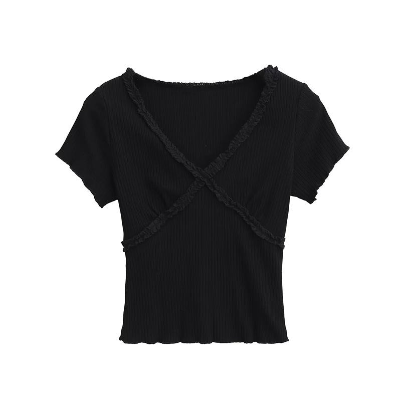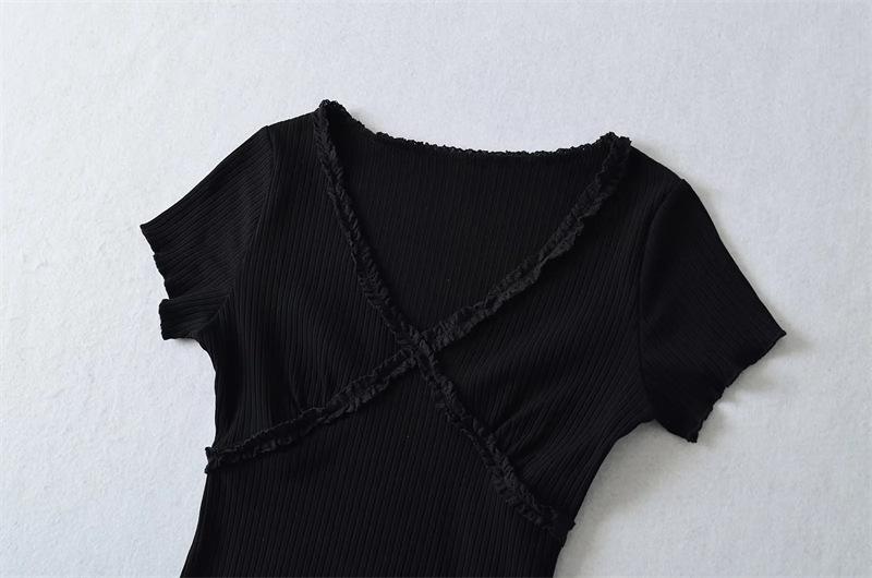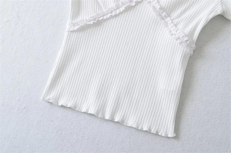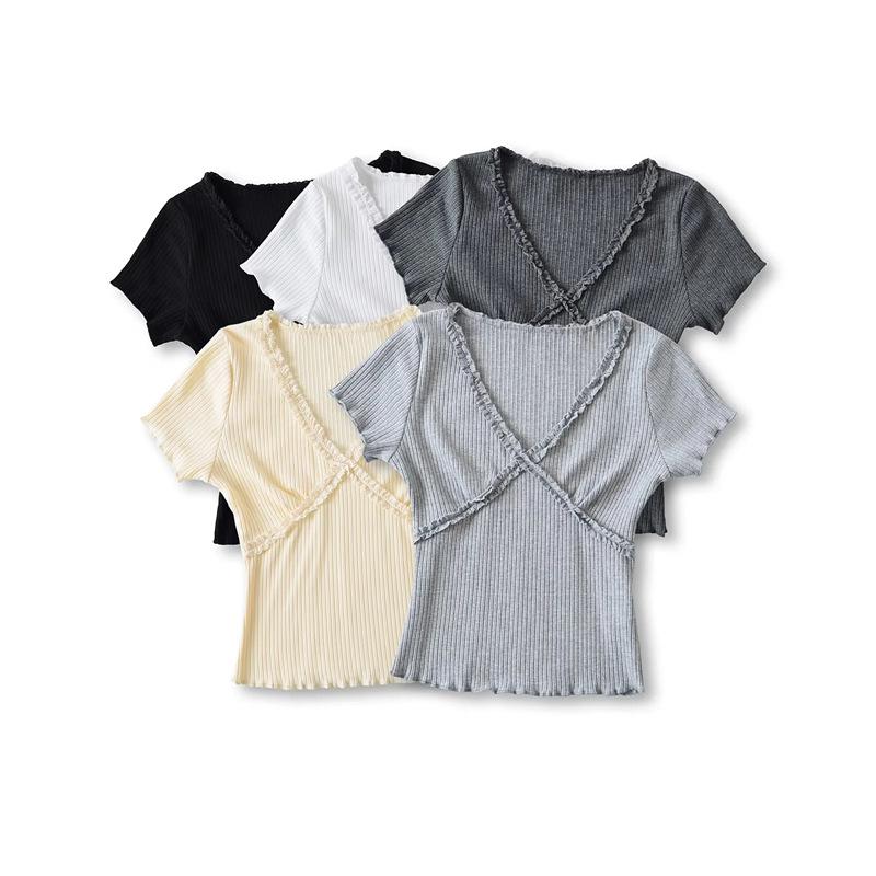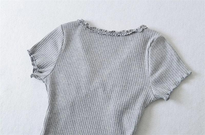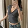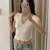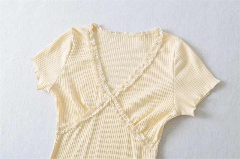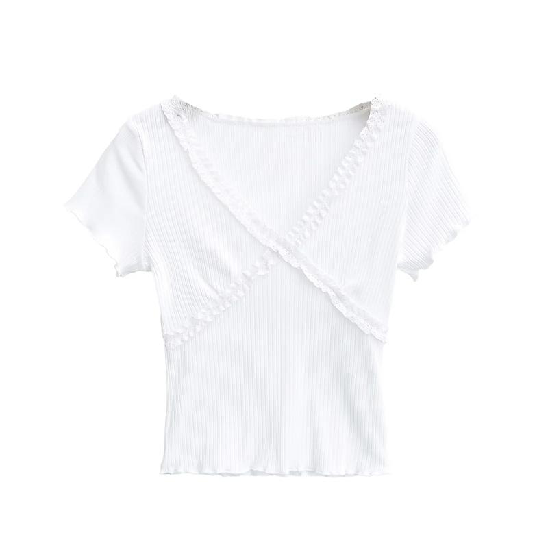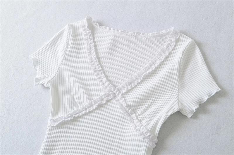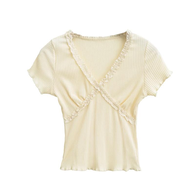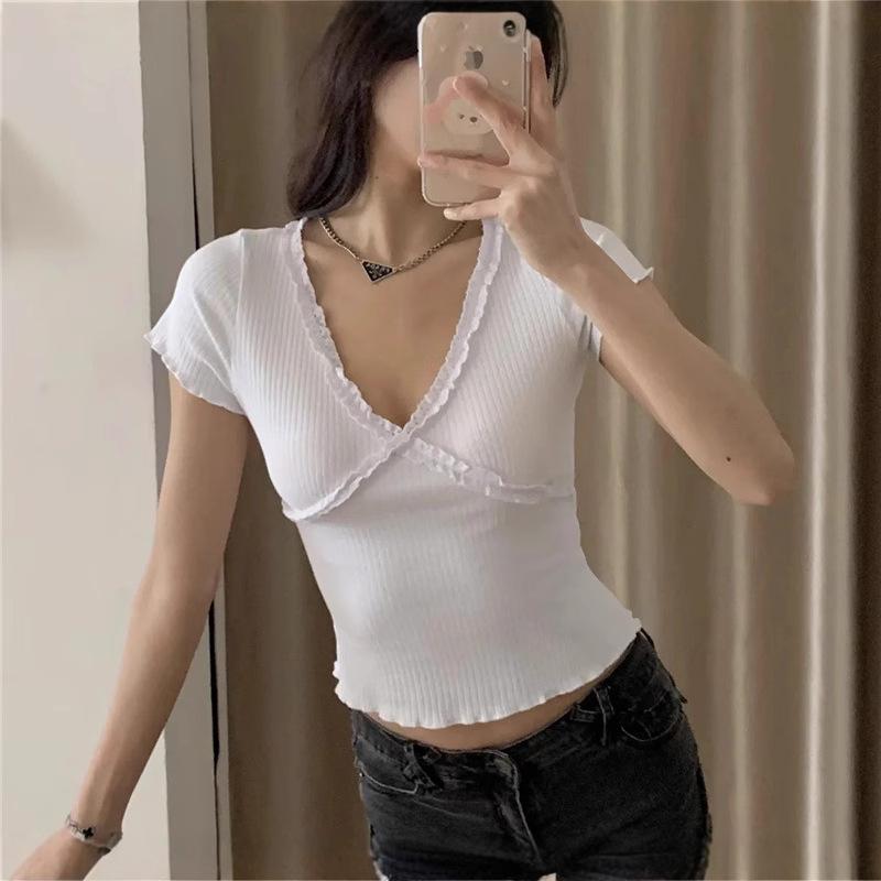 Deseo Puro Dulce Picante Volantes Cuello en V Manga Corta Camiseta para Mujer 2025 Verano Nuevo Encaje Ajustado Corto Top Versátil para Mujer