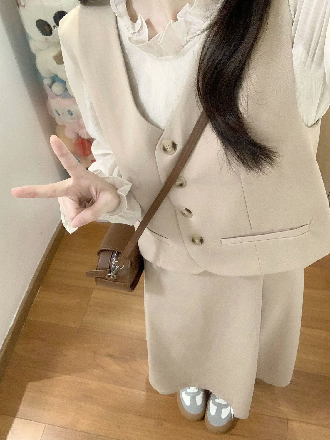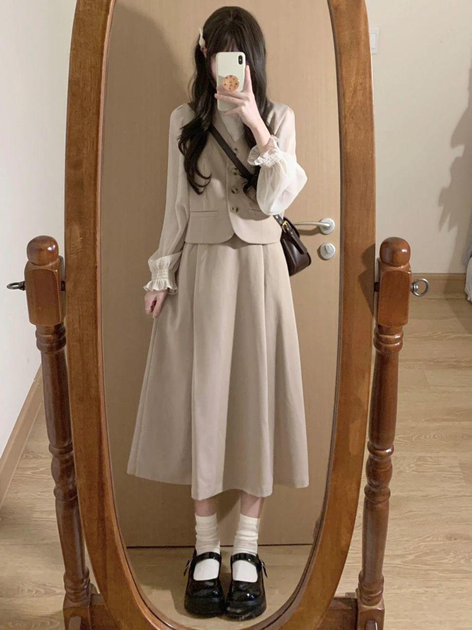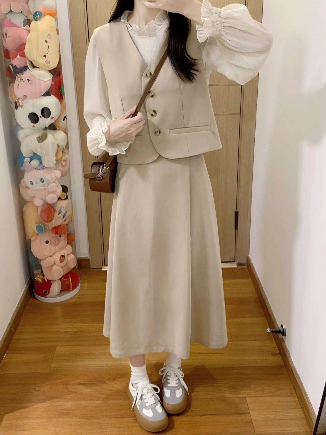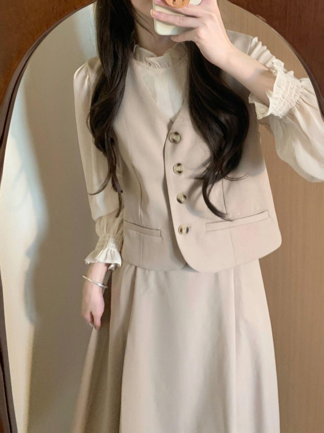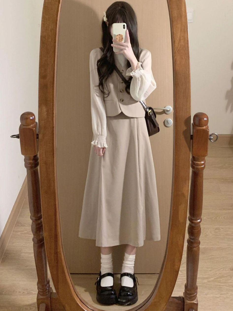 Off-white long-sleeved shirt, apricot vest, Apricot skirt, apricot vest + apricot midi skirt, three piece suit