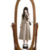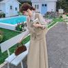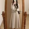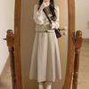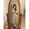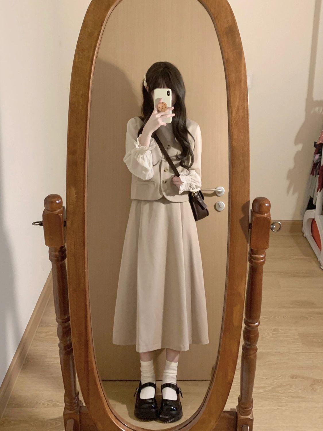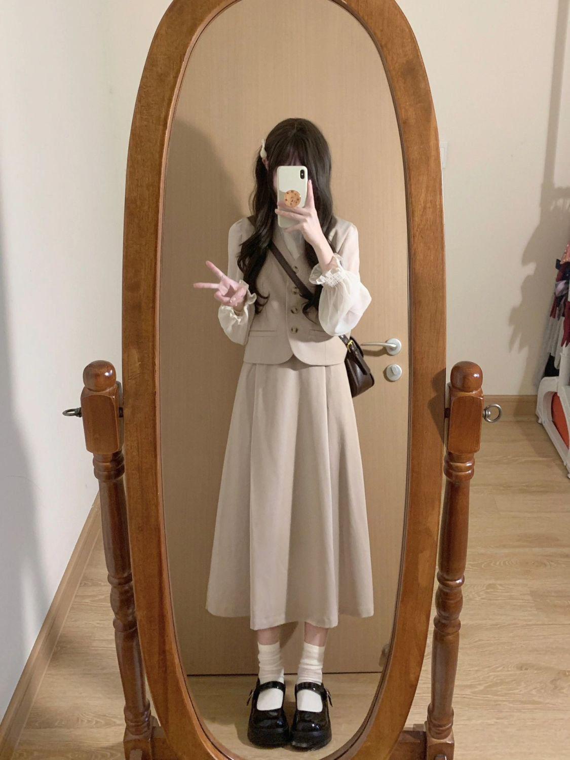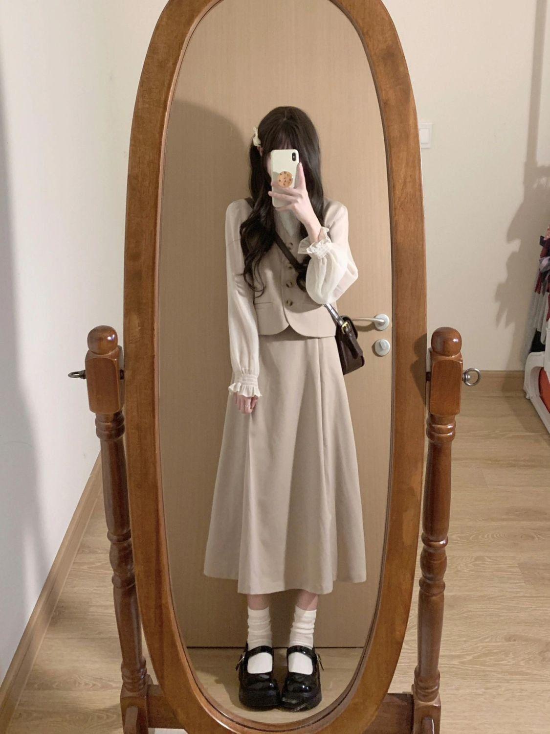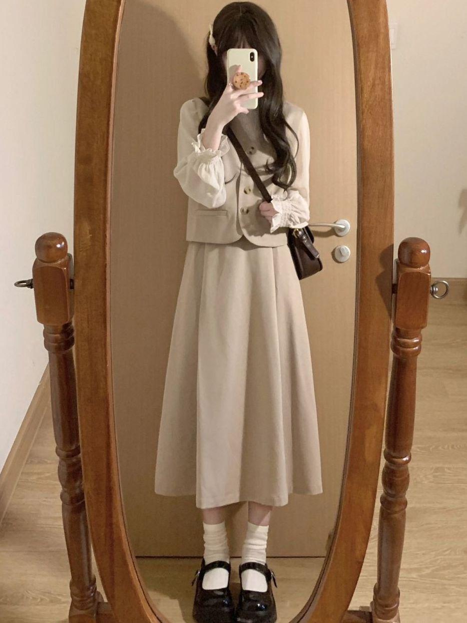Off-white long-sleeved shirt, apricot vest, Apricot skirt, apricot vest + apricot midi skirt, three piece suit