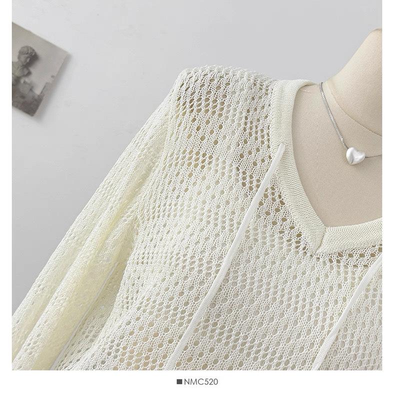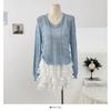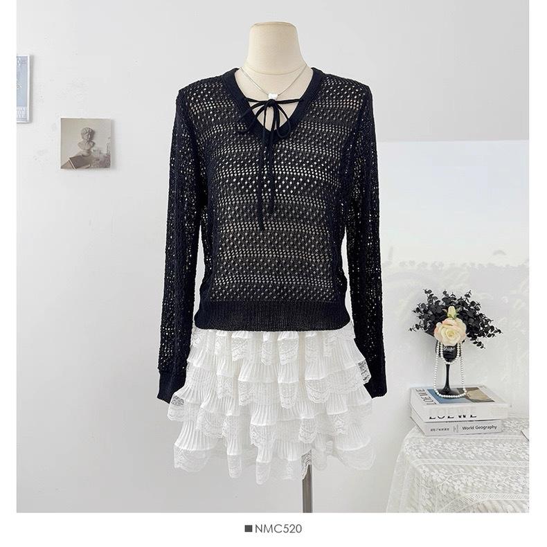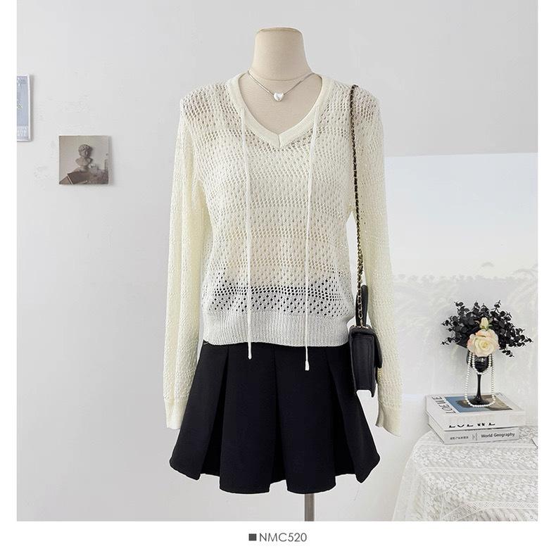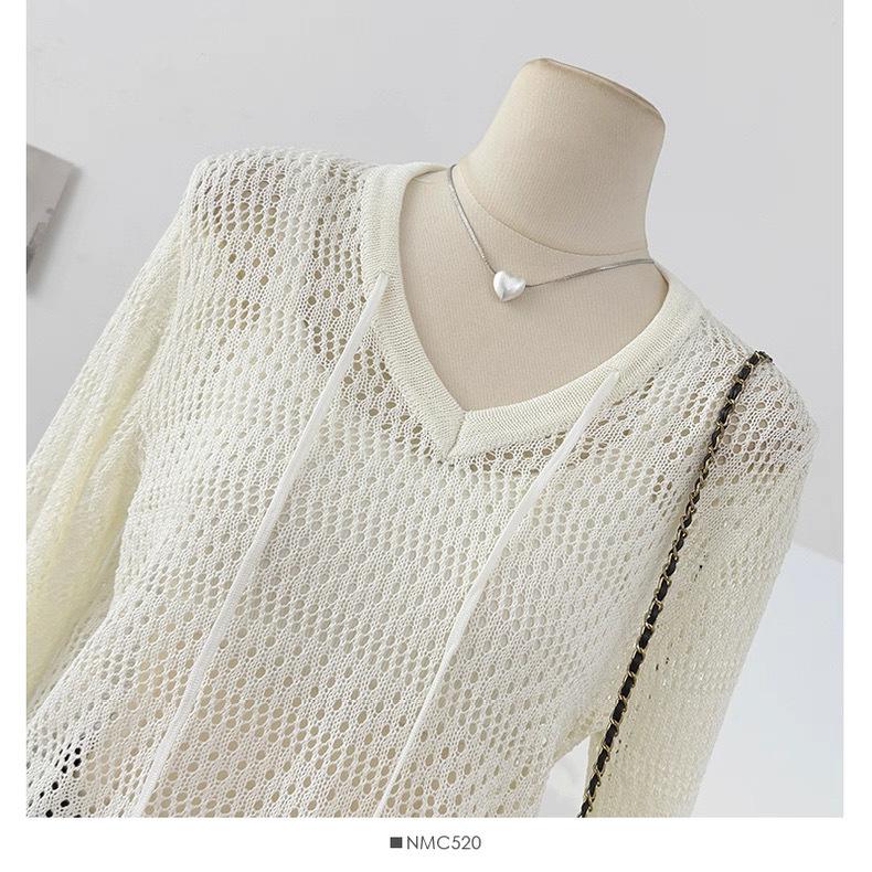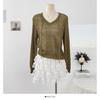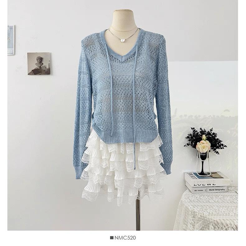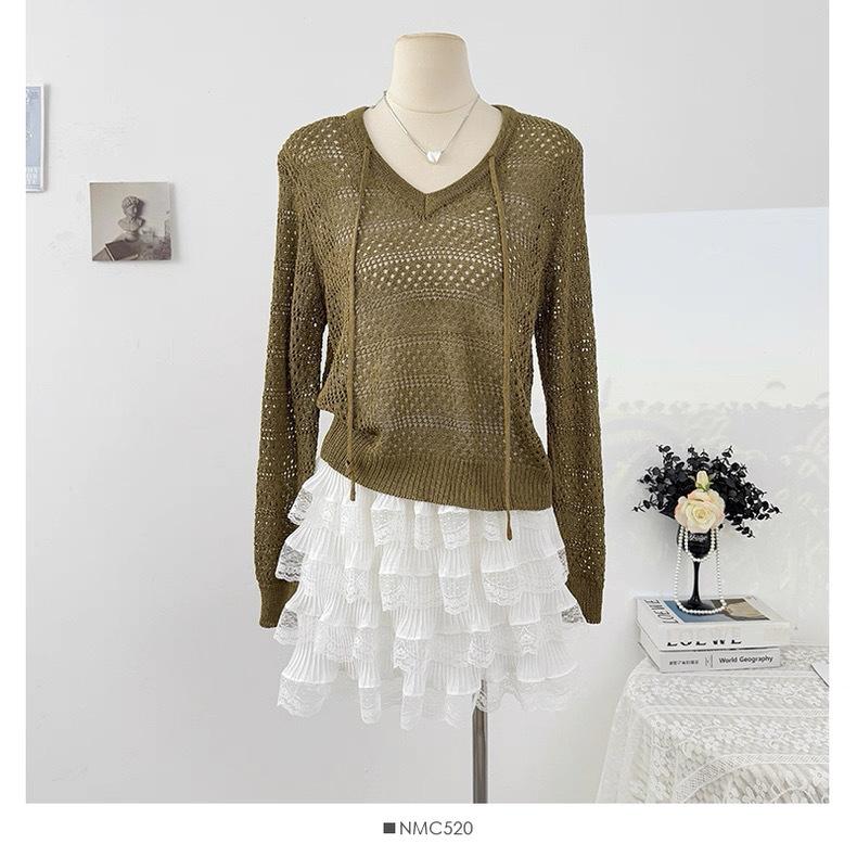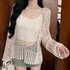 Estilo coreano calado con cordón de ajuste cuello en V manga larga punto ropa de mujer otoño nuevo holgado perezoso color sólido top ropa de mujer