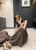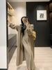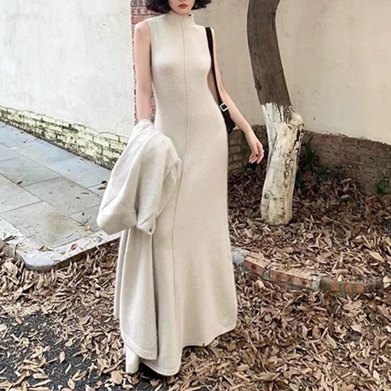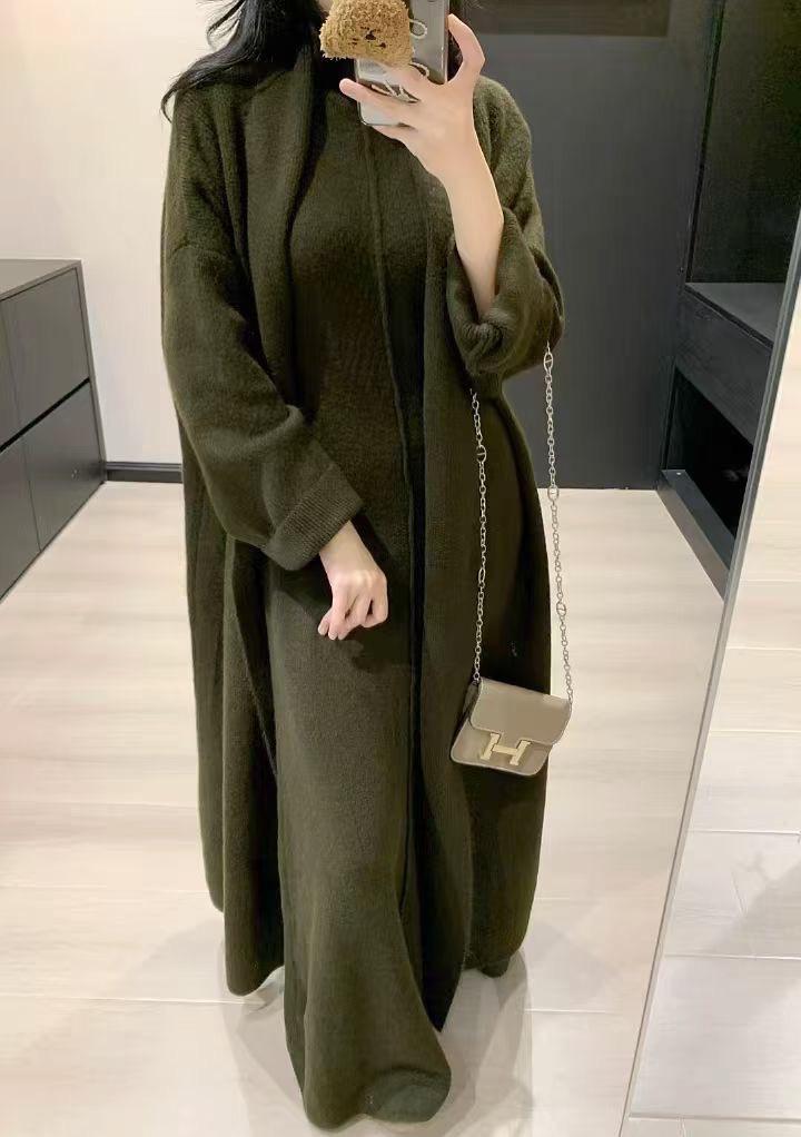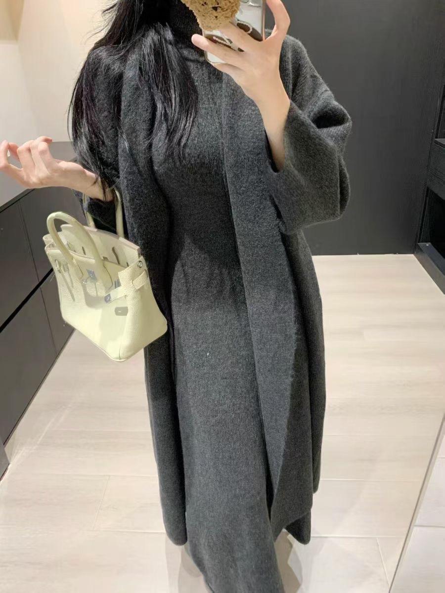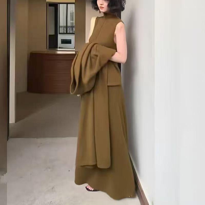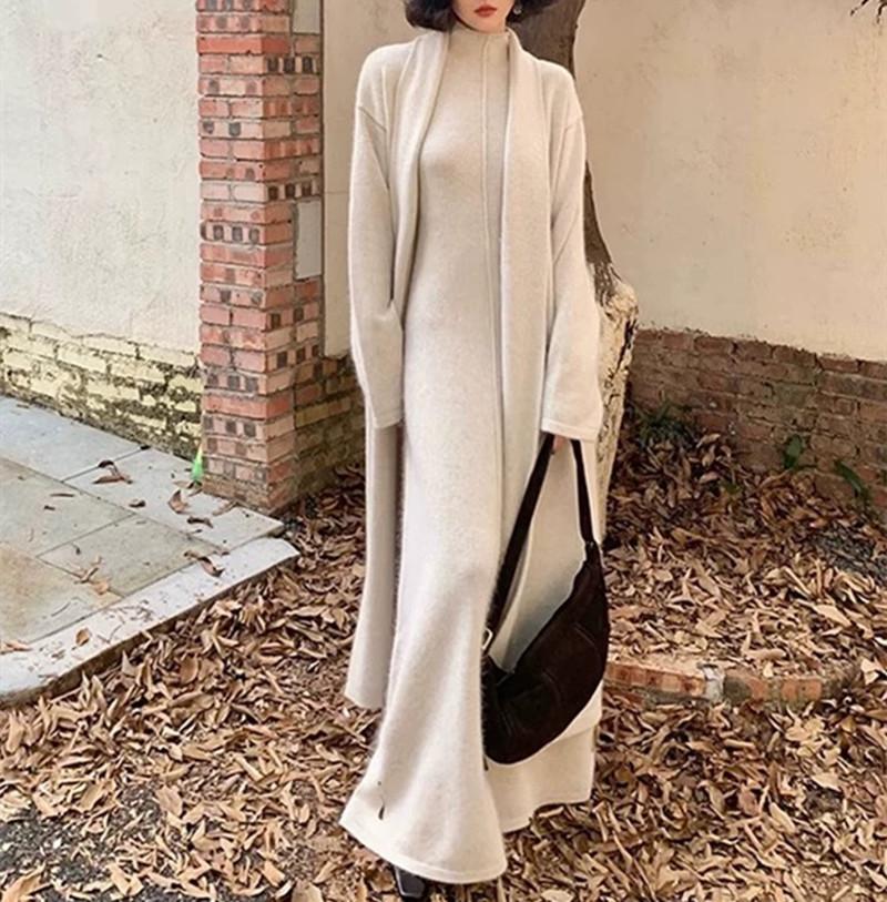Retro Francés 2025 Principios de Otoño Estilo Bata Abrigo Largo + Vestido Tejido sin Mangas Traje de Suéter de Dos Piezas