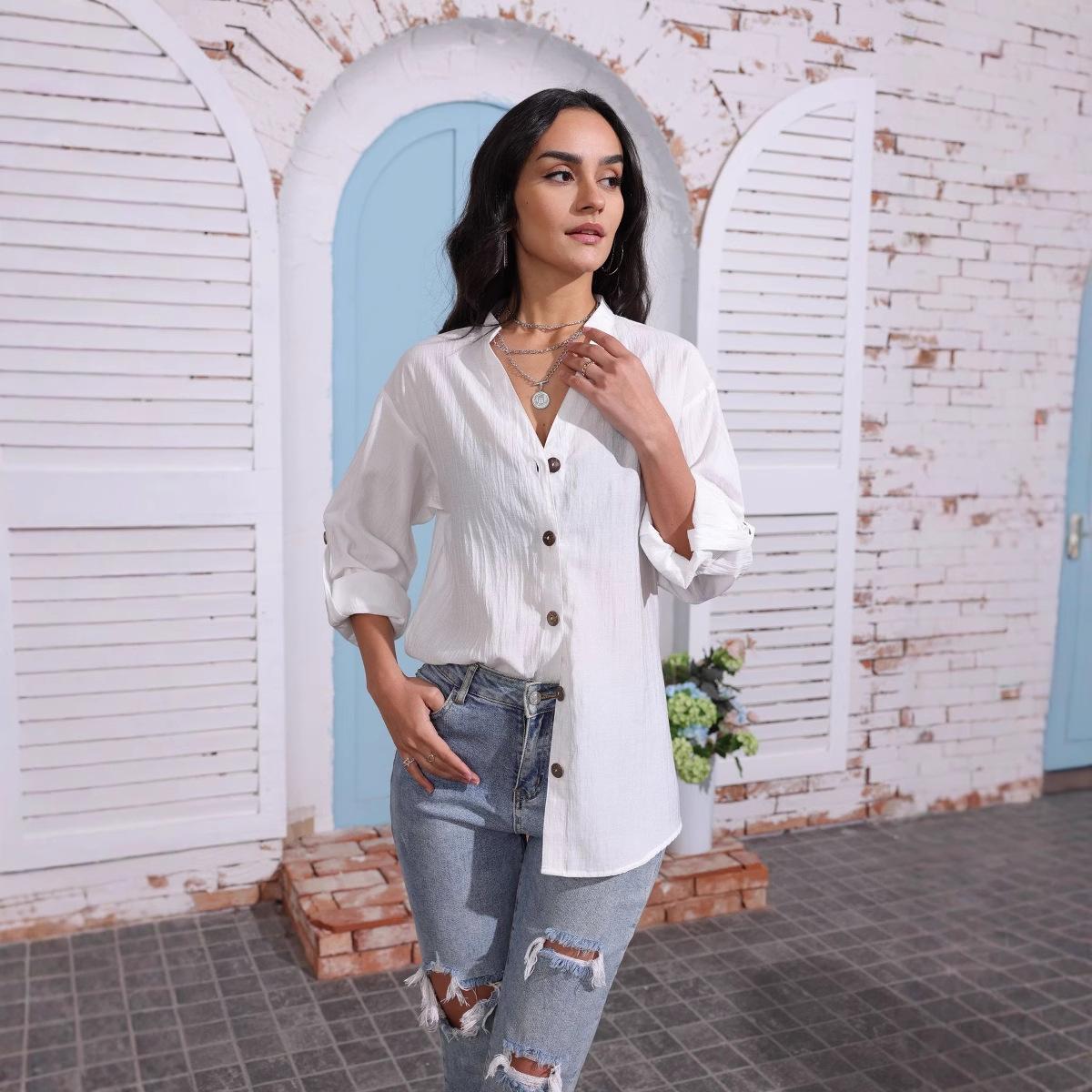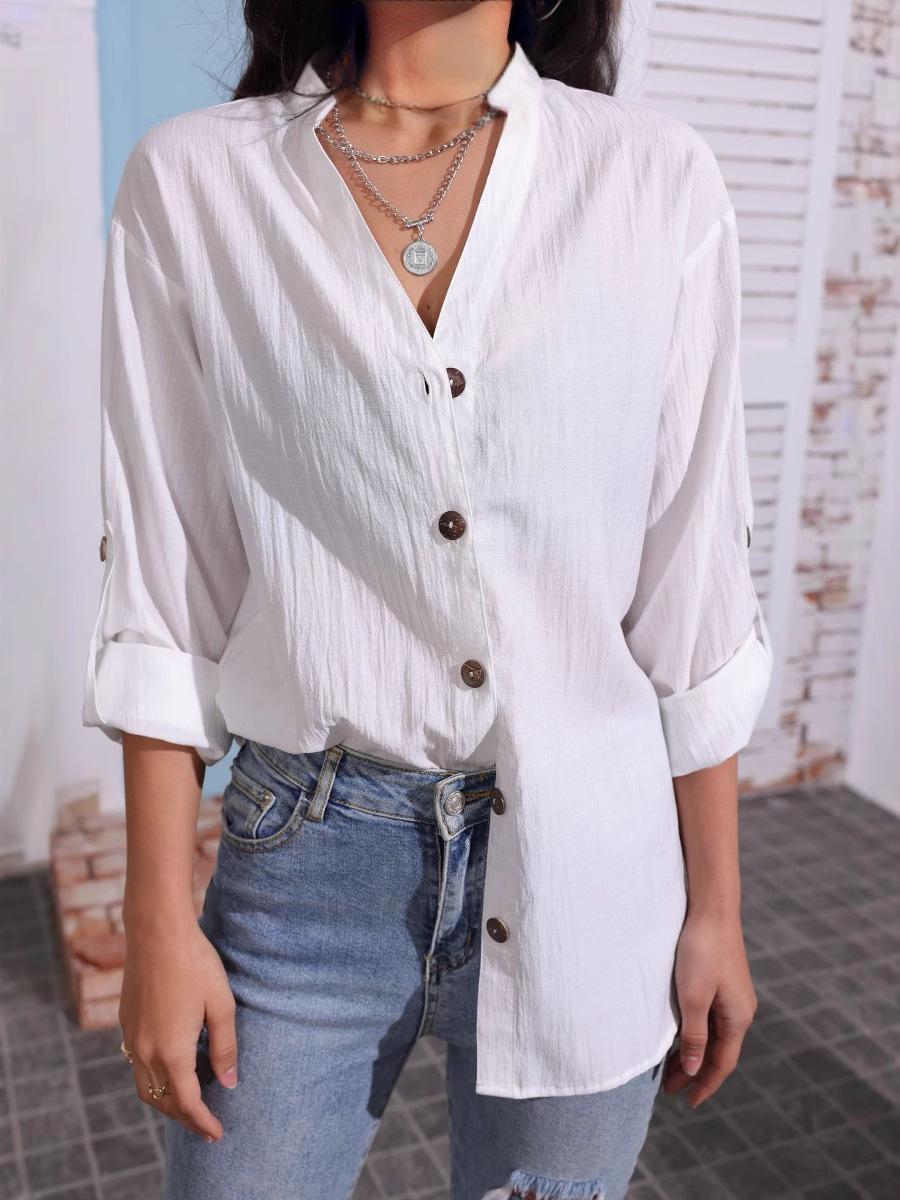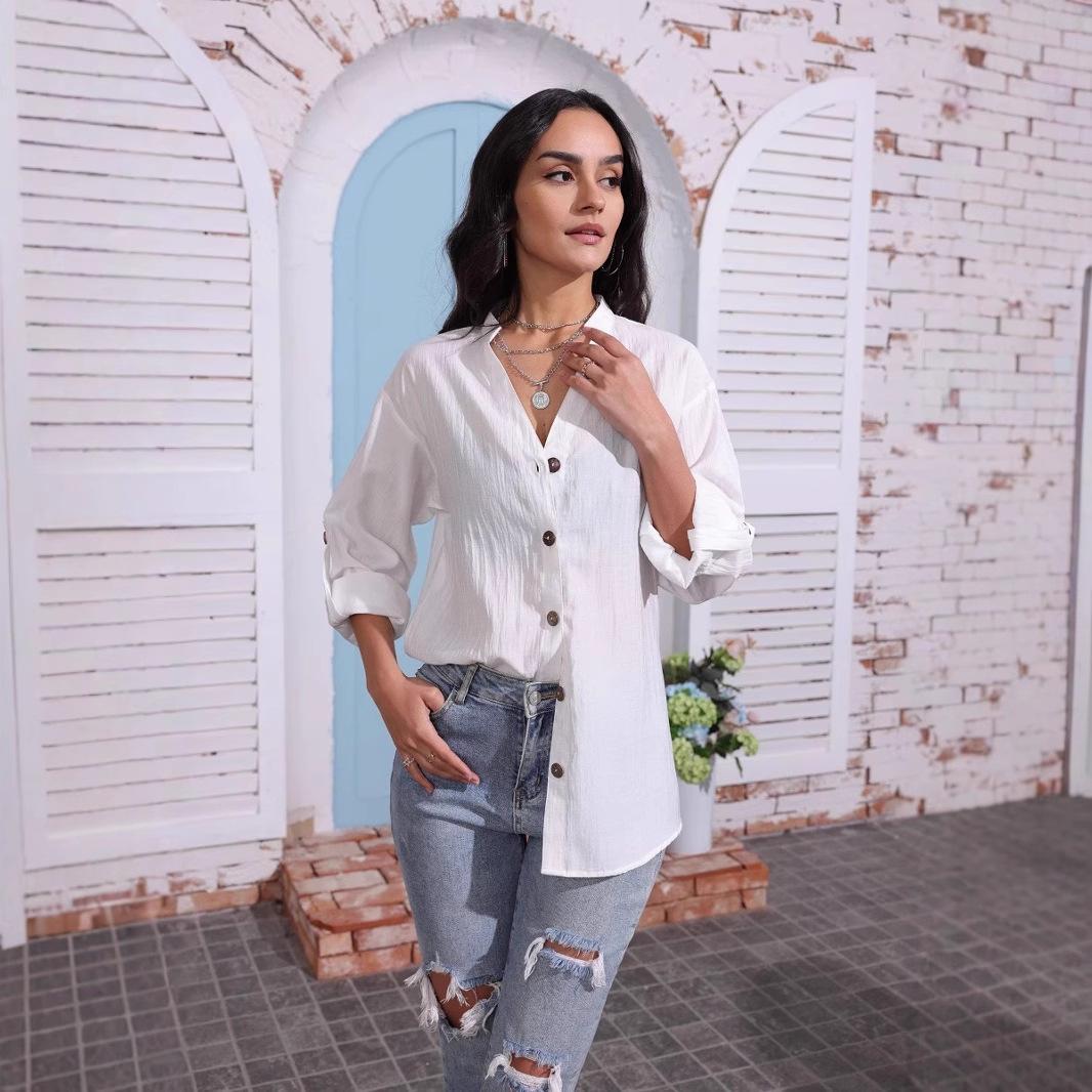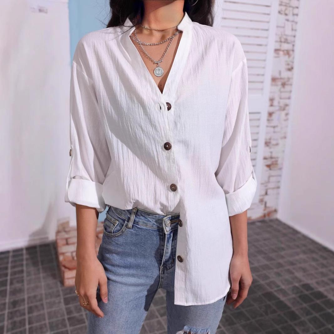 Nuevo Amazon Wish Camisa Top de Manga Larga Holgada de Color Sólido para Mujer Europea y Americana con Cuello en V y Botonadura Sencilla