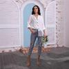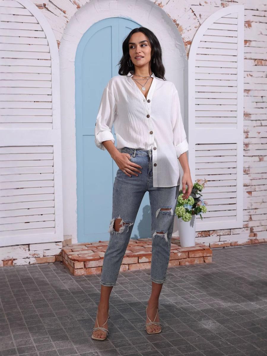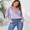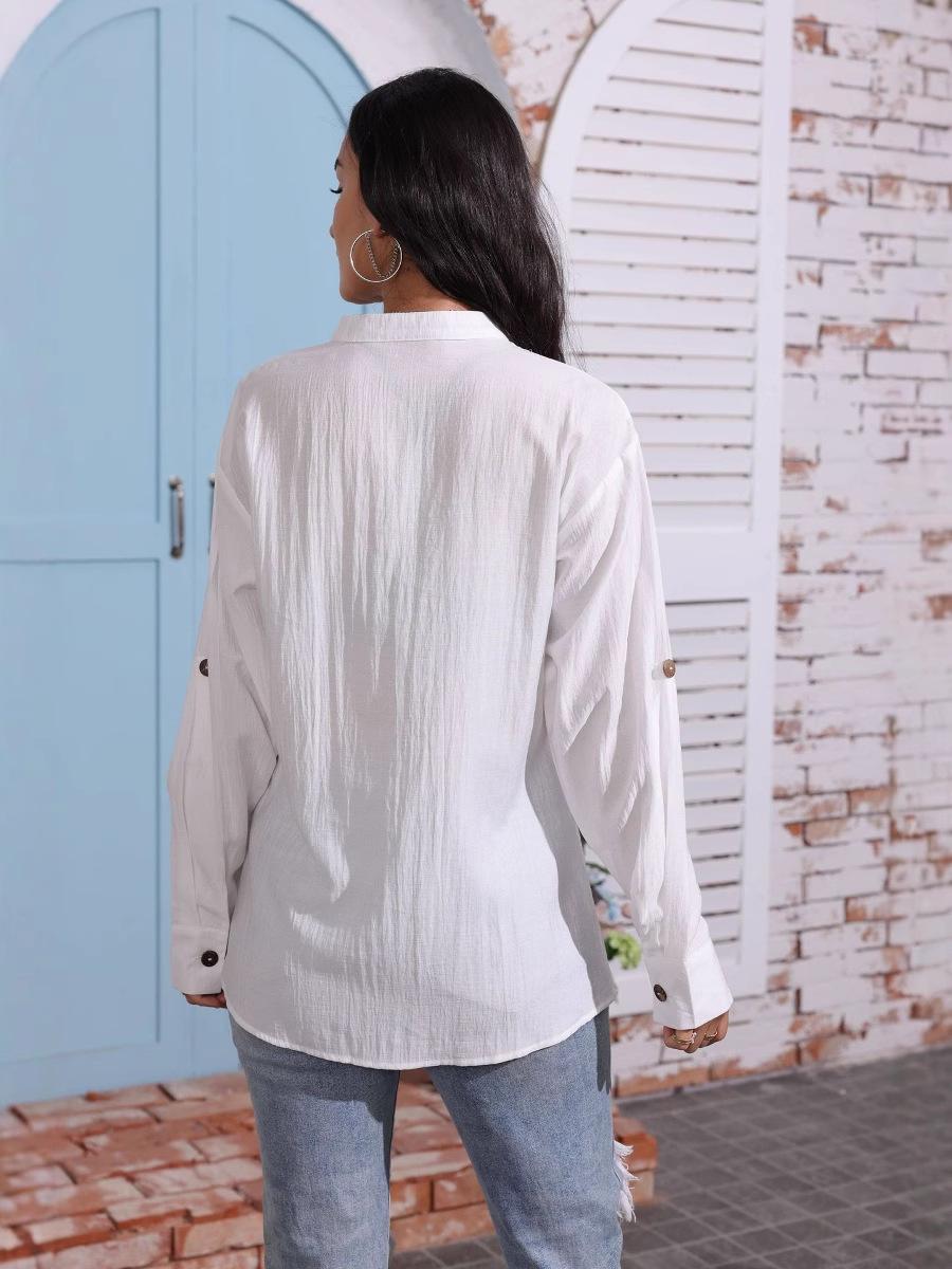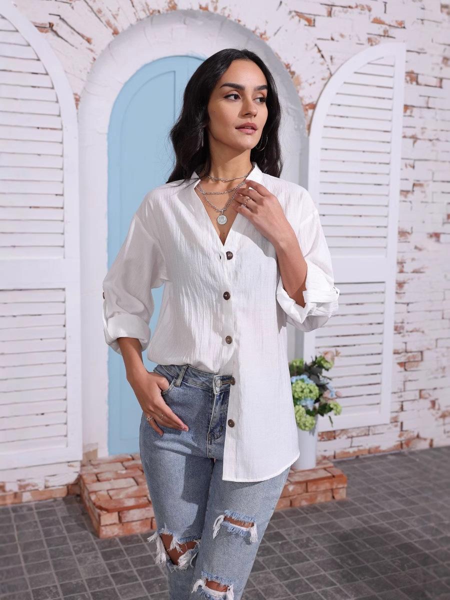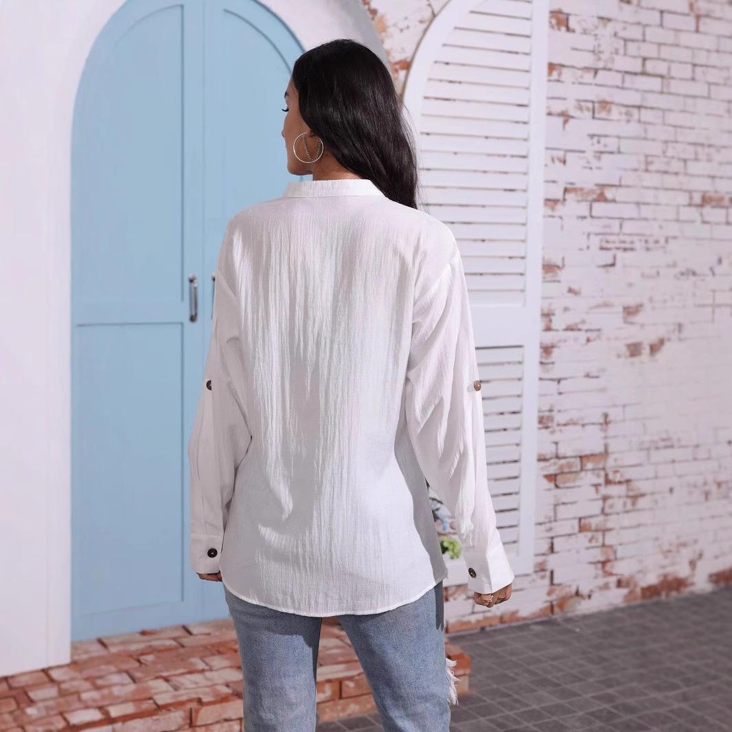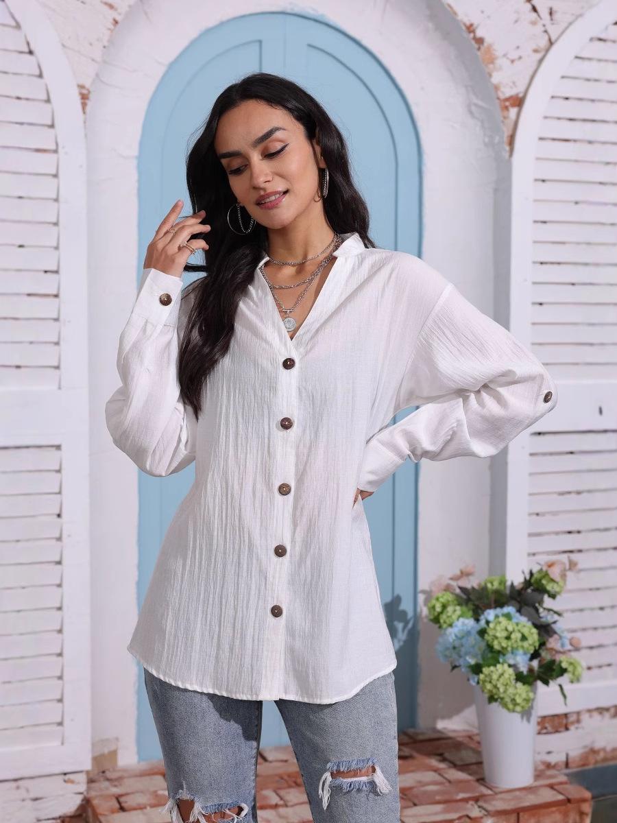Nuevo Amazon Wish Camisa Top de Manga Larga Holgada de Color Sólido para Mujer Europea y Americana con Cuello en V y Botonadura Sencilla