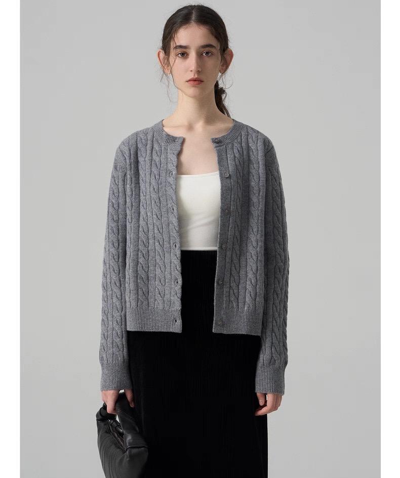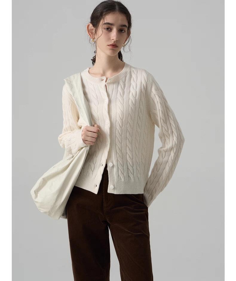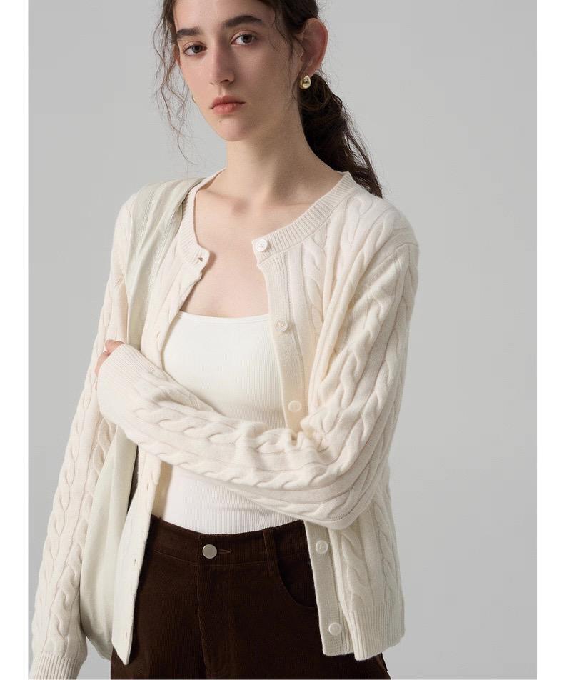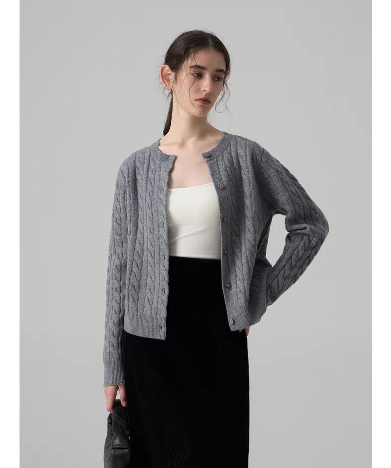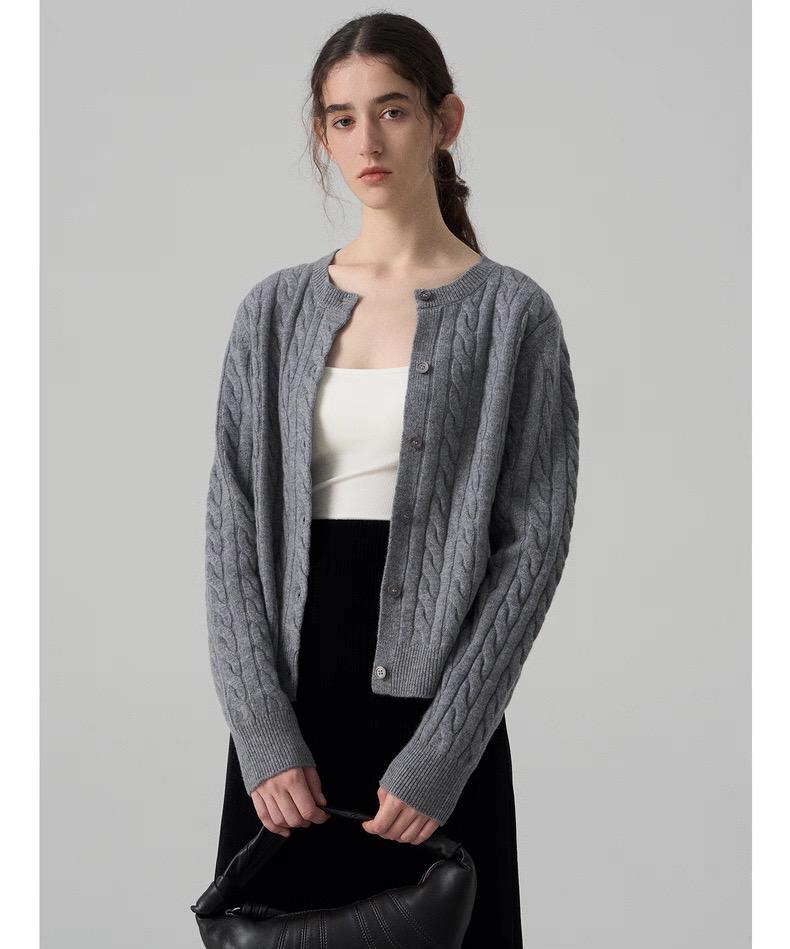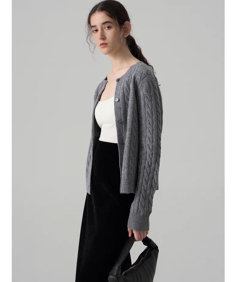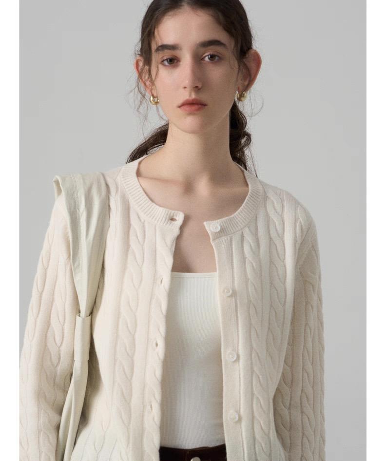 Lightweight minimalist high-IQ MIU-style crew neck cable knit wool cardigan
