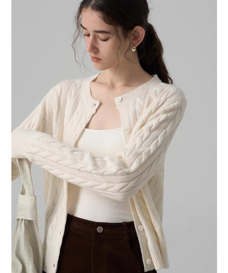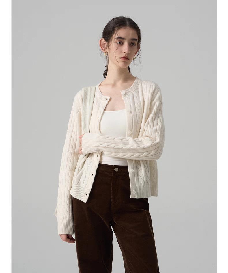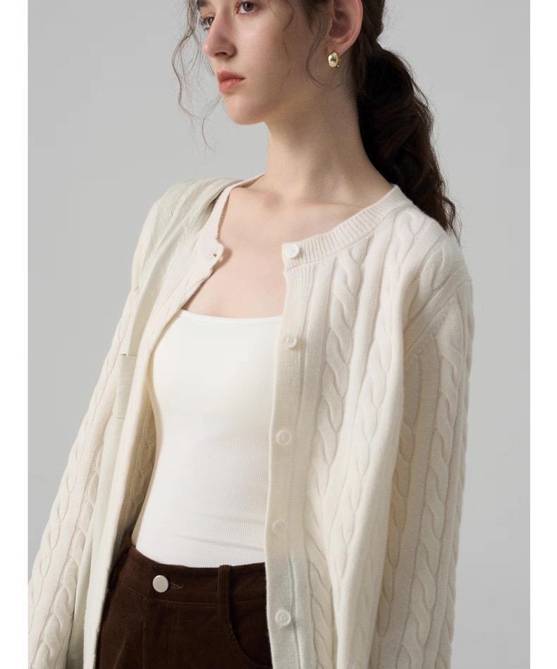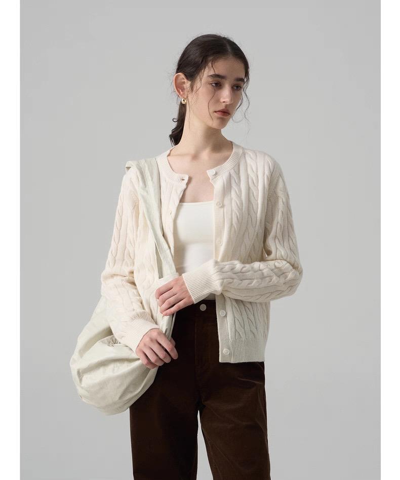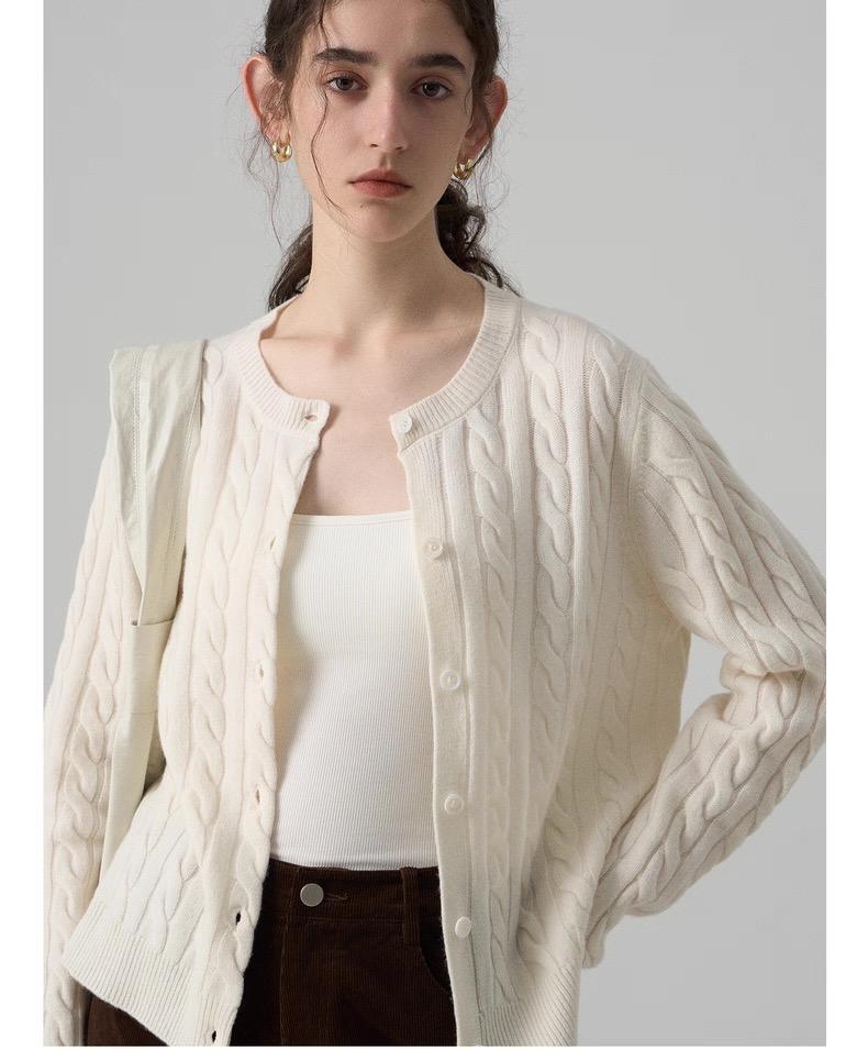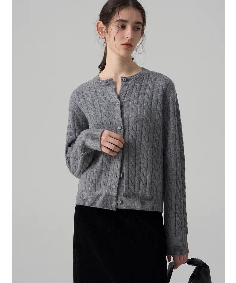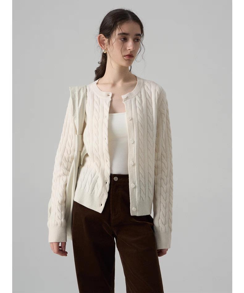 Lightweight minimalist high-IQ MIU-style crew neck cable knit wool cardigan