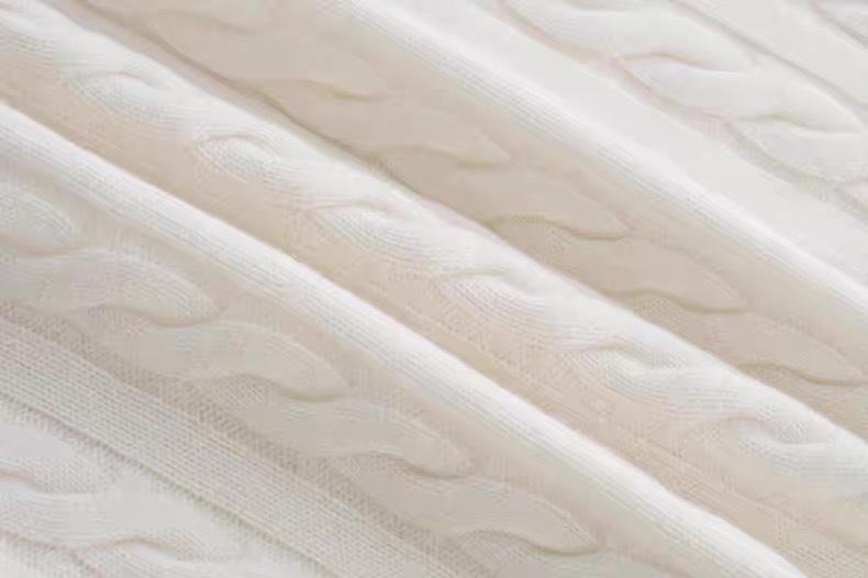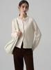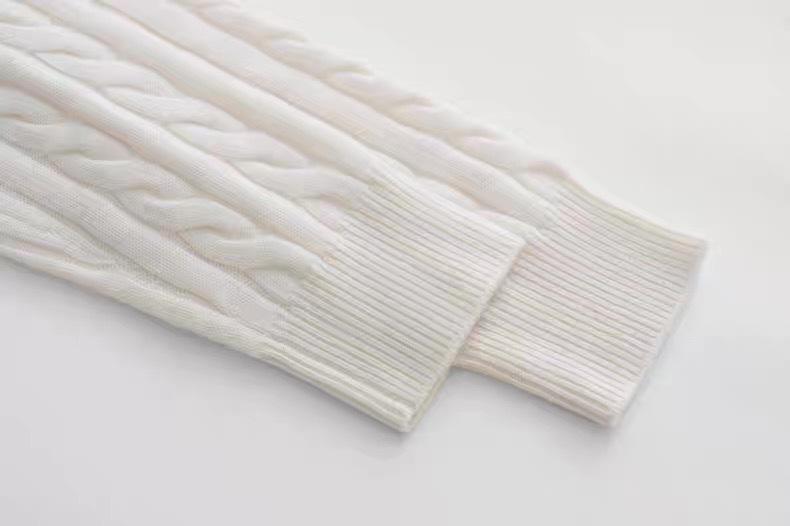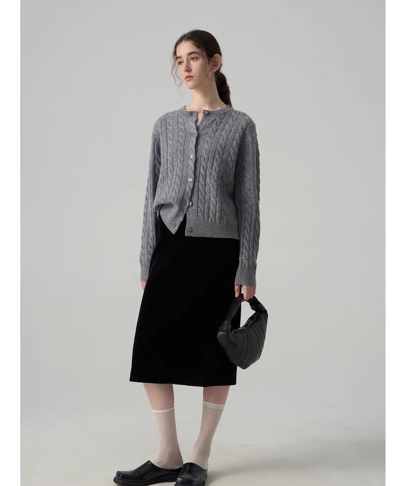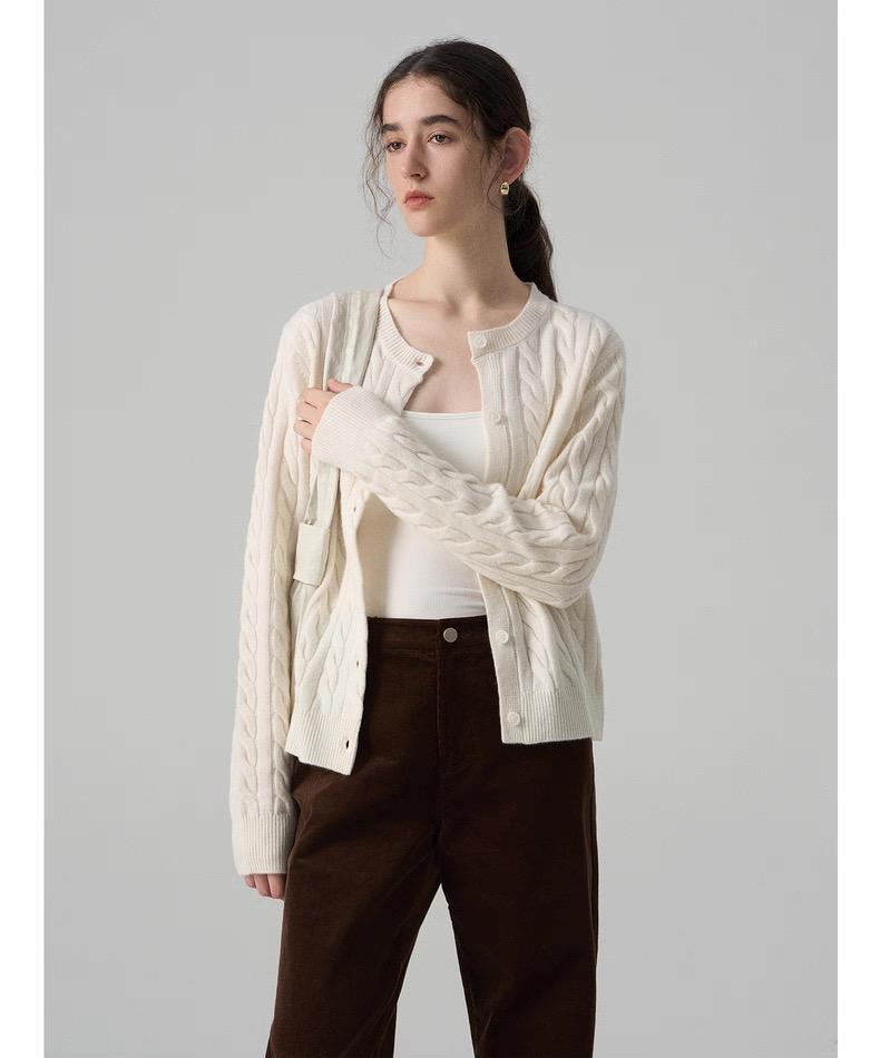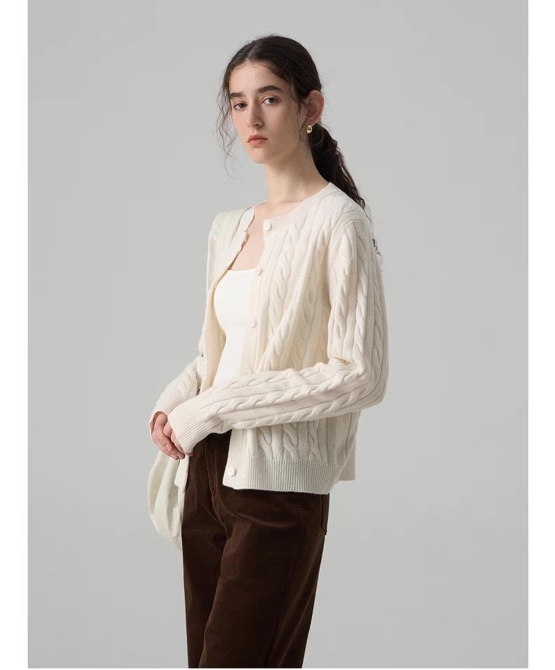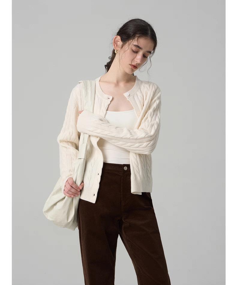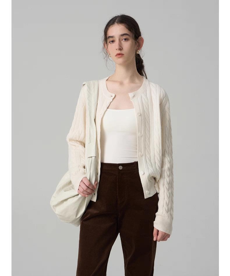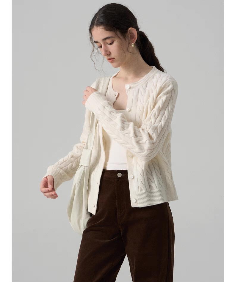 Lightweight minimalist high-IQ MIU-style crew neck cable knit wool cardigan