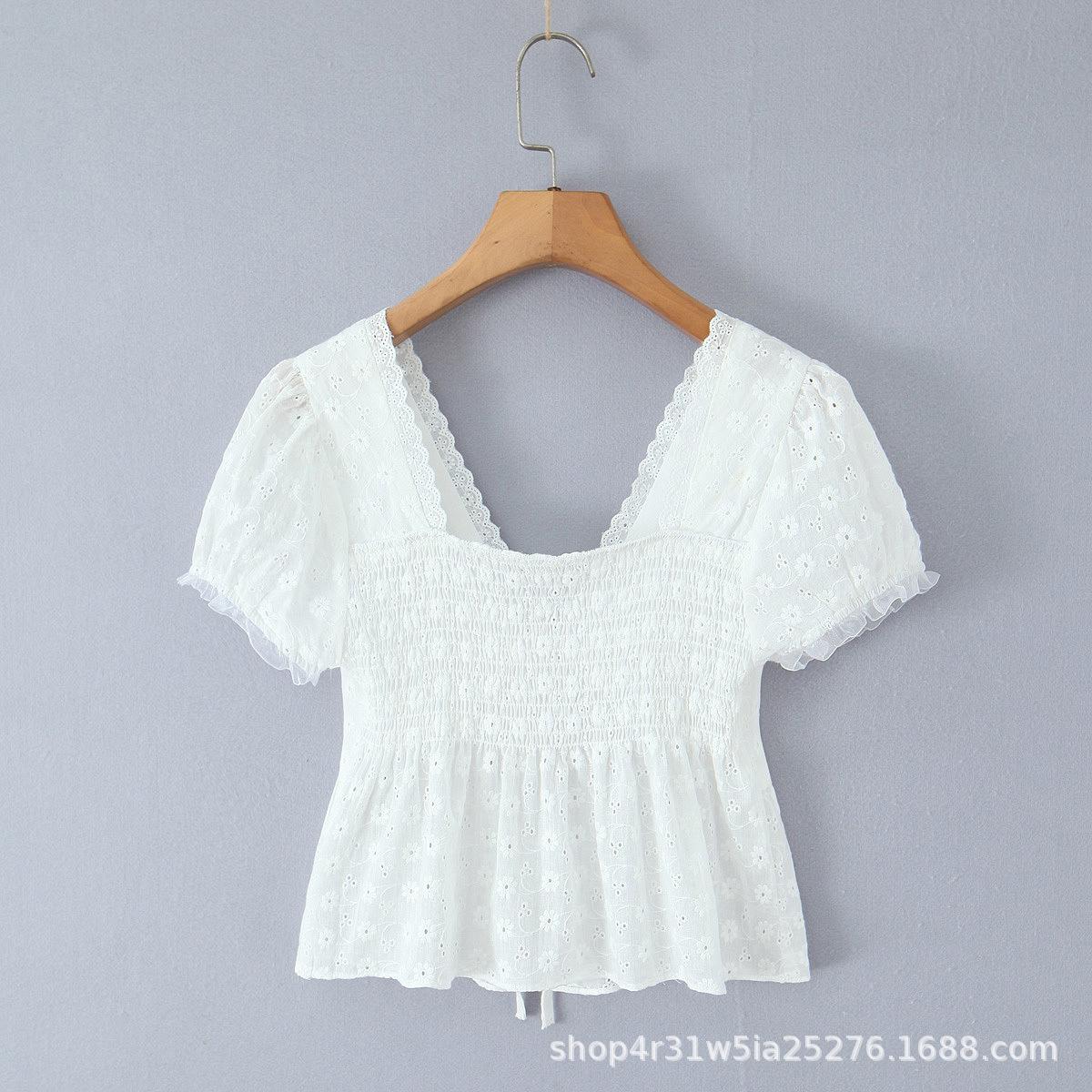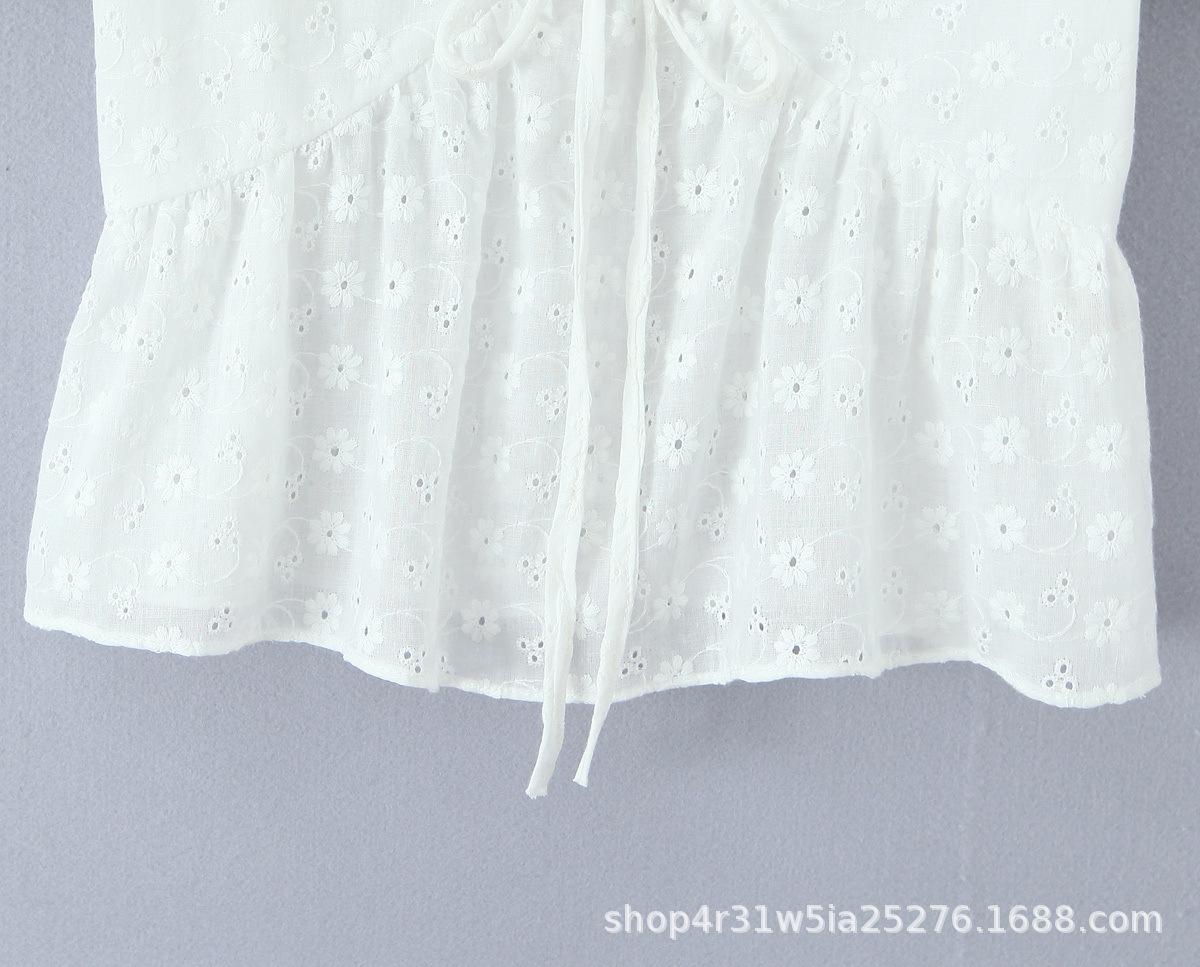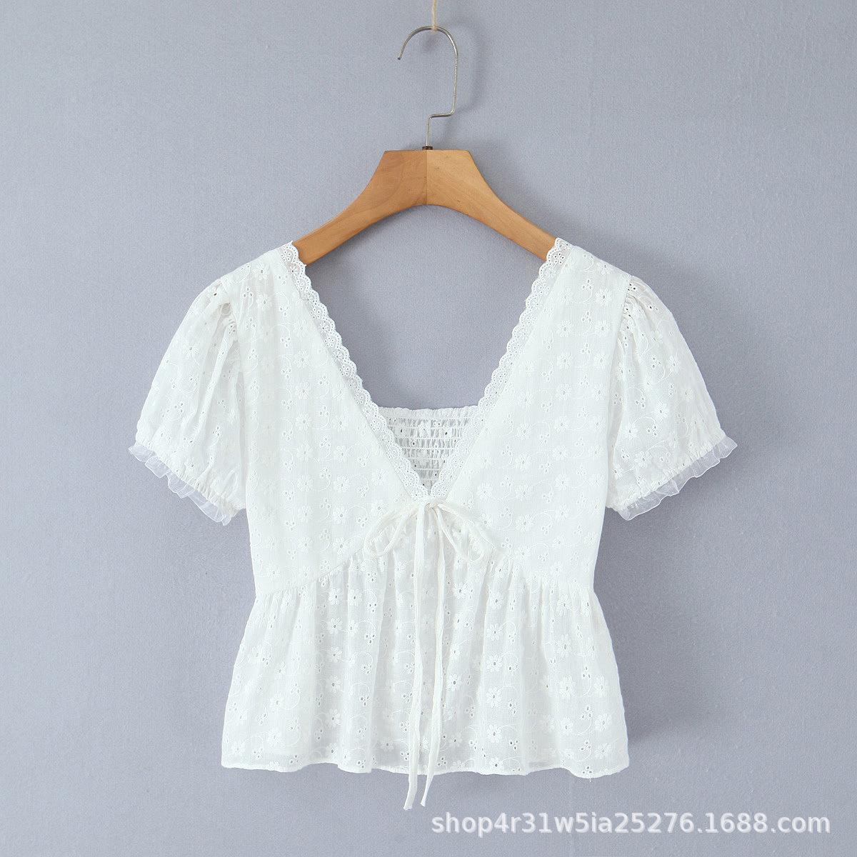 2025 Nuevo Estilo de Verano Moda Francesa Dulce y Fresco Nicho Cuello V Encaje Calado Bordado Camisa de Manga Corta Top
