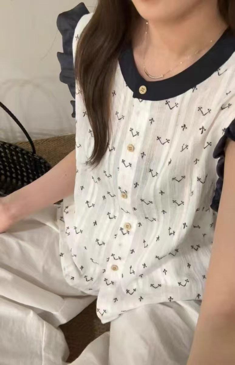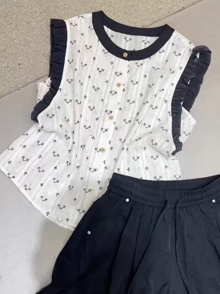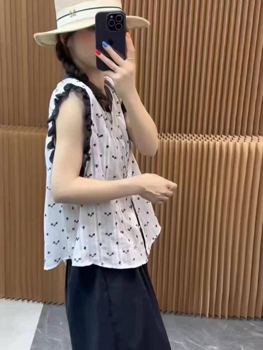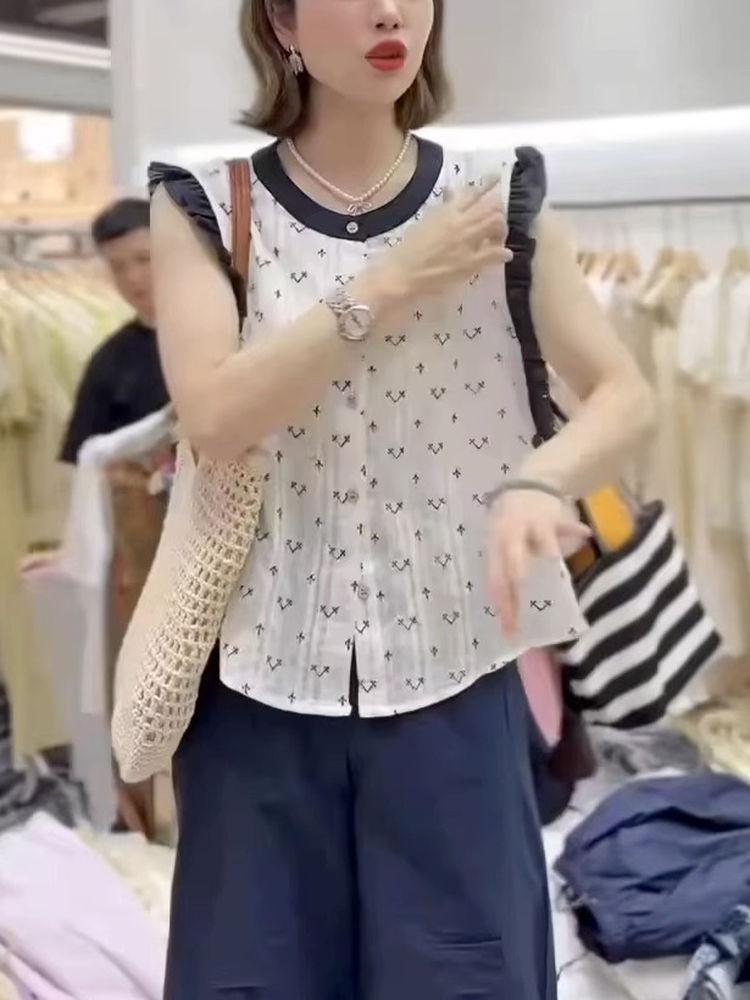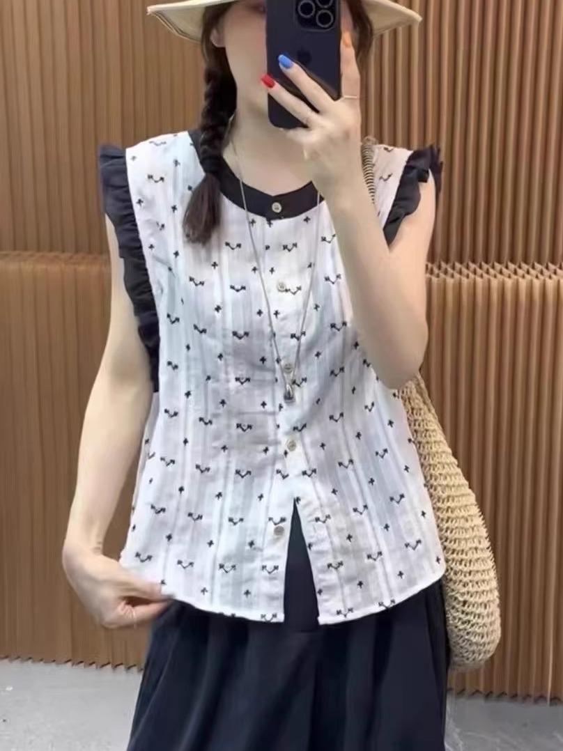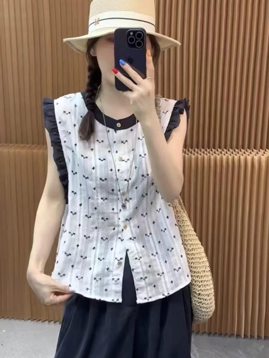 Camisa sin mangas con volantes y bloques de color nicho estilo coreano para mujer 2025 Verano Nueva Blusa dulce Reductora de edad Camisa babydoll