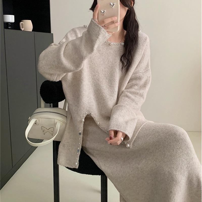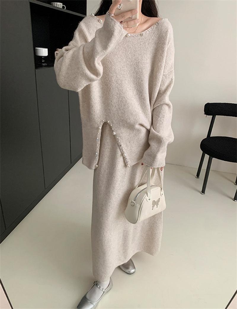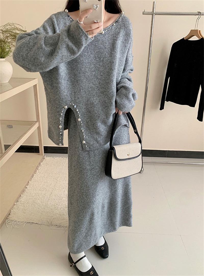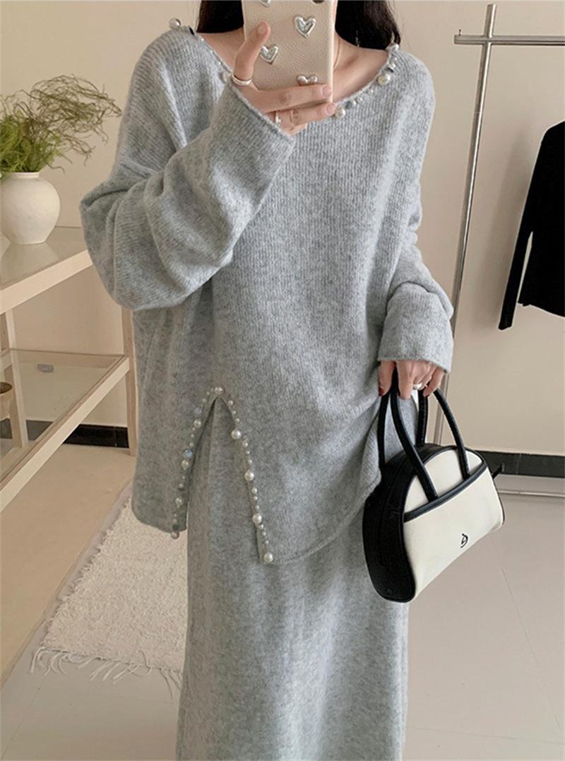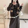 Conjunto de Punto Moderno y Rejuvenecedor Otoño e Invierno Nuevo Cárdigan Suéter Holgado con Cuentas a Mano Falda Midi de Gran Vuelo Conjunto de Dos Piezas