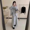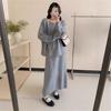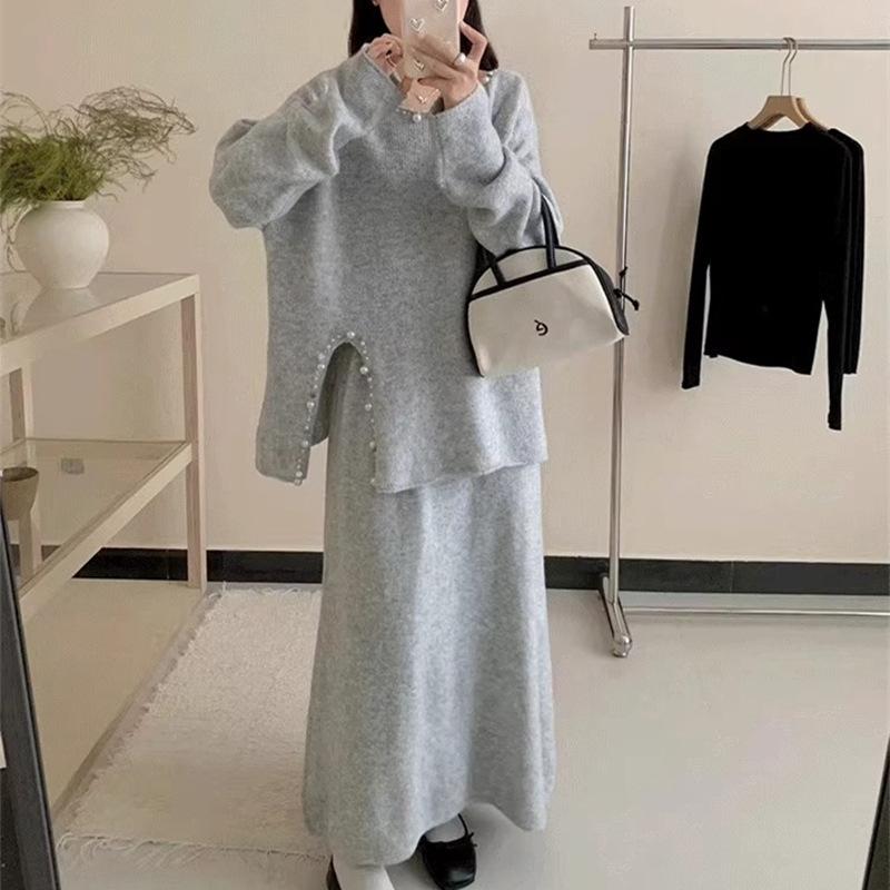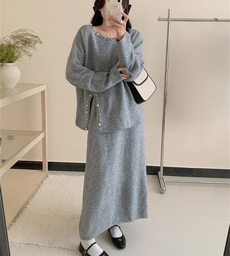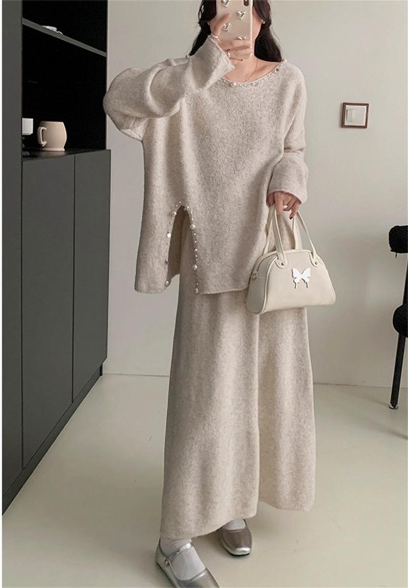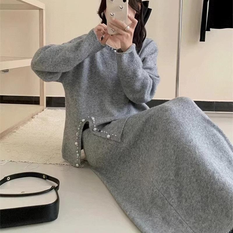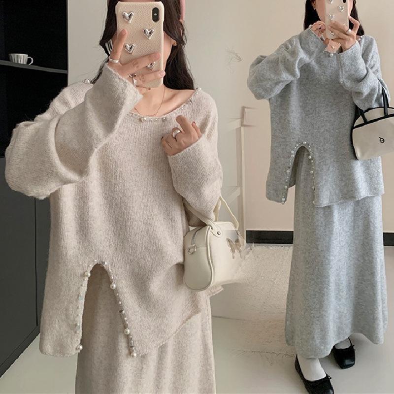Conjunto de Punto Moderno y Rejuvenecedor Otoño e Invierno Nuevo Cárdigan Suéter Holgado con Cuentas a Mano Falda Midi de Gran Vuelo Conjunto de Dos Piezas