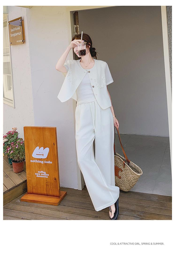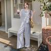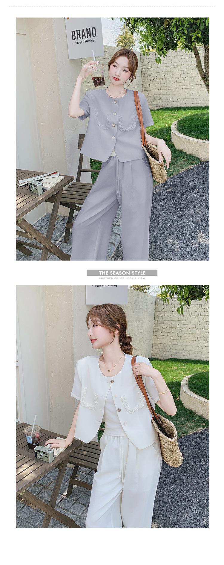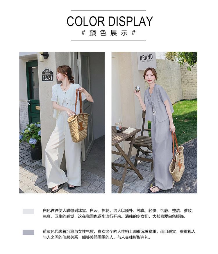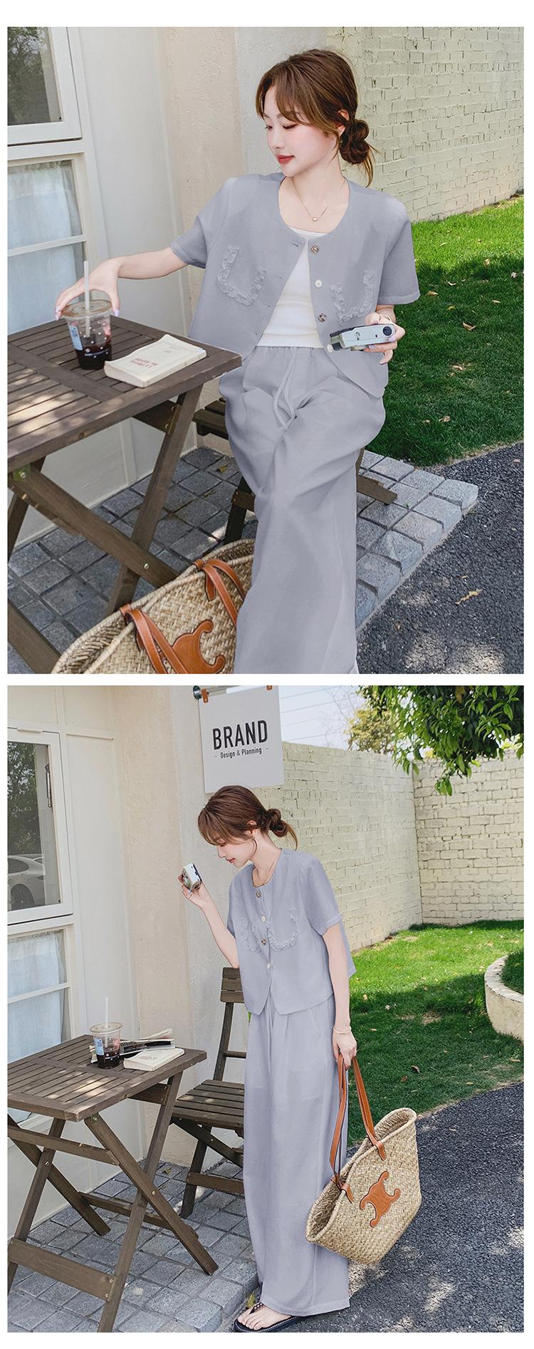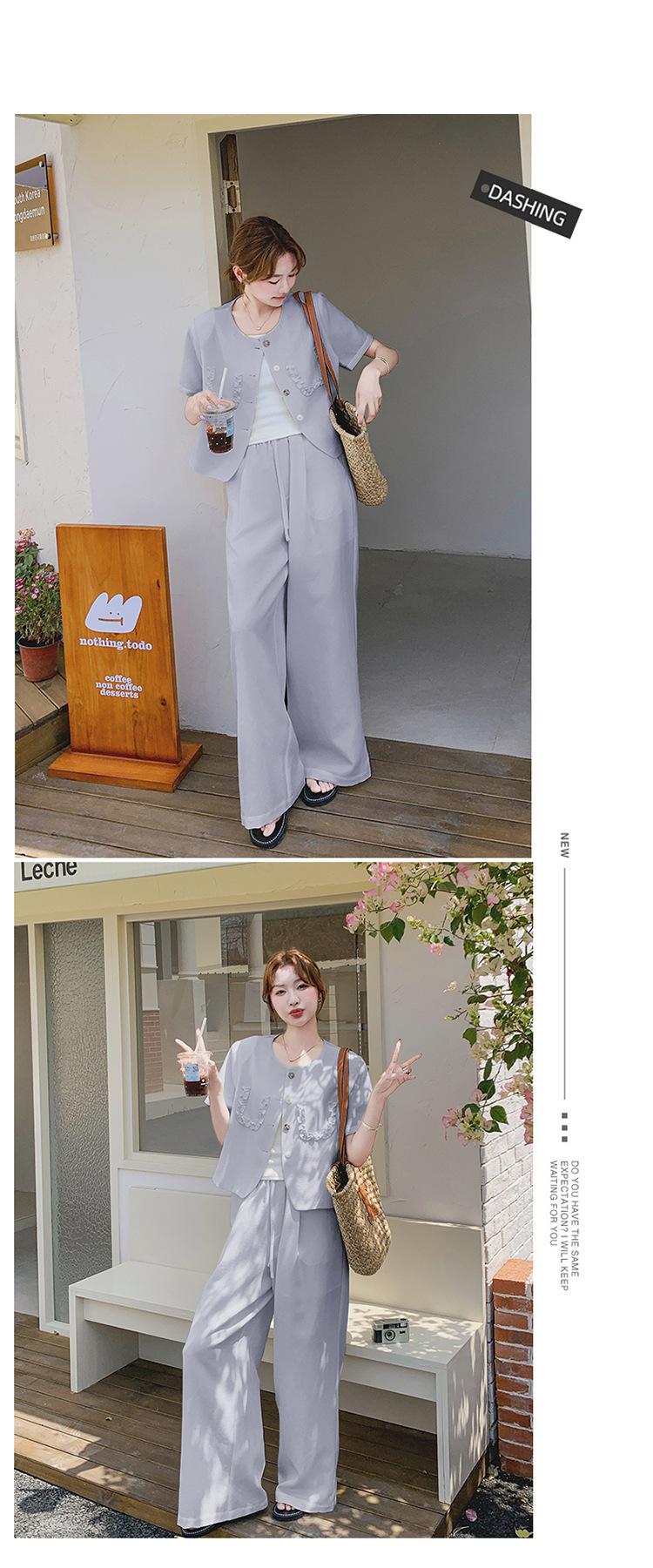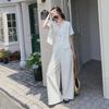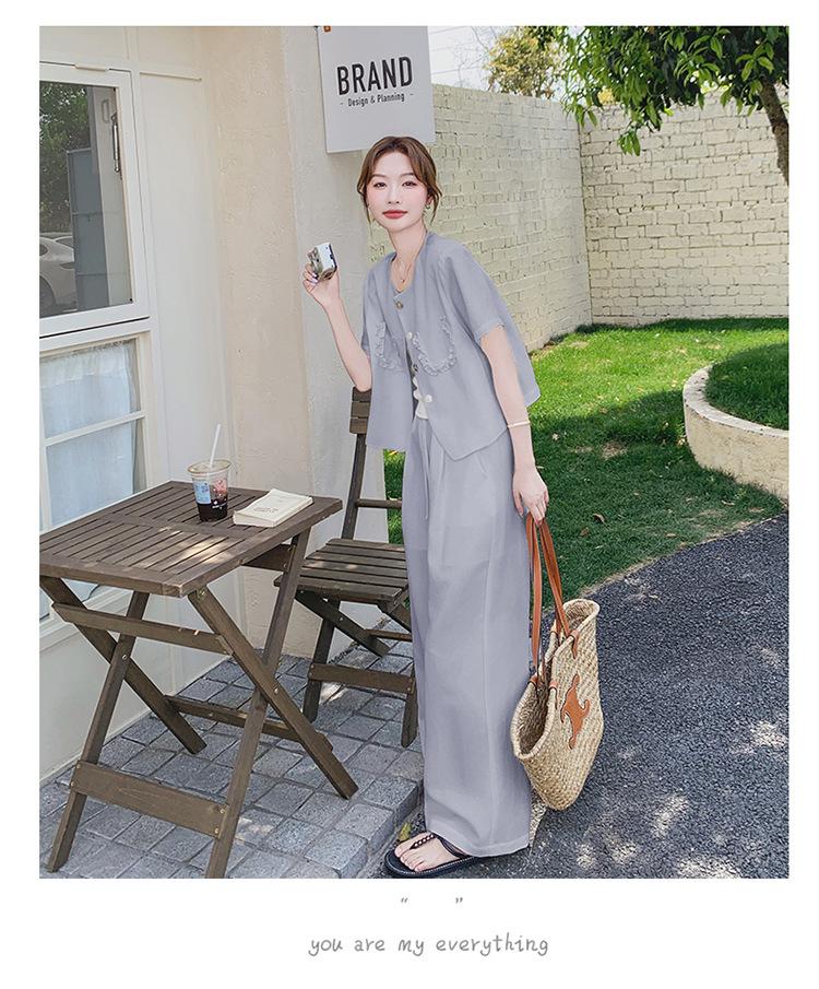 2025 Nuevo Verano Moda Casual Versátil Reductor de Edad Elegante Gris Cuello en V Manga Corta Top Pantalón de Pierna Ancha Traje