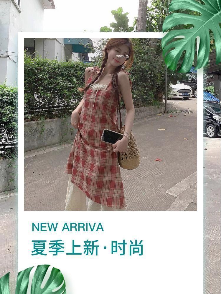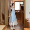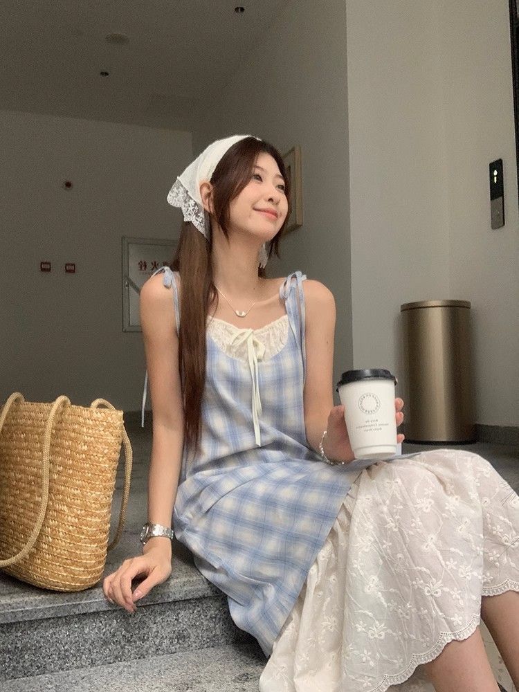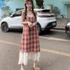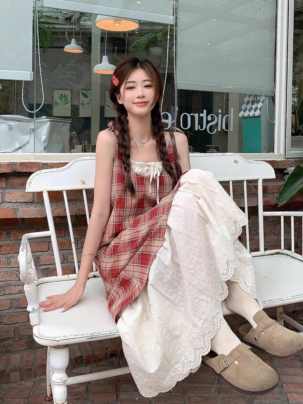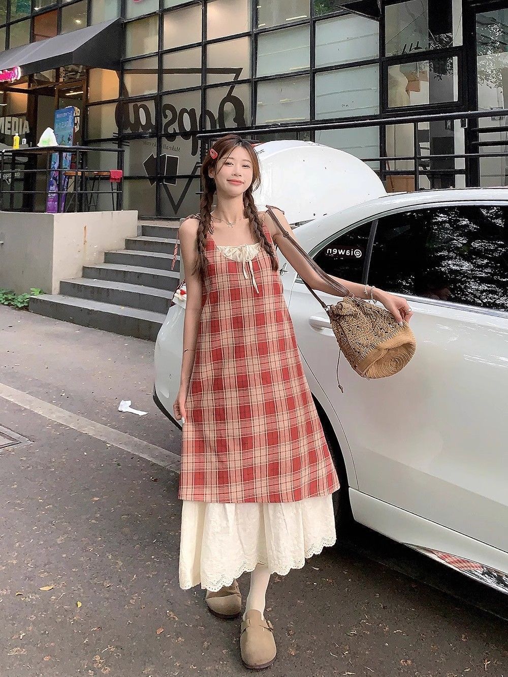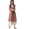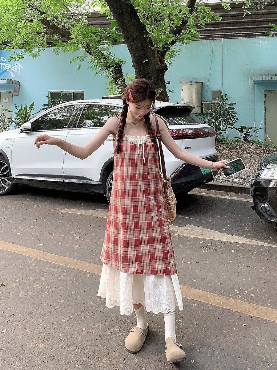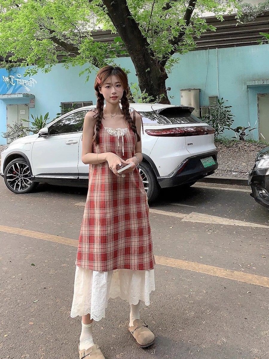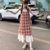 Vestido Largo Vacacional Súper Bonito de Verano Dulce Nuevo Rojo a Cuadros de Encaje Retro de Dos Piezas Falsas con Tirantes