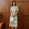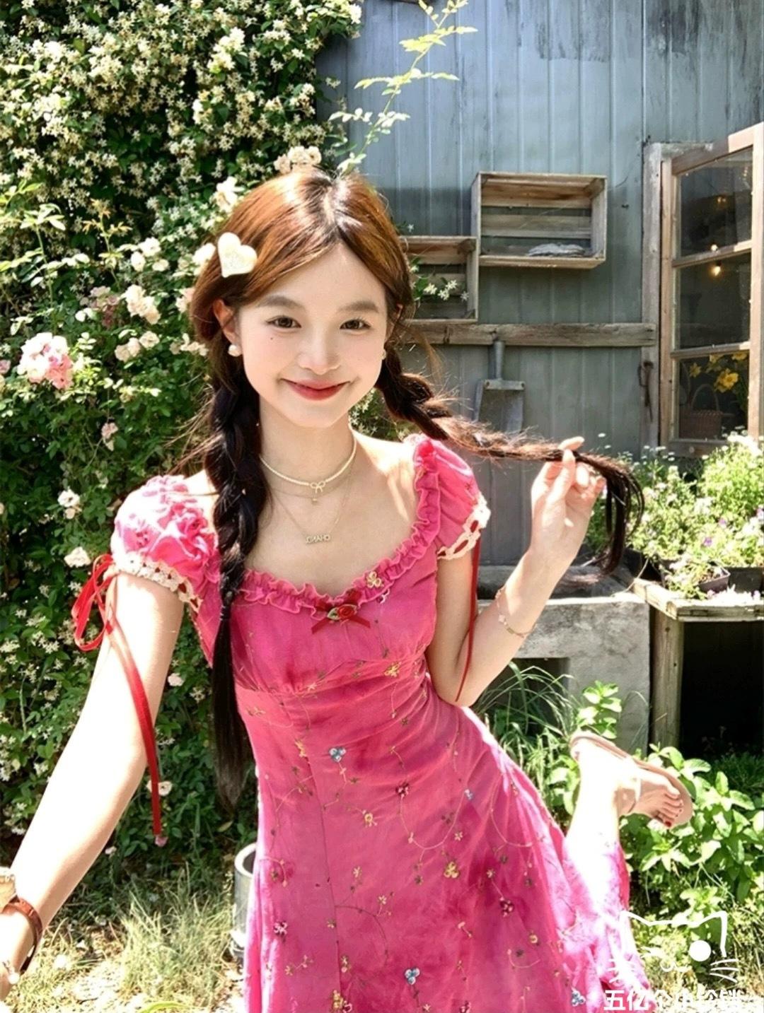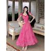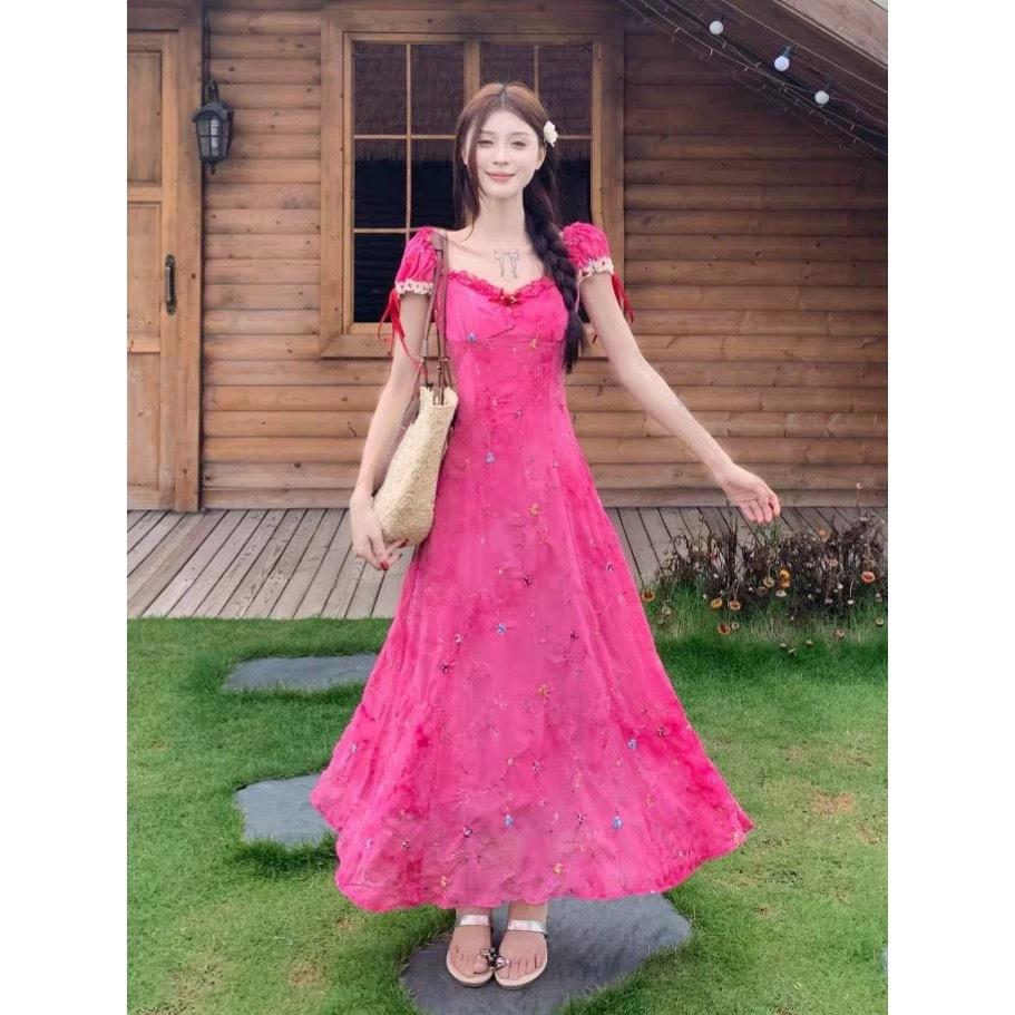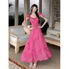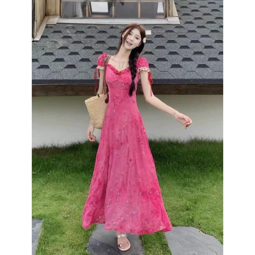2025 Nuevo Vestido Floral de Lujo Ligero de Alta Gama para Adelgazar la Cintura Rojo Rosa es Particularmente Hermoso Vestido Ceñido a la Cintura Verano Mujer