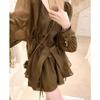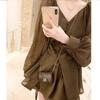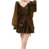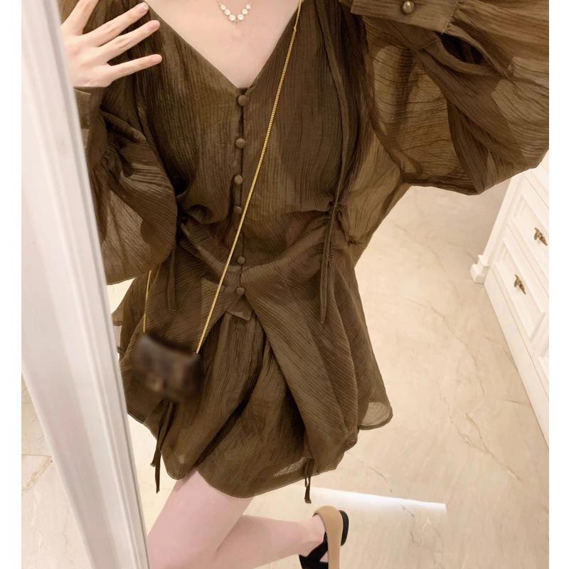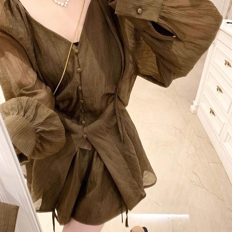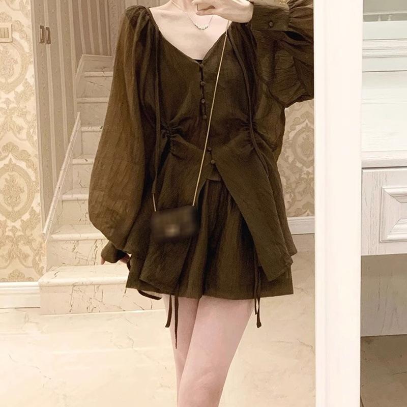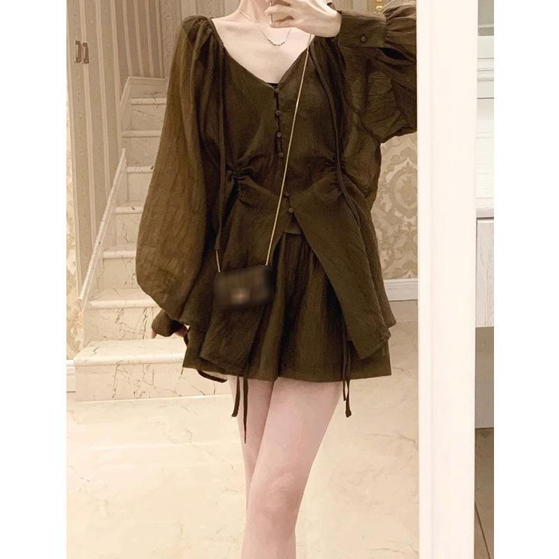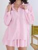 Diseño de Ropa de Verano para Mujer 2025 Retro Cuello en V Suelto Camisa de Manga Larga Top + Shorts Traje de Dos Piezas
