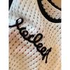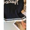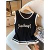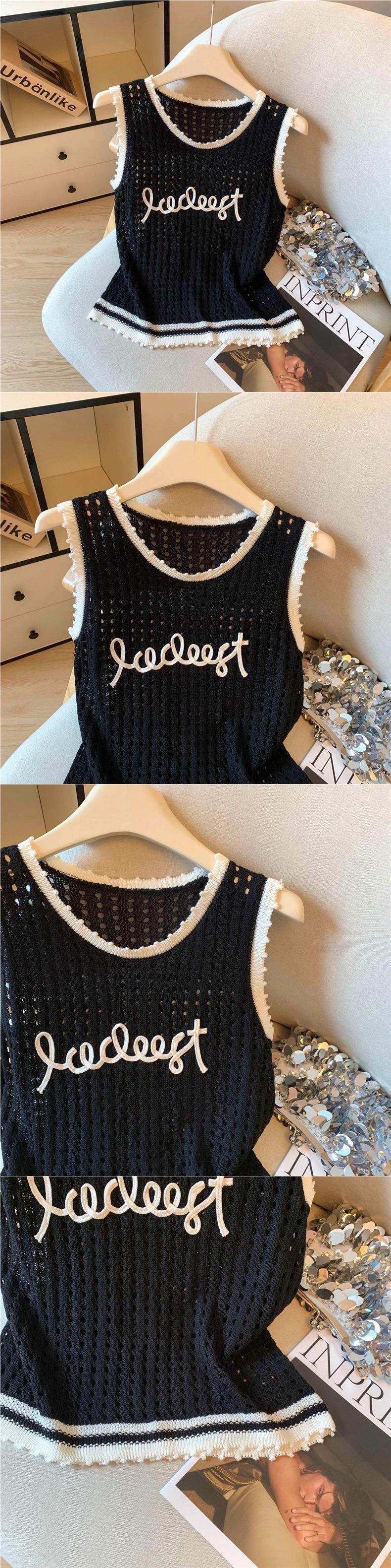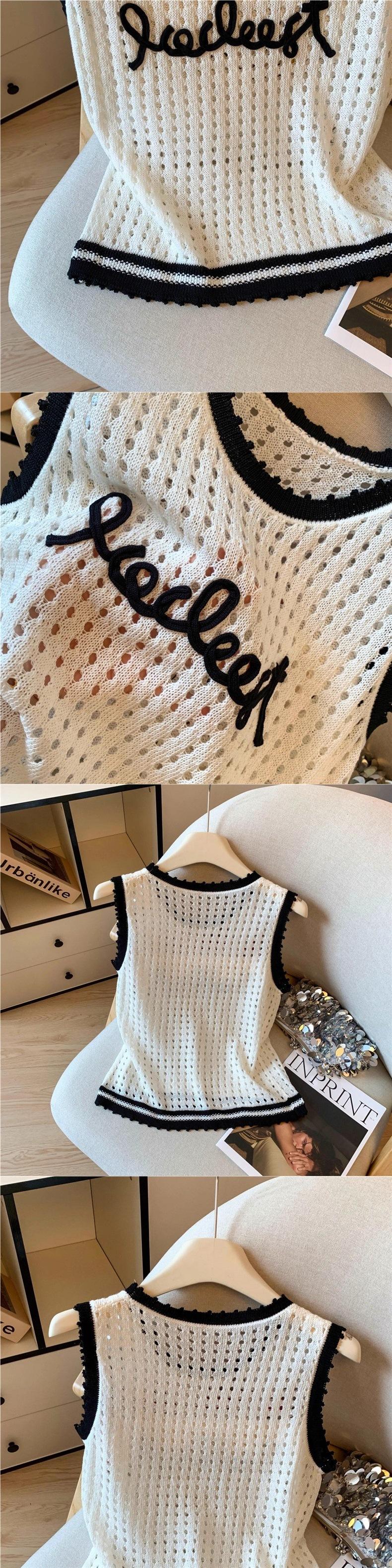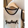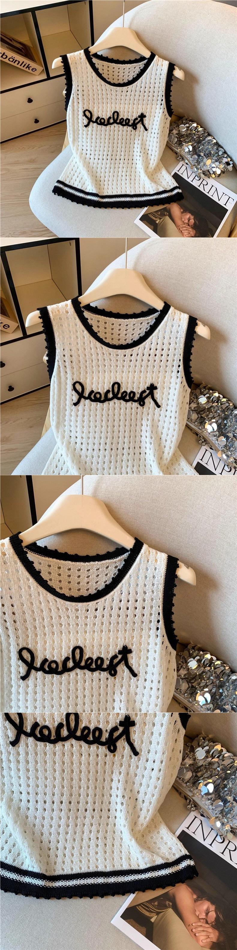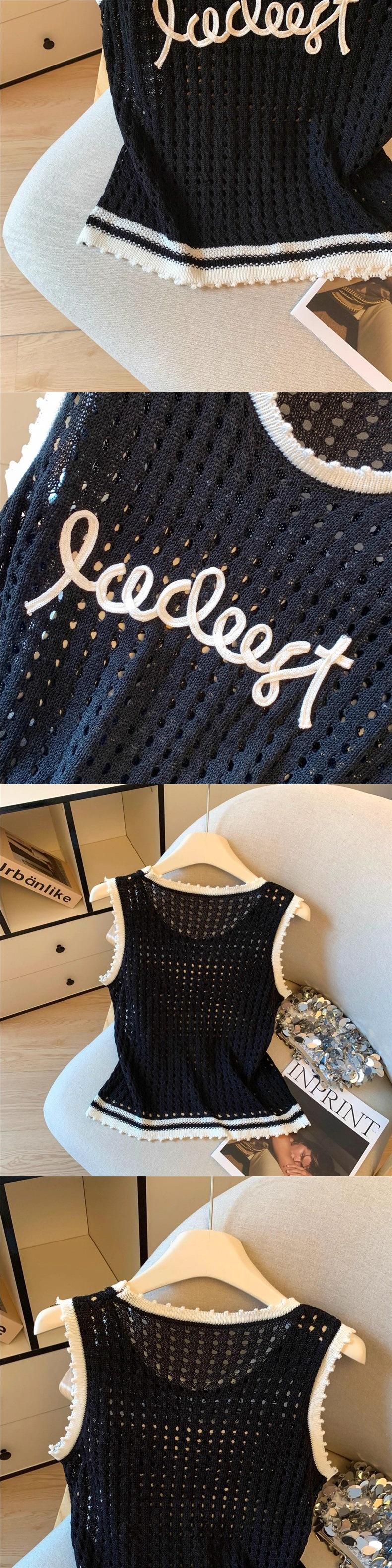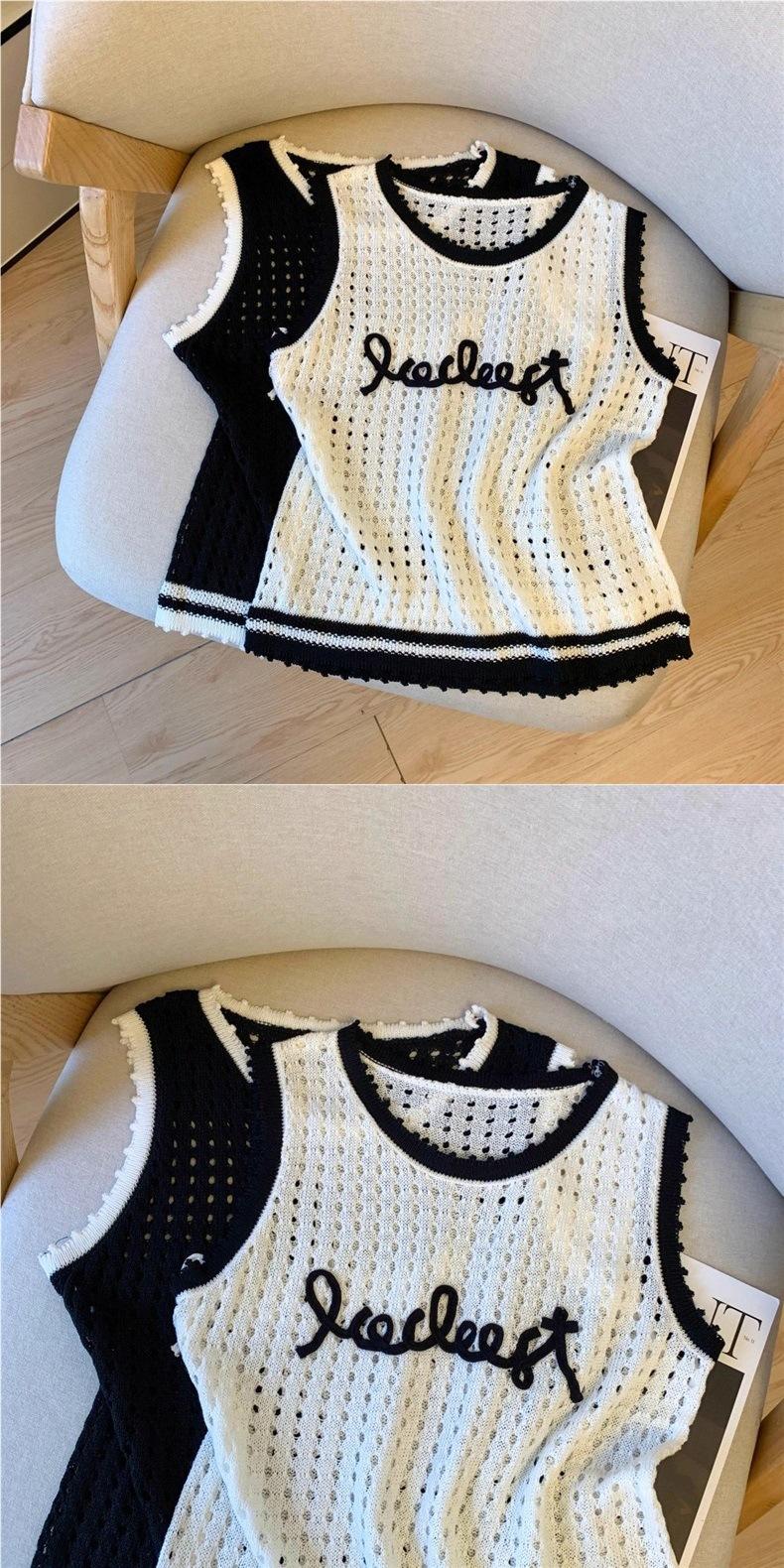 7085# Sentido del Diseño Coreano Manga Corta Bloque de Color Recorte Letra Chaleco de Punto para Mujer Primavera/Verano Nueva Moda Suelto