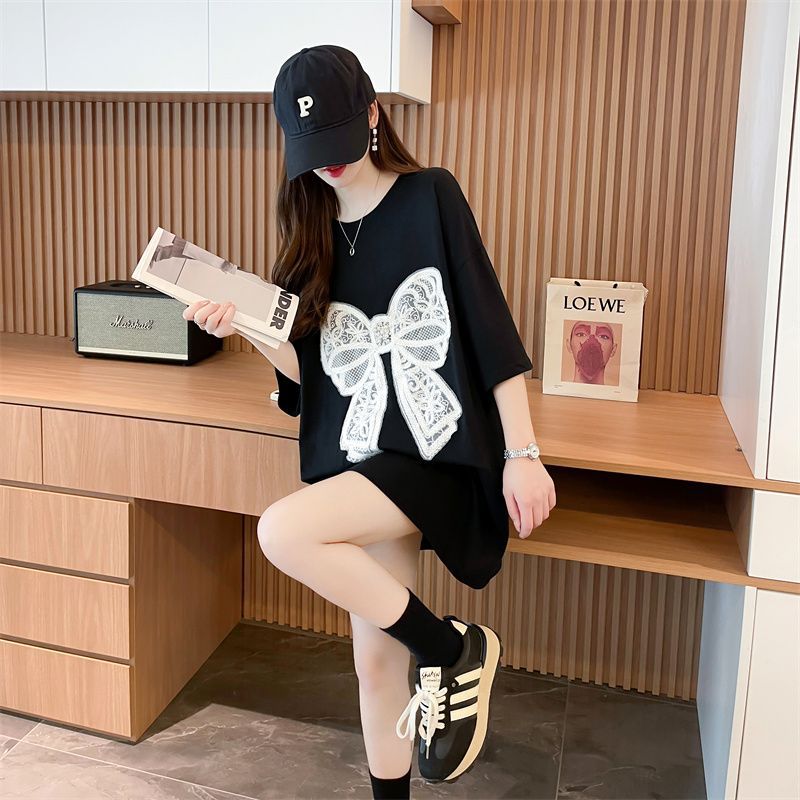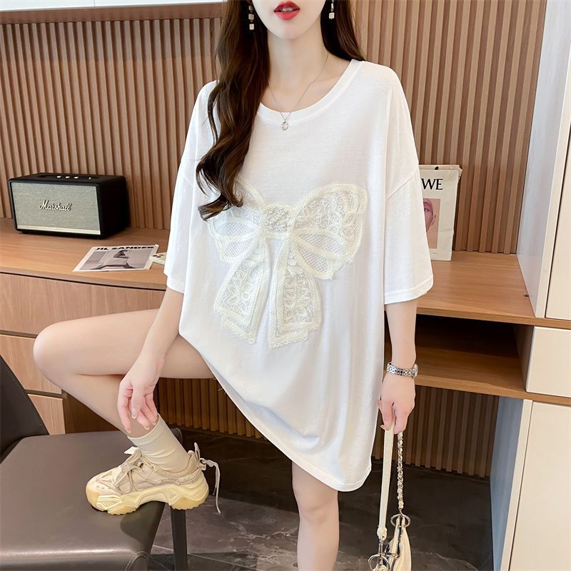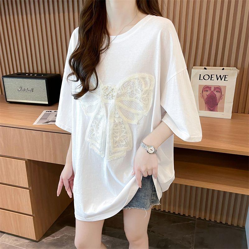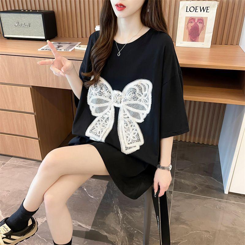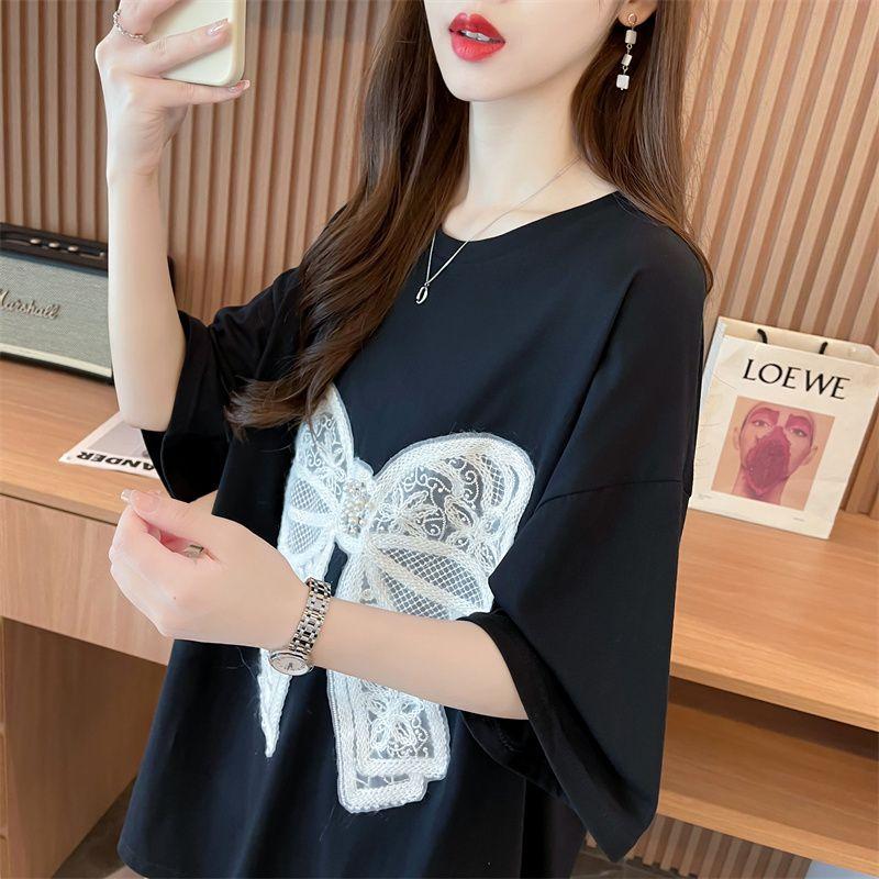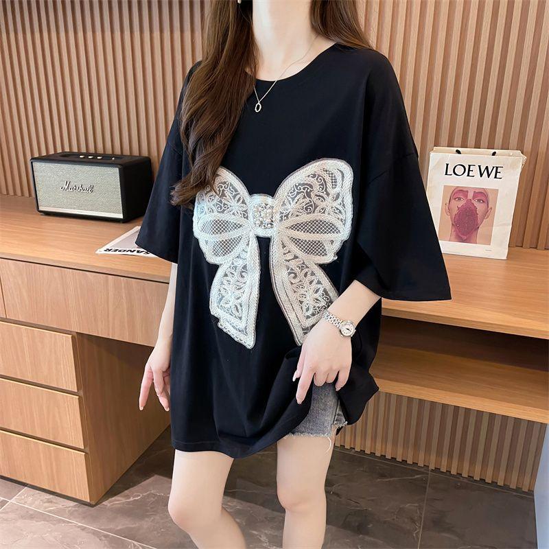 Camiseta de manga corta con lazo bordado verano 2025 nuevo diseño nicho de alta gama holgada manga media top que cubre la carne