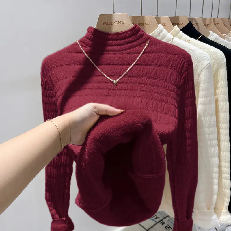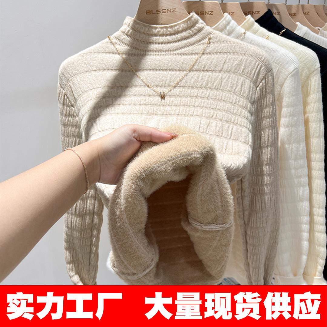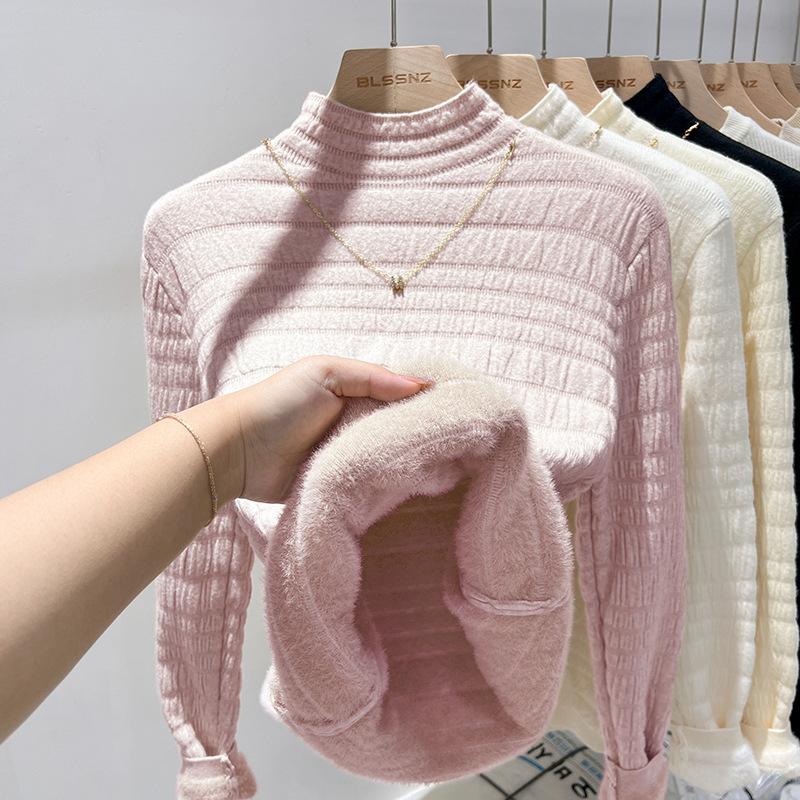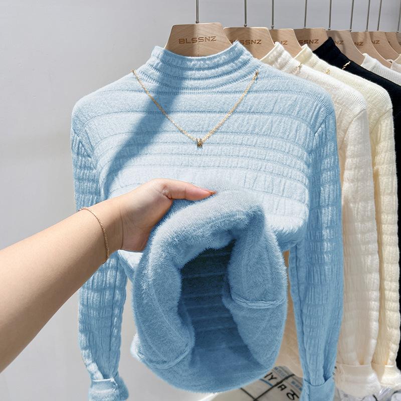 Tejido de Terciopelo de Una Pieza, Suéter de Terciopelo Visón para Mujer, Otoño e Invierno 2025 Nuevo Camiseta Básica de Punto con Media Cuello Alto y Forro Polar