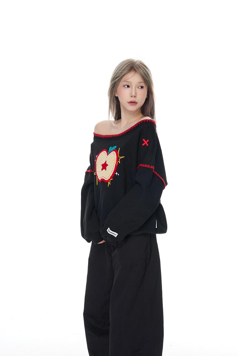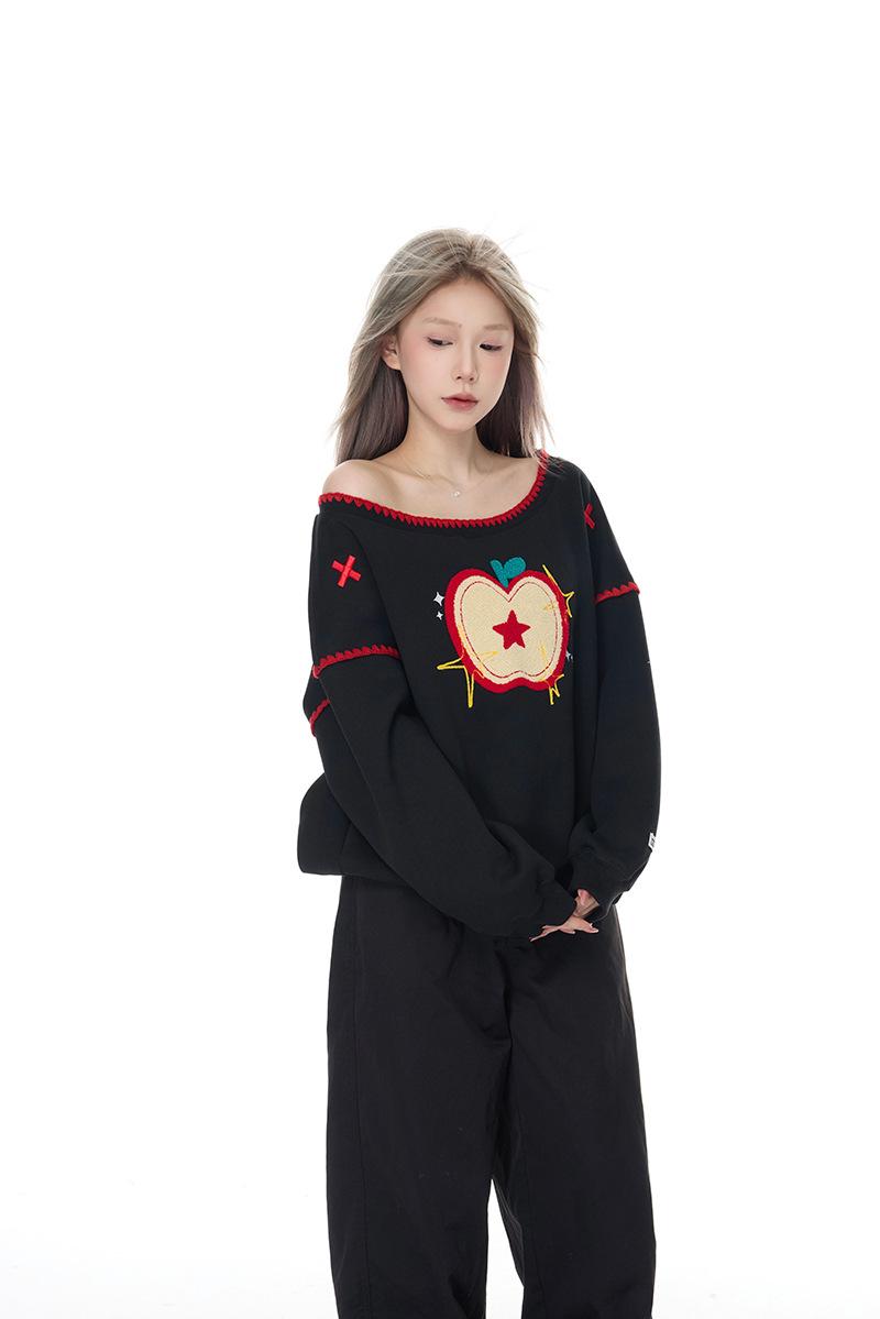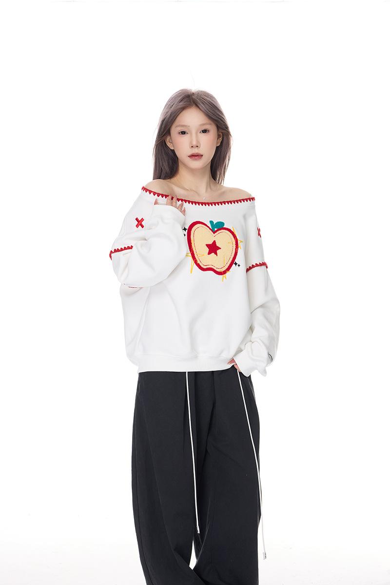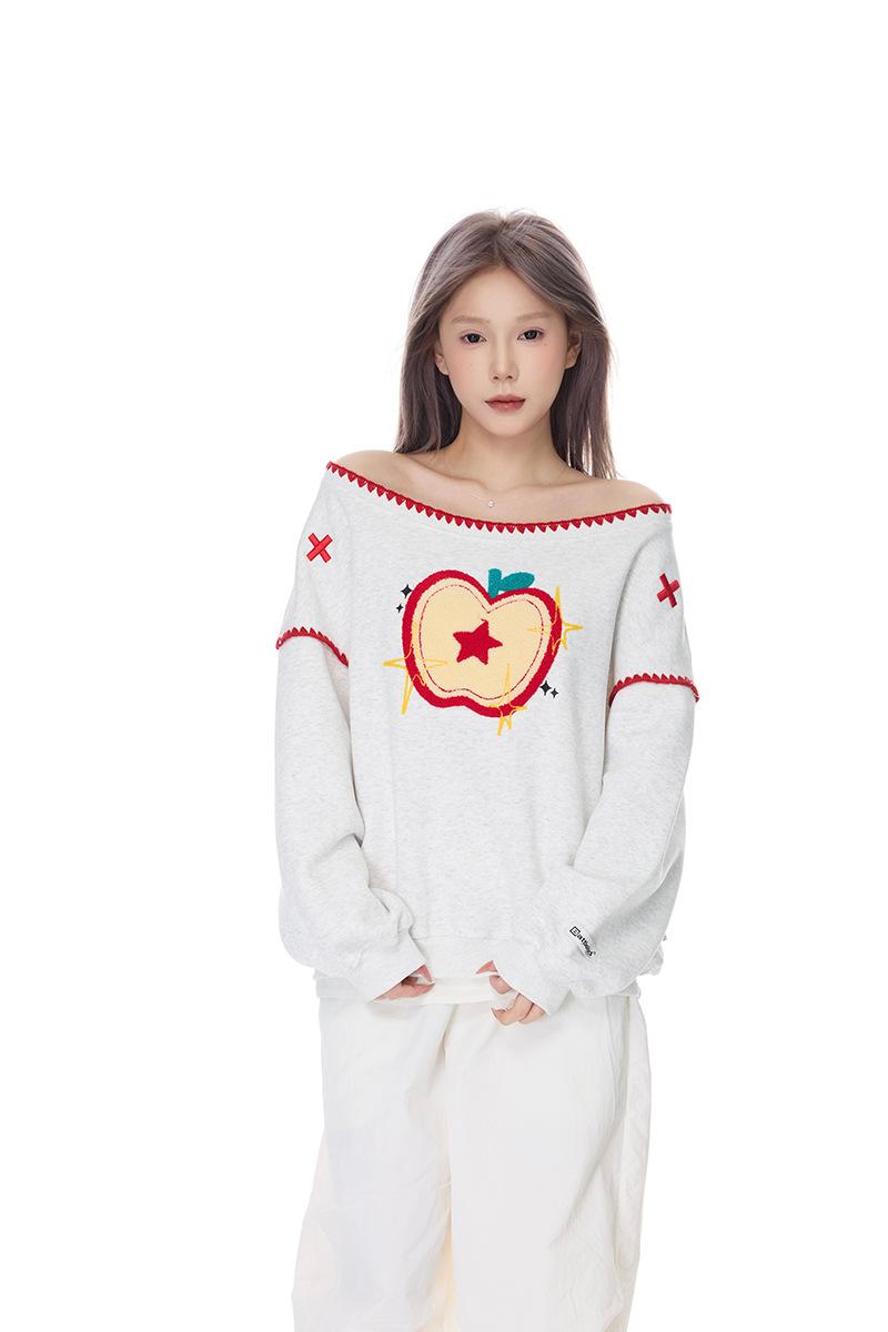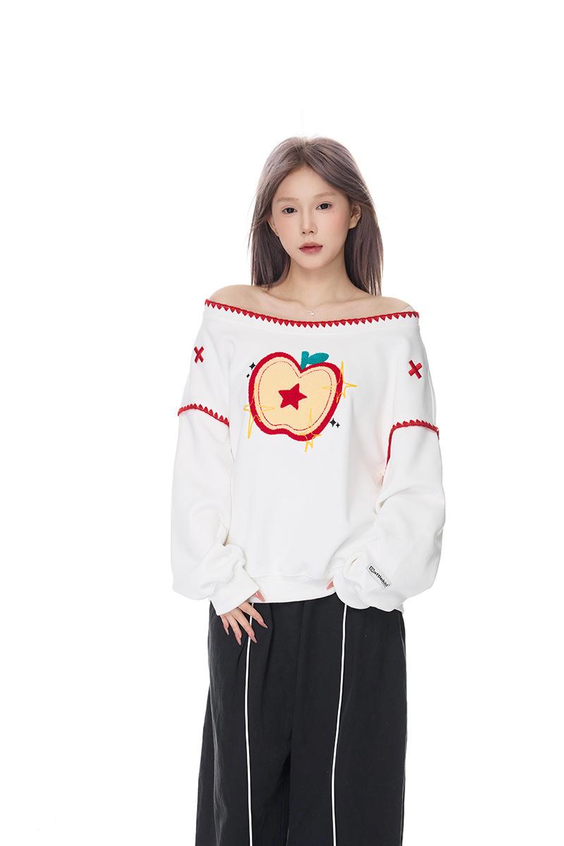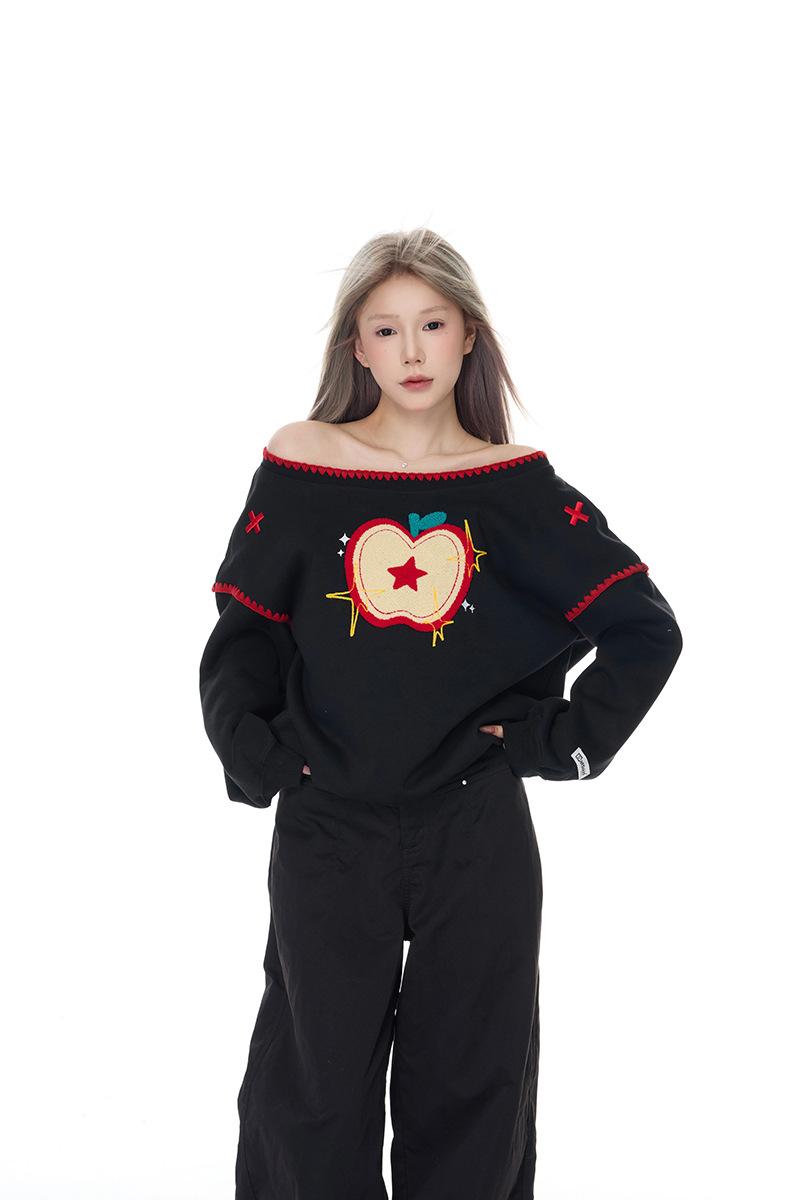 Sudadera Retro Apple Bordada con Hombros Descubiertos para Mujer Otoño 2025 Nuevo Americano Adelgazante Versátil Tendencia Top de Chica Caliente