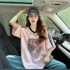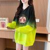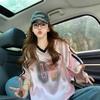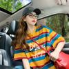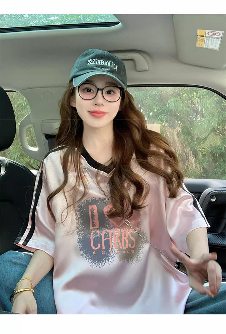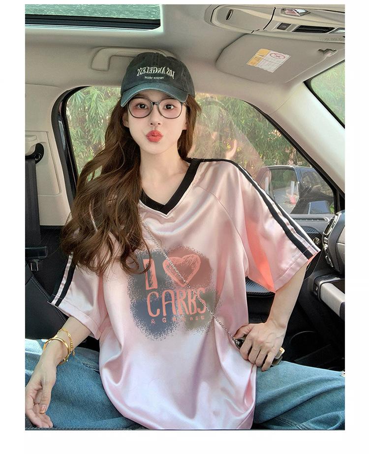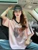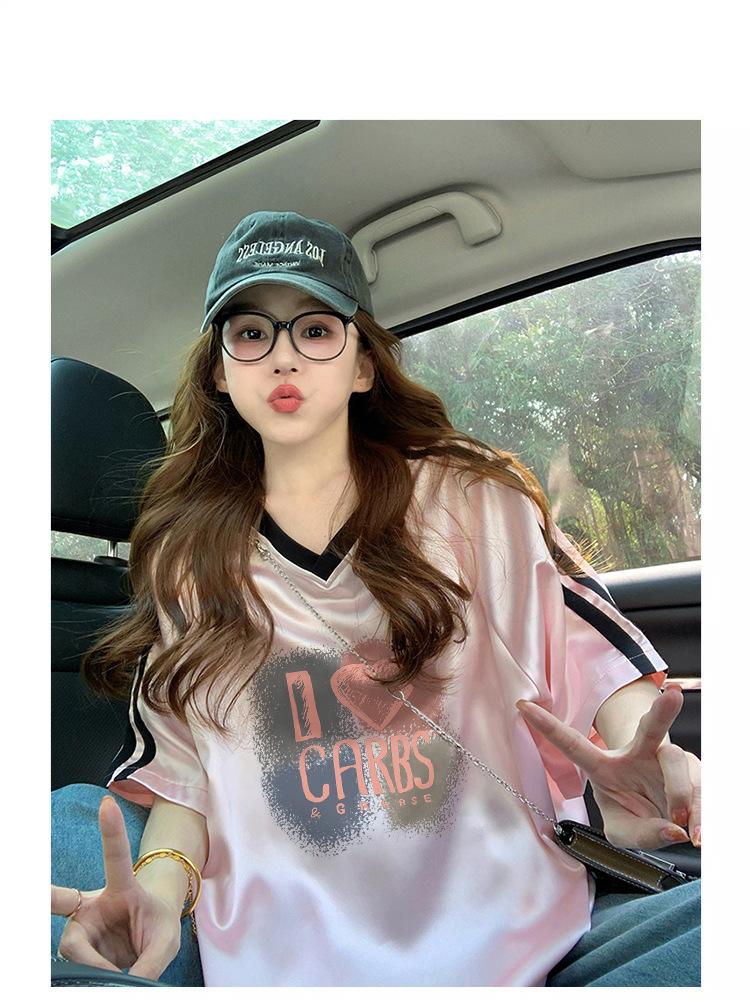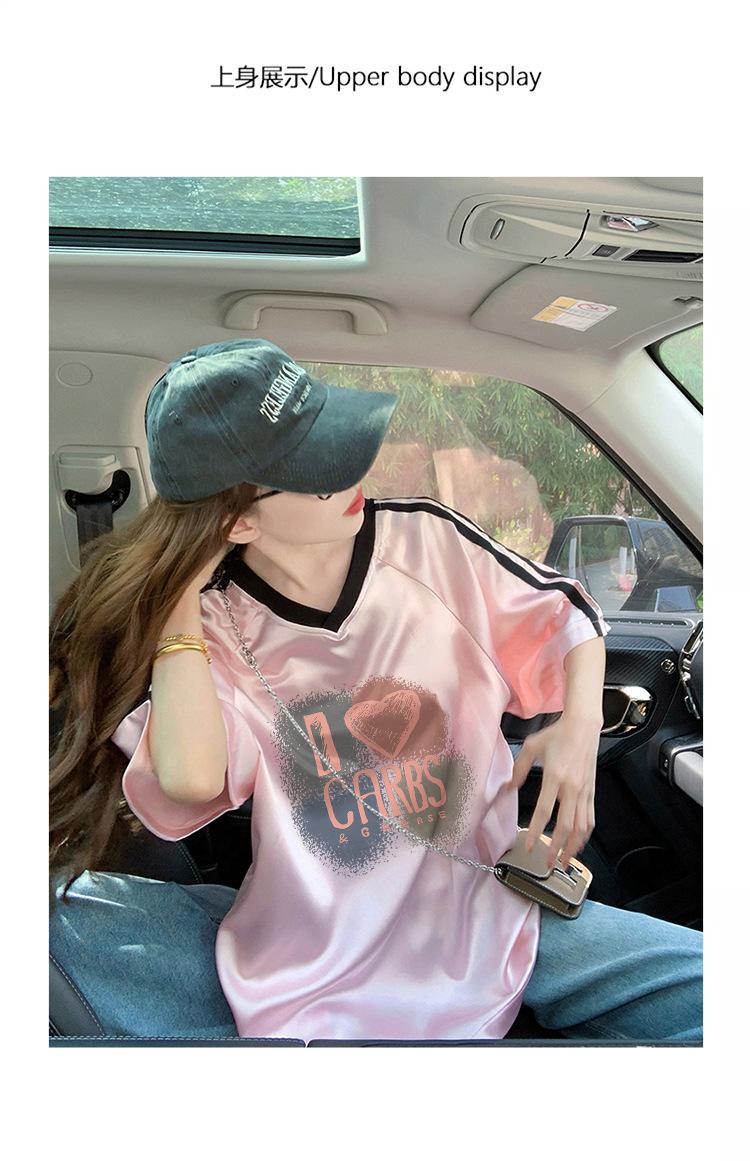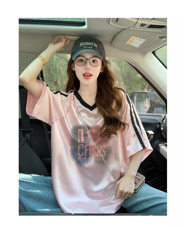 Camiseta Holgada de Cuello en V Estilo Universitario con Letra Contrastante para Mujer Diseño de Rayas Mangas Raglán Reductor de Edad Top de Moda de Largo Medio
