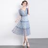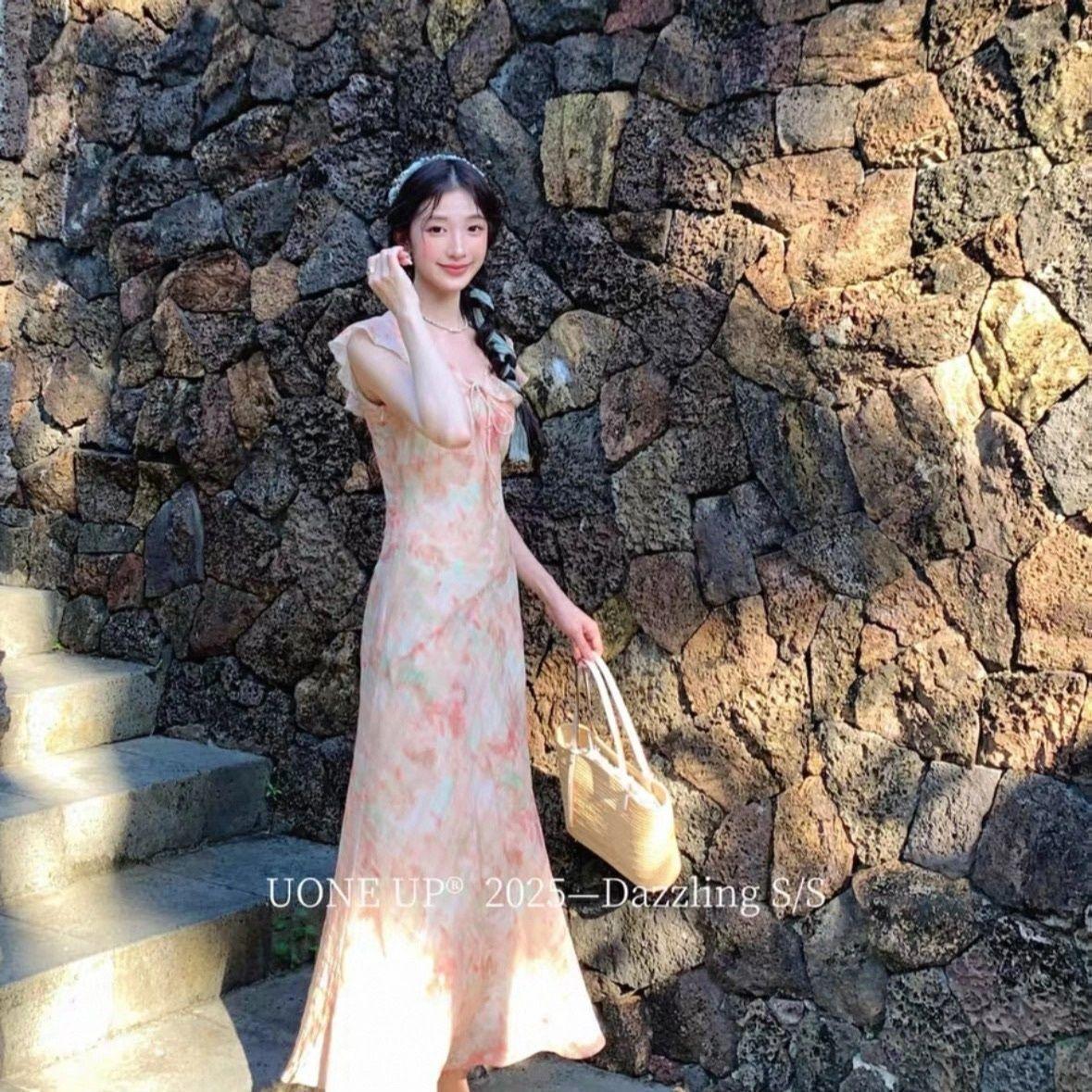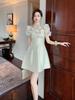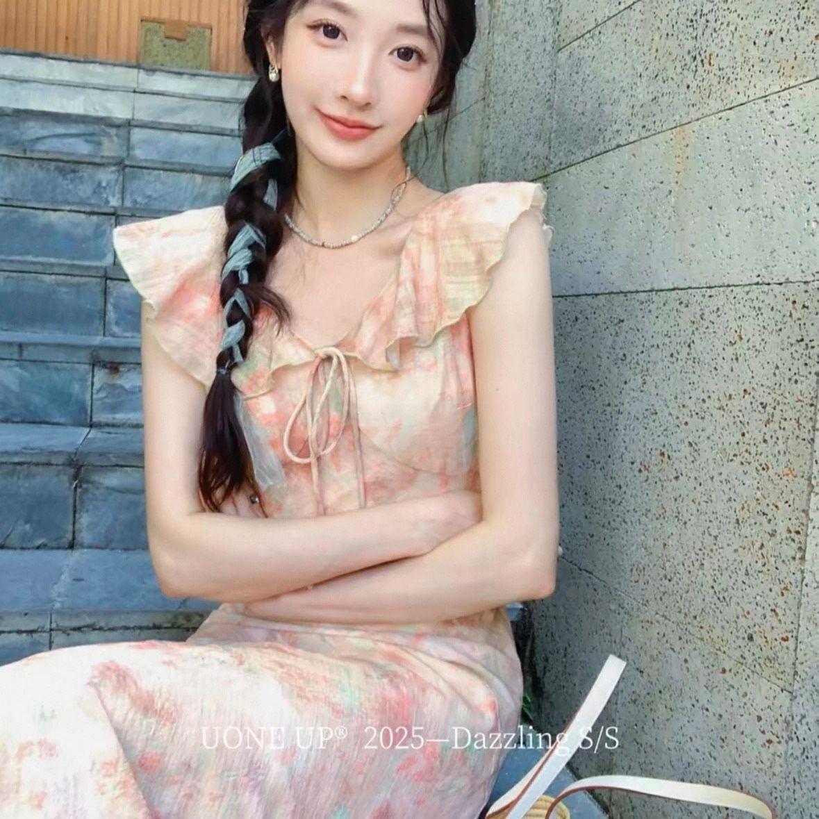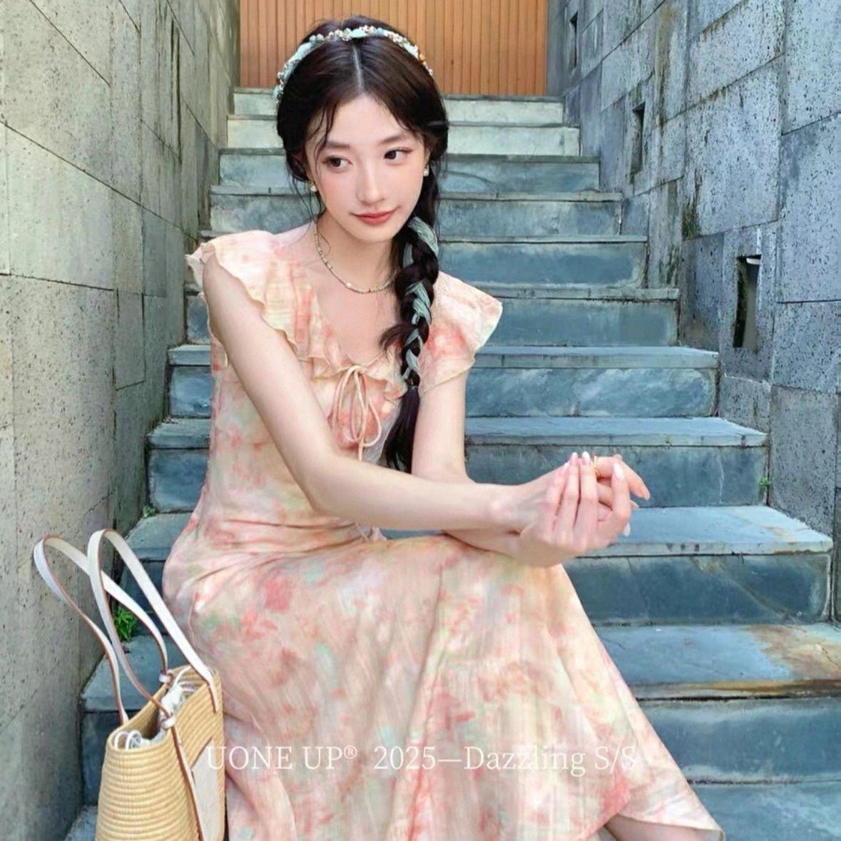2025 Primavera y Verano Nuevo Estilo Encaje Francés con Cordones en la Cintura Adelgazante Mangas Volantes Vestido Romántico y Delicado