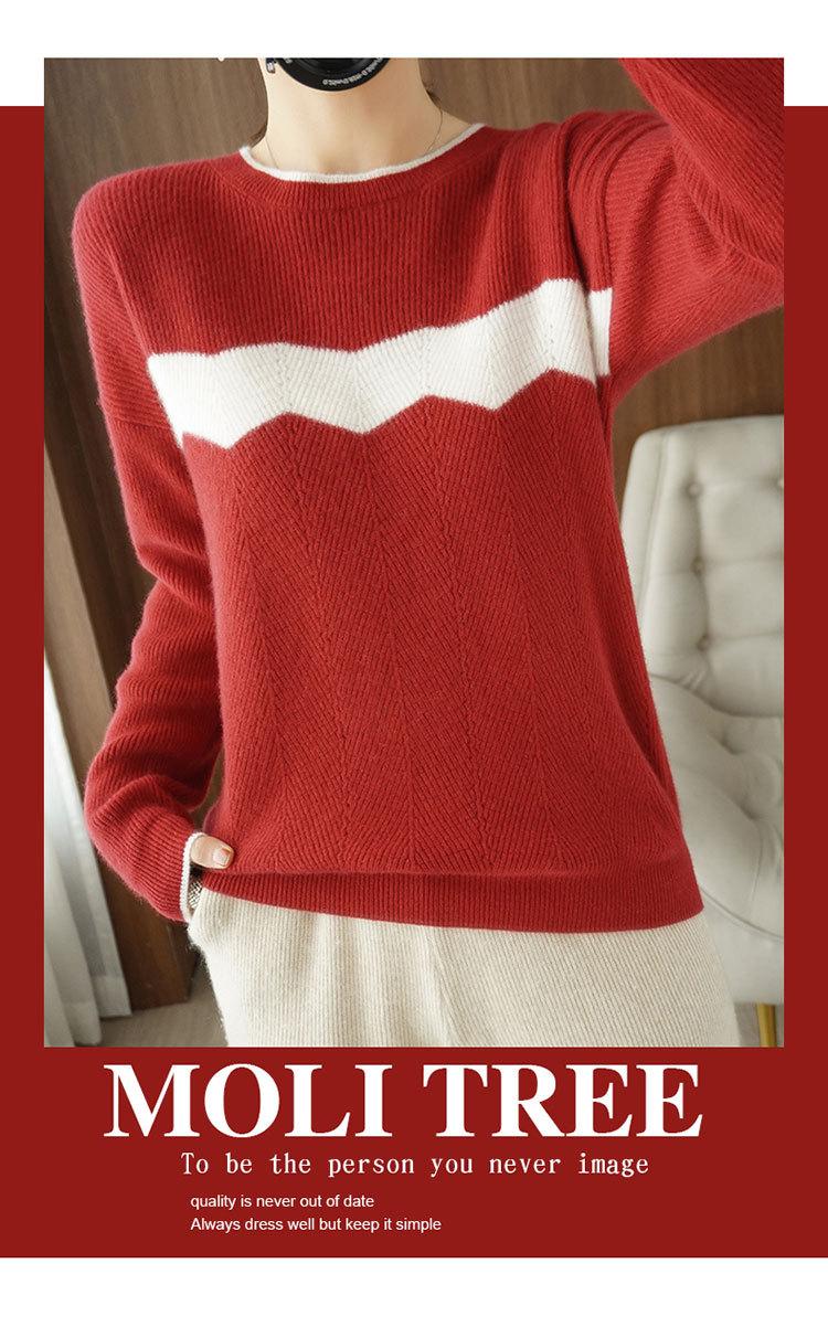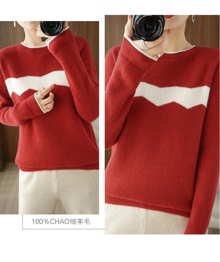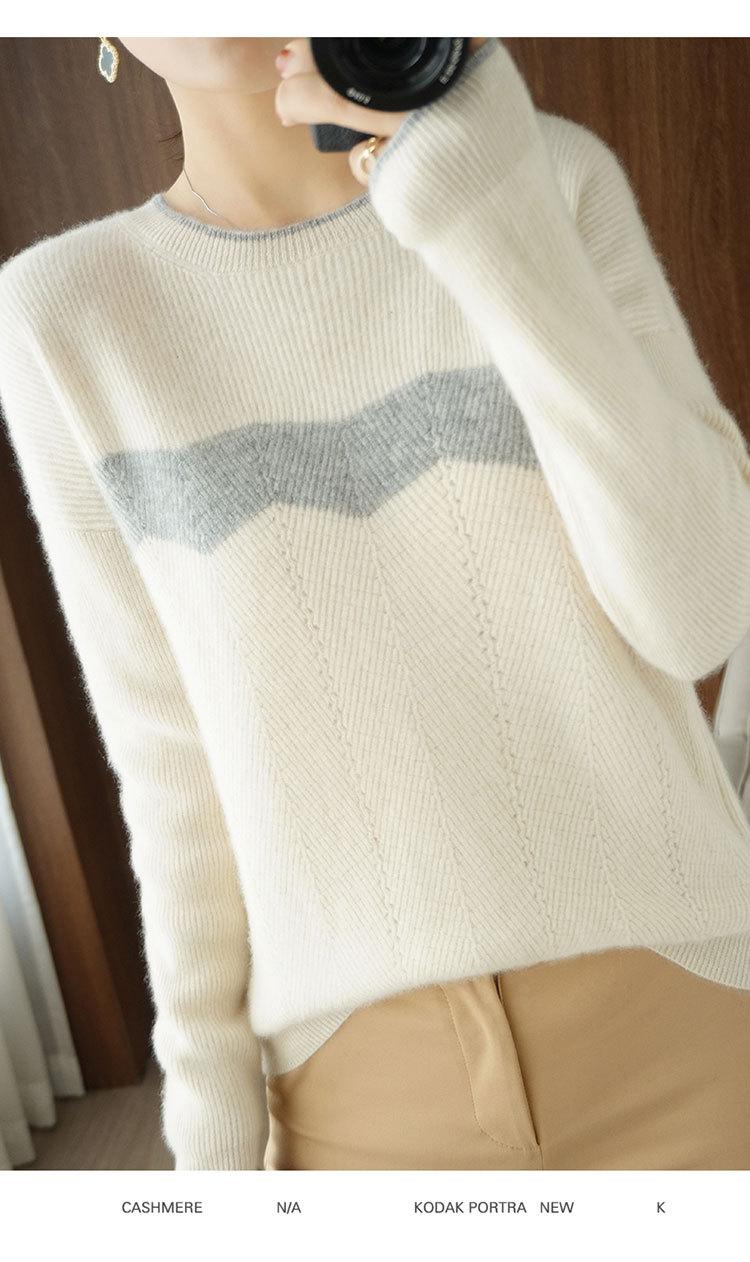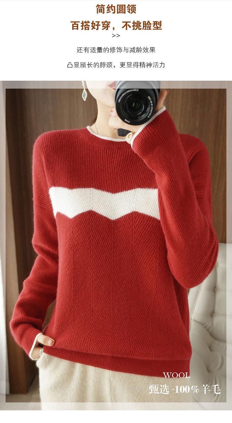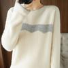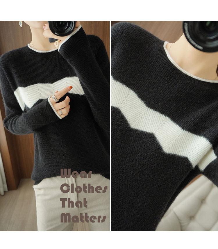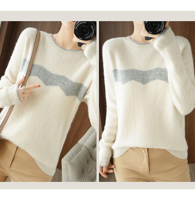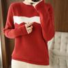 Otoño/invierno 2024 nuevo suéter de cuello redondo de lana pura versión coreana manga larga color combinado jersey moda suéter top