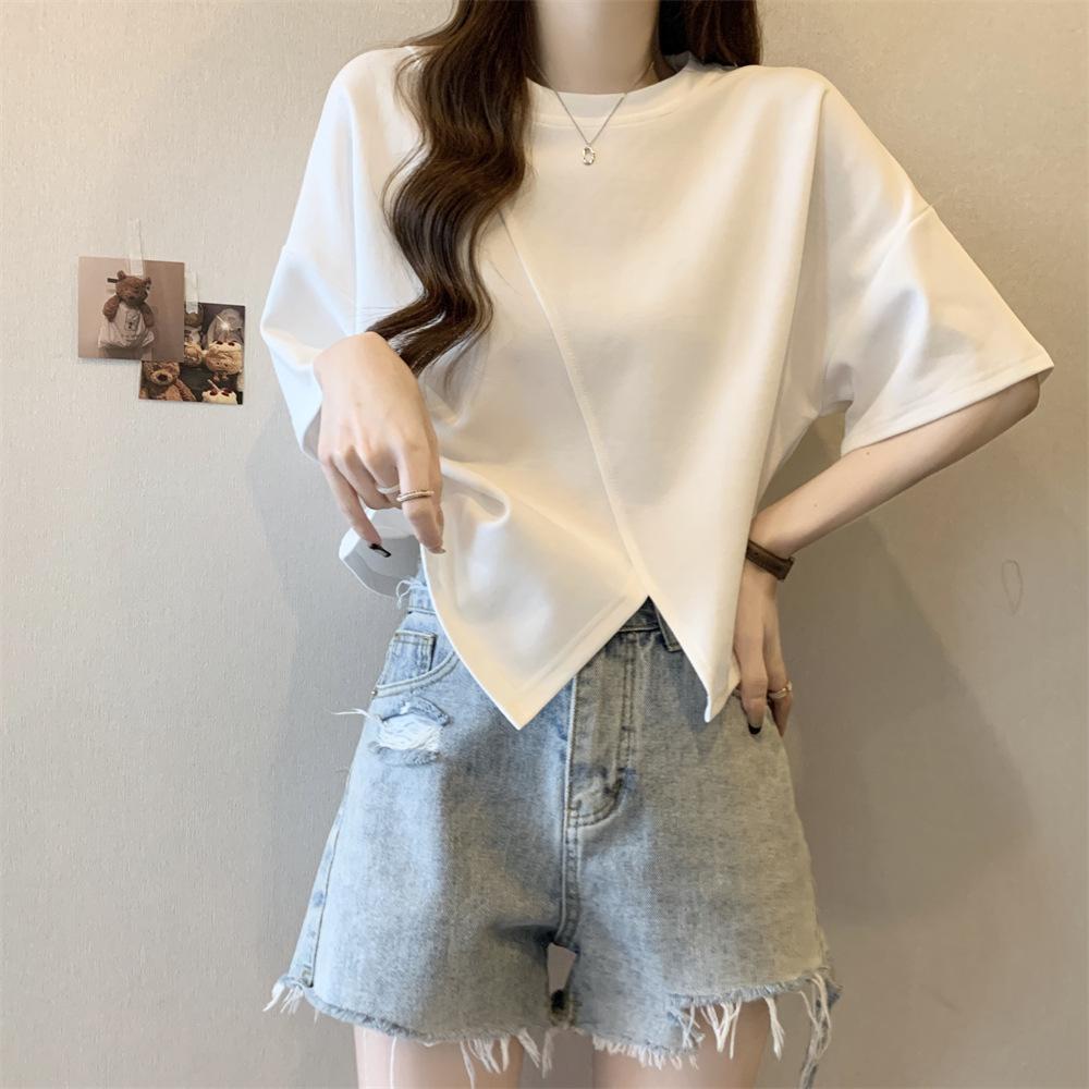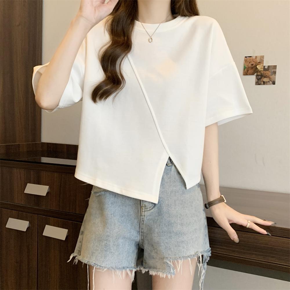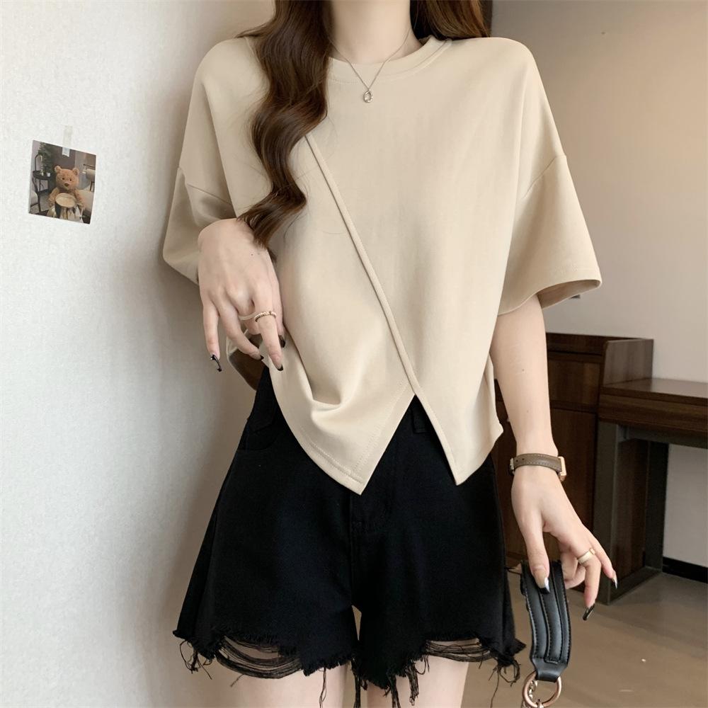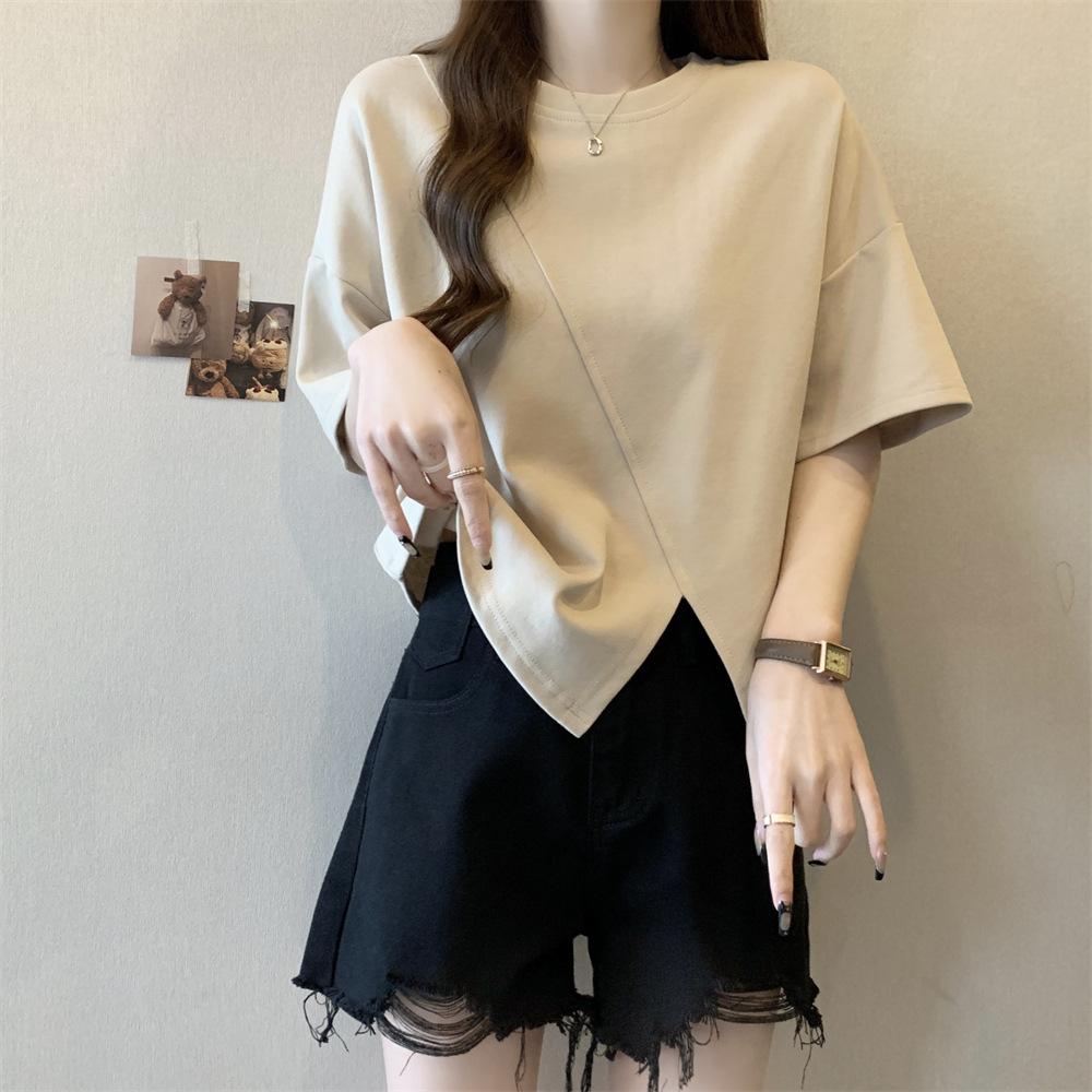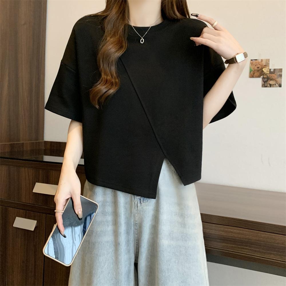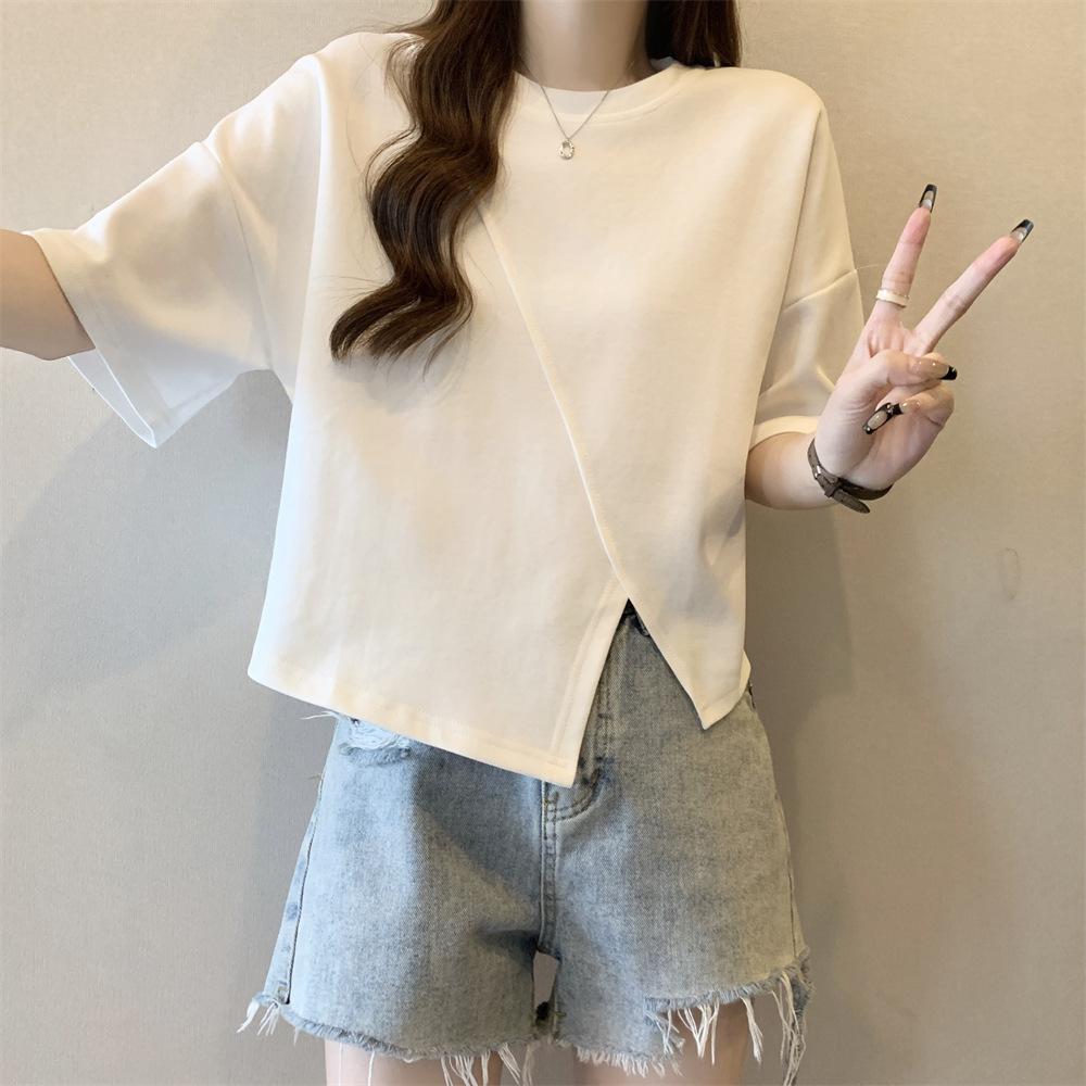 Playera Real Europea de Manga Corta para Mujer 2025 Verano Nueva Talla Grande Chica Gordita Adelgazante Cubre Vientre Top Irregular con Abertura