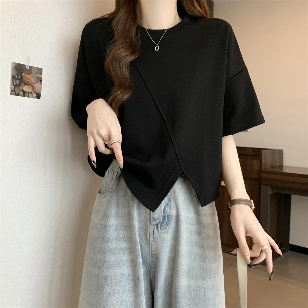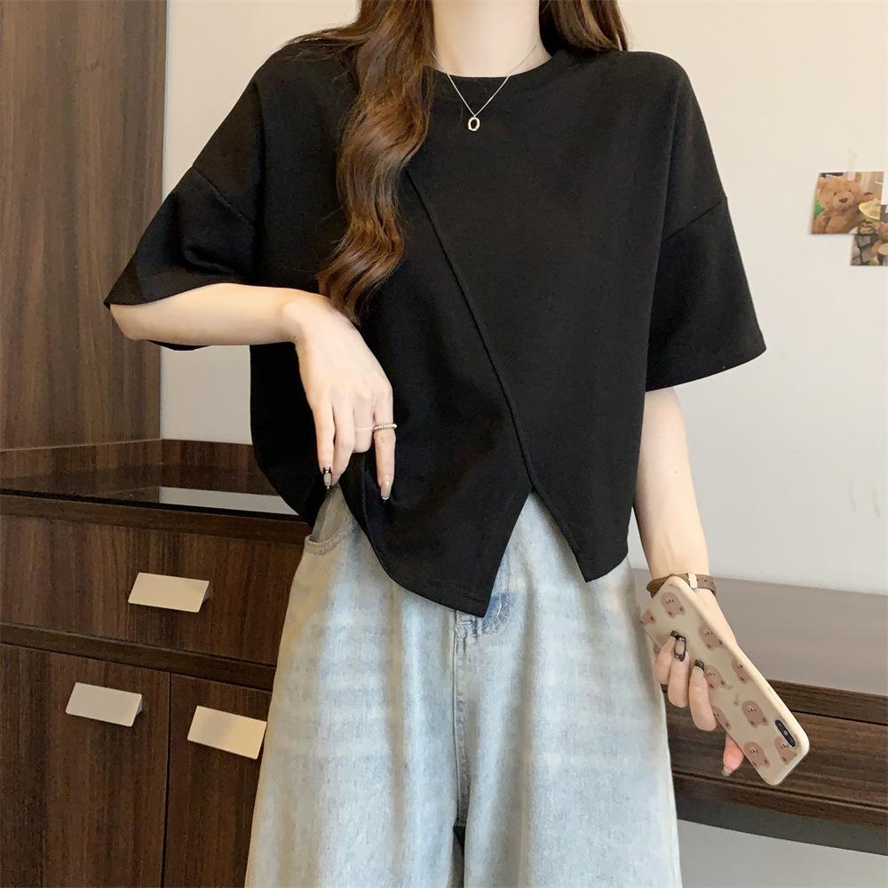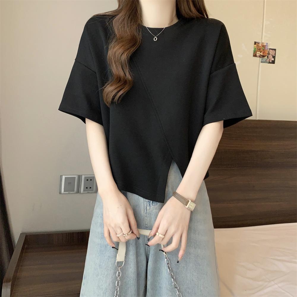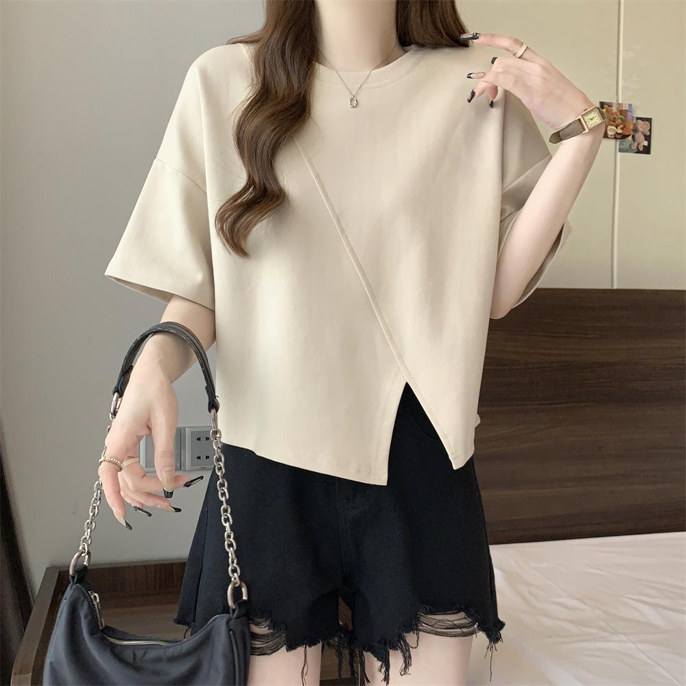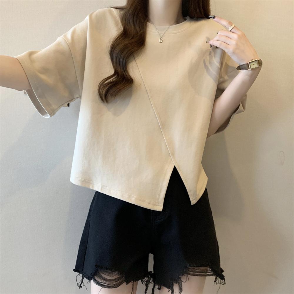 Playera Real Europea de Manga Corta para Mujer 2025 Verano Nueva Talla Grande Chica Gordita Adelgazante Cubre Vientre Top Irregular con Abertura