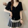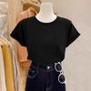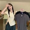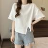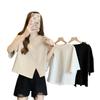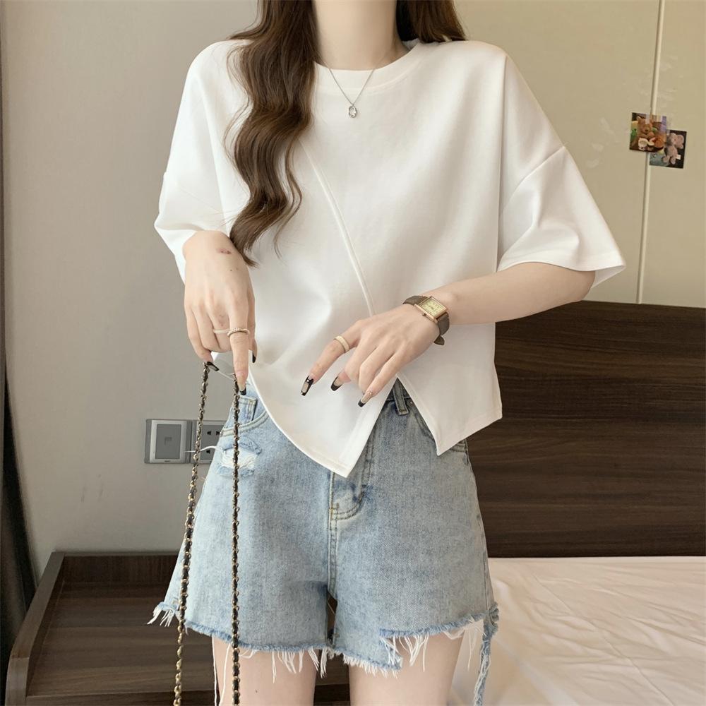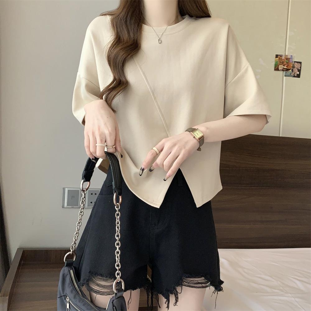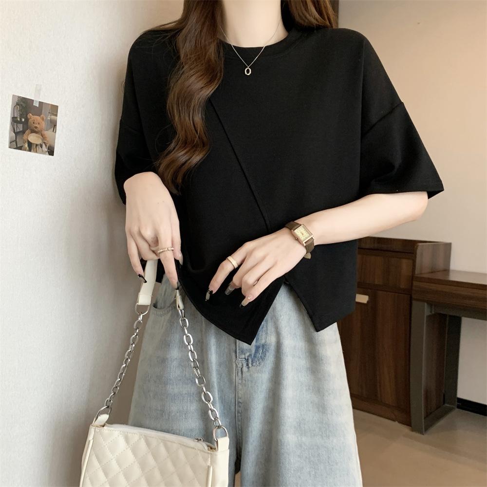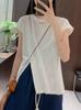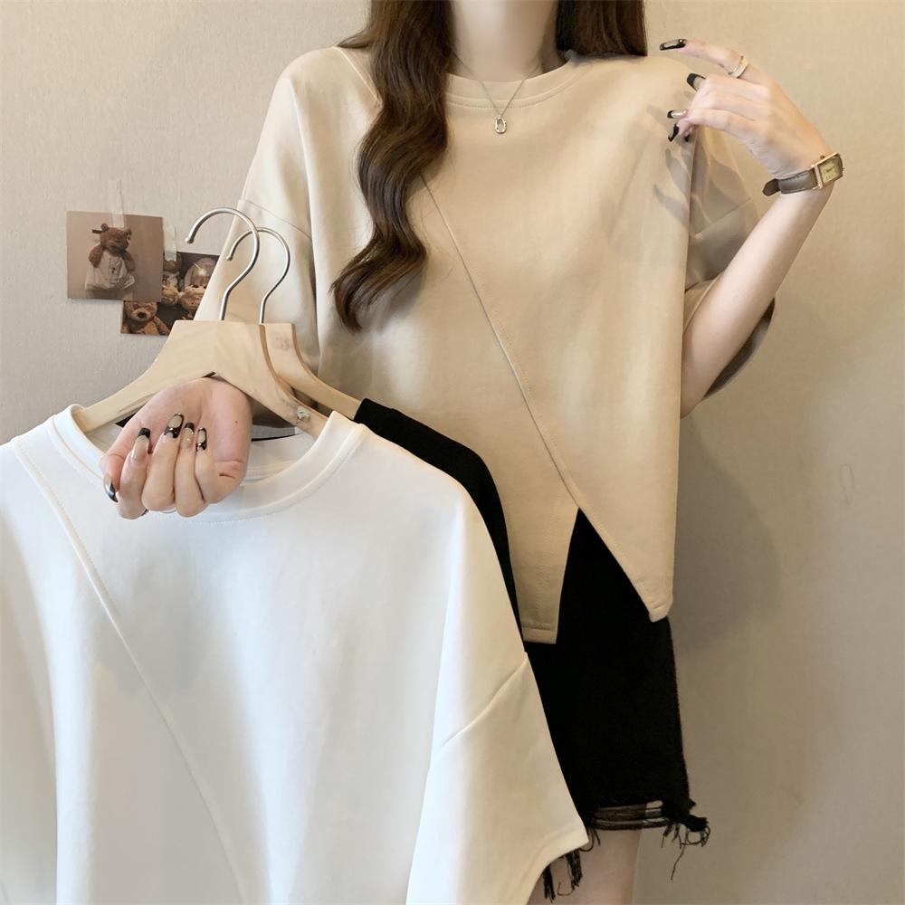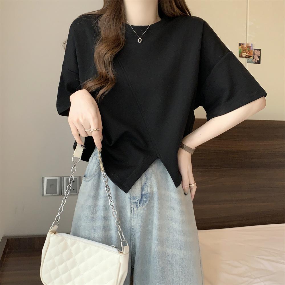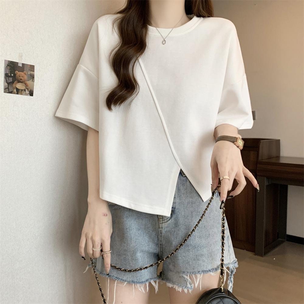 Playera Real Europea de Manga Corta para Mujer 2025 Verano Nueva Talla Grande Chica Gordita Adelgazante Cubre Vientre Top Irregular con Abertura