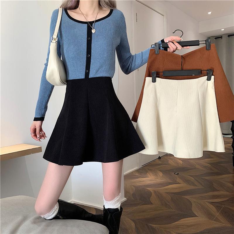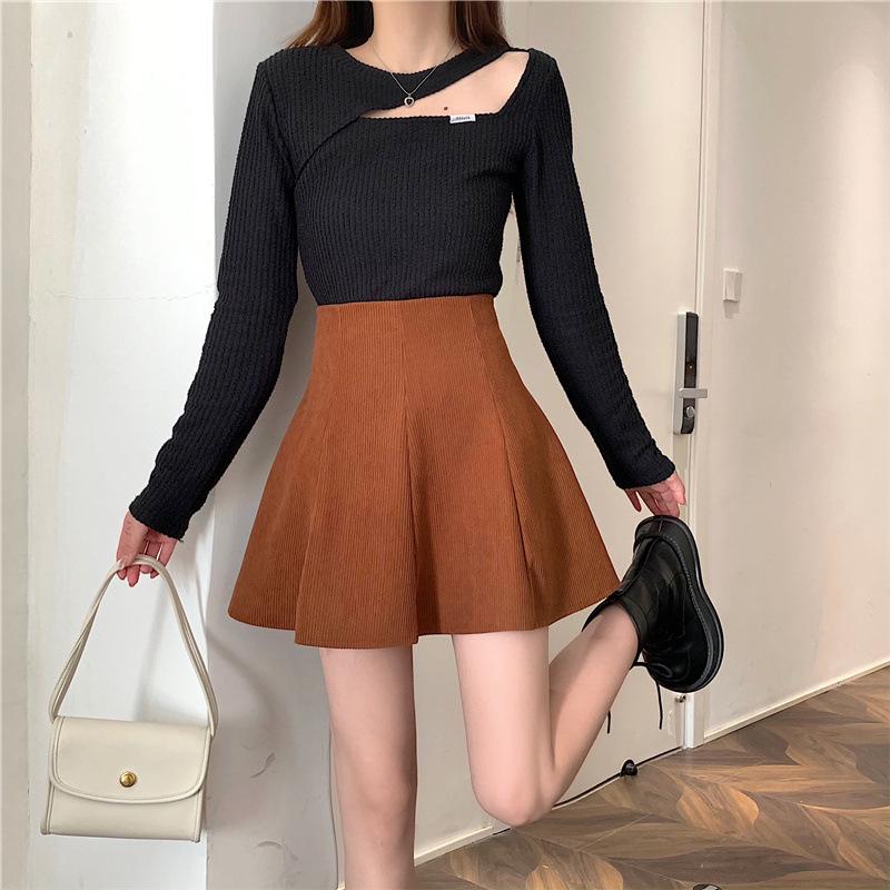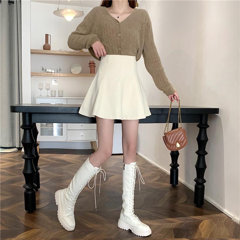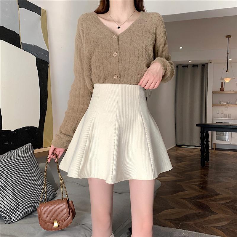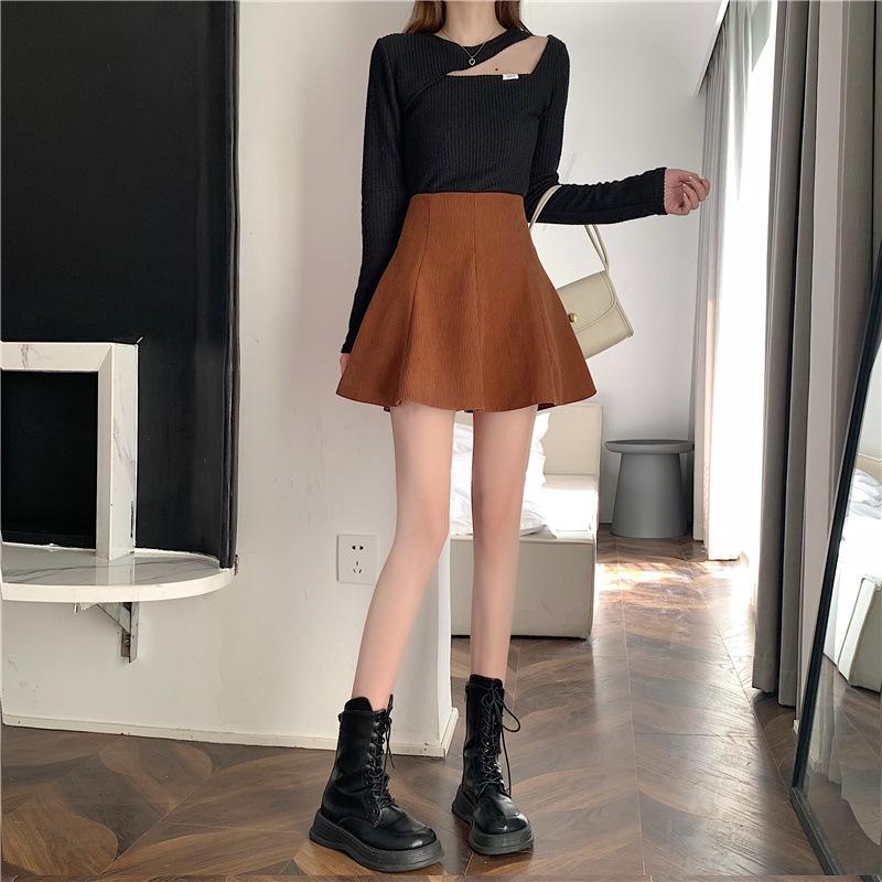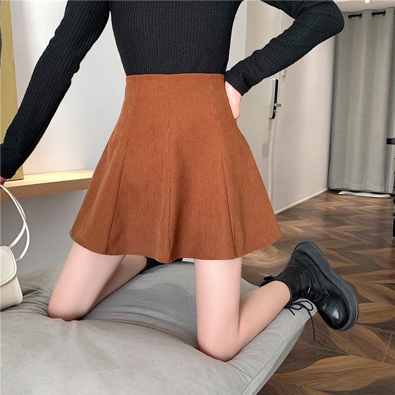 Falda midi de pana color café con leche para mujer 2025 otoño e invierno nuevo estilo cintura alta línea A petite falda corta