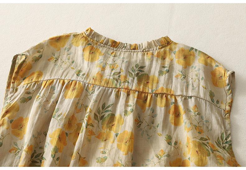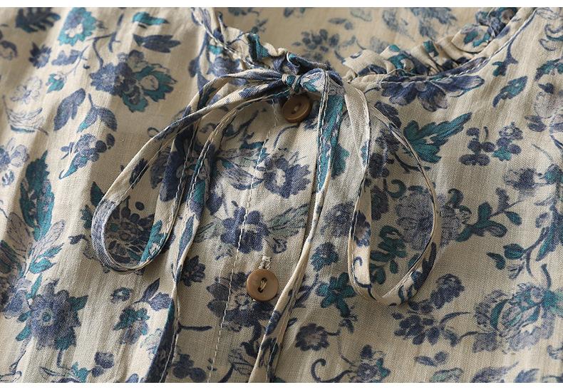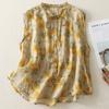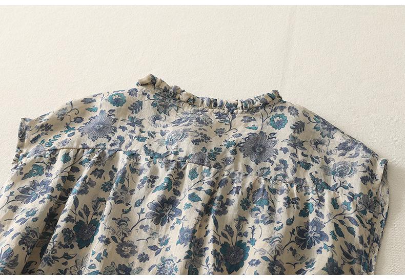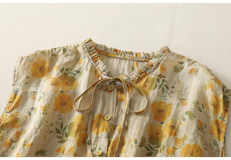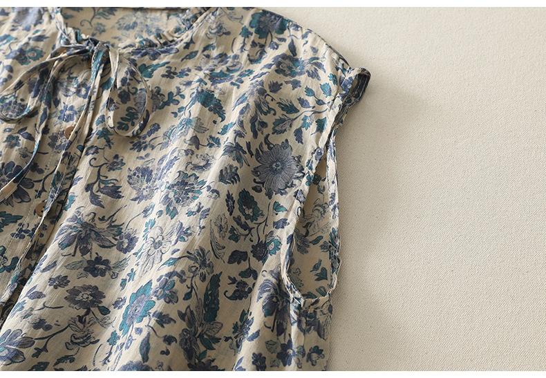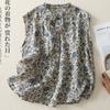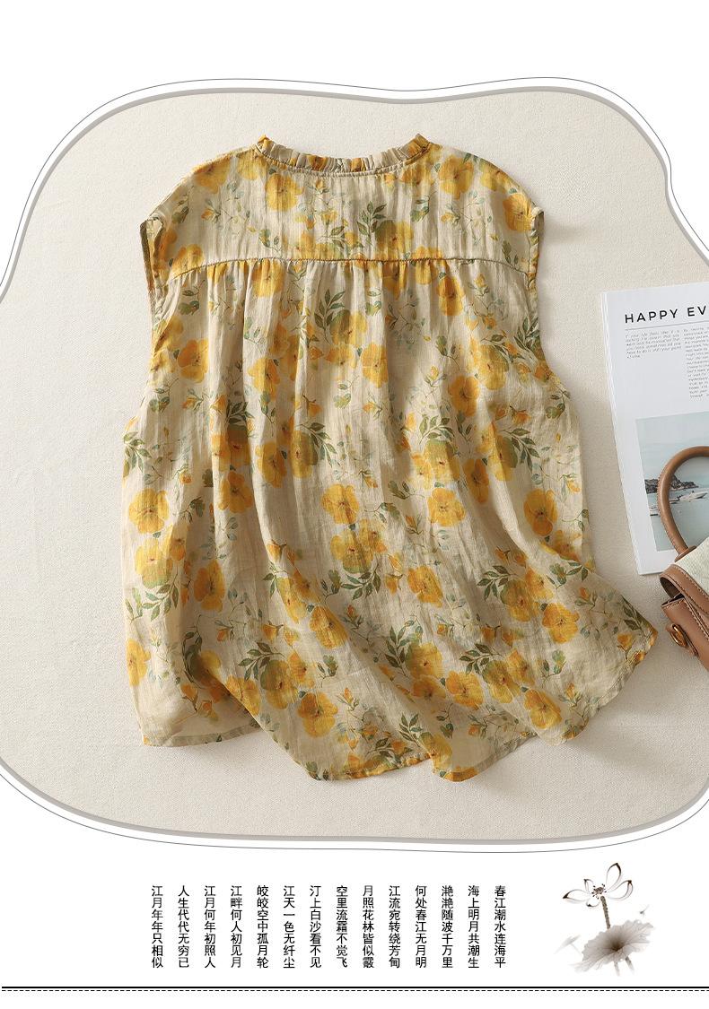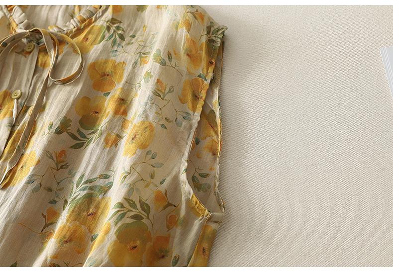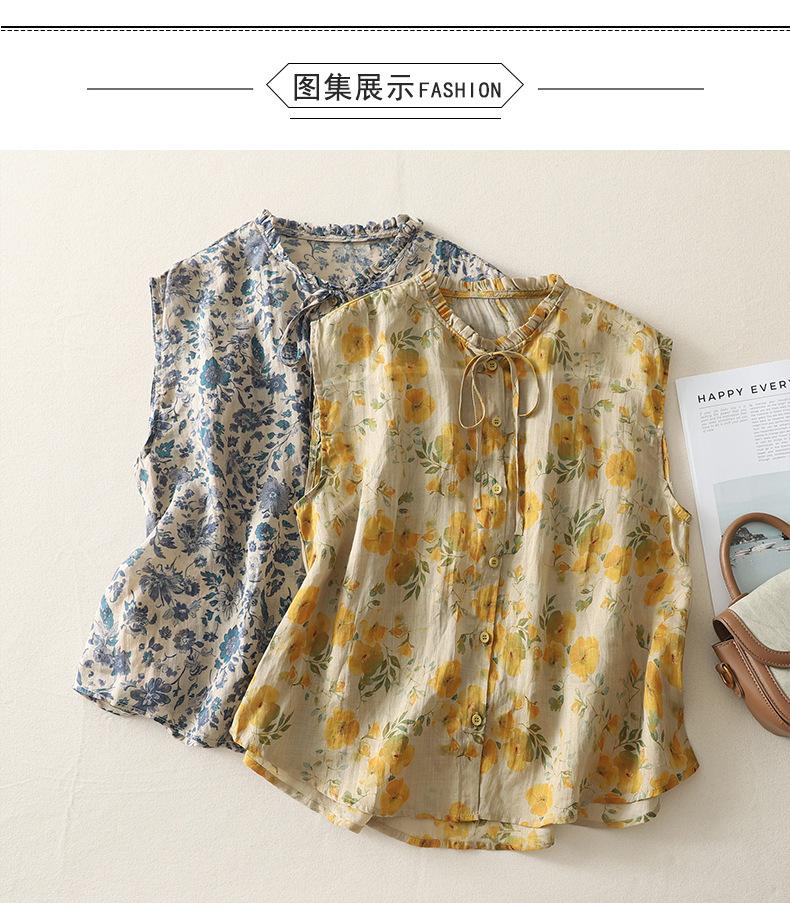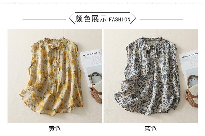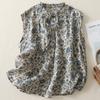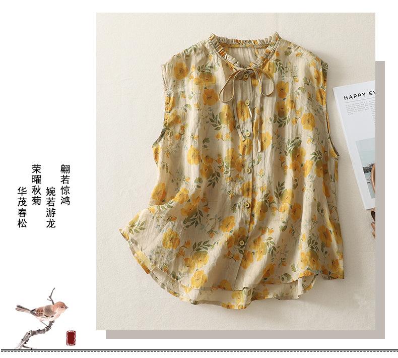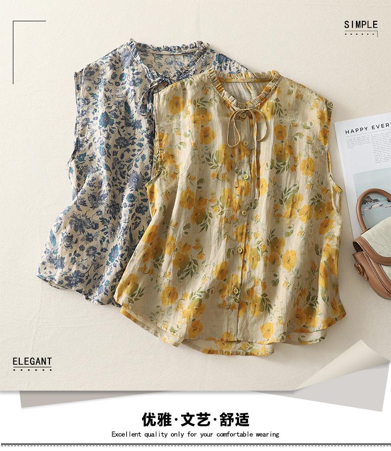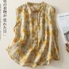2025 Verano Nuevo Versátil Estilo Literario Estampado Lazo Cuello Botones Sin Mangas Algodón Lino Blusa