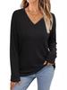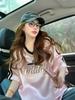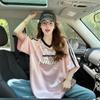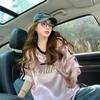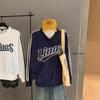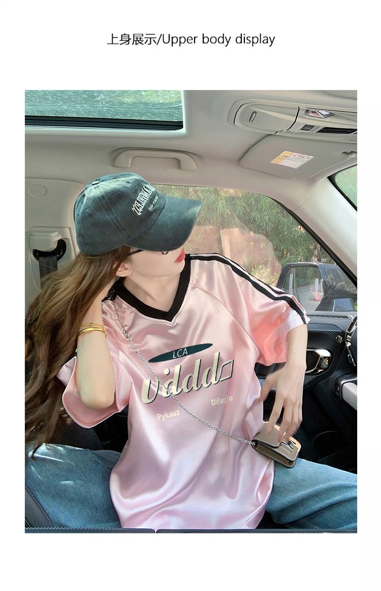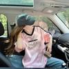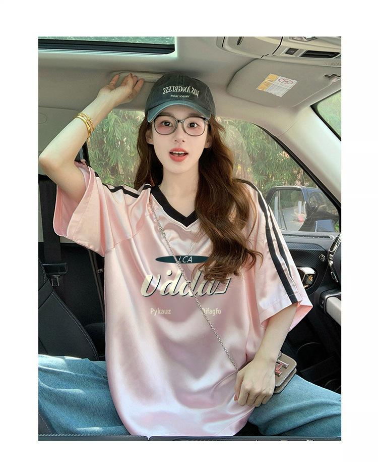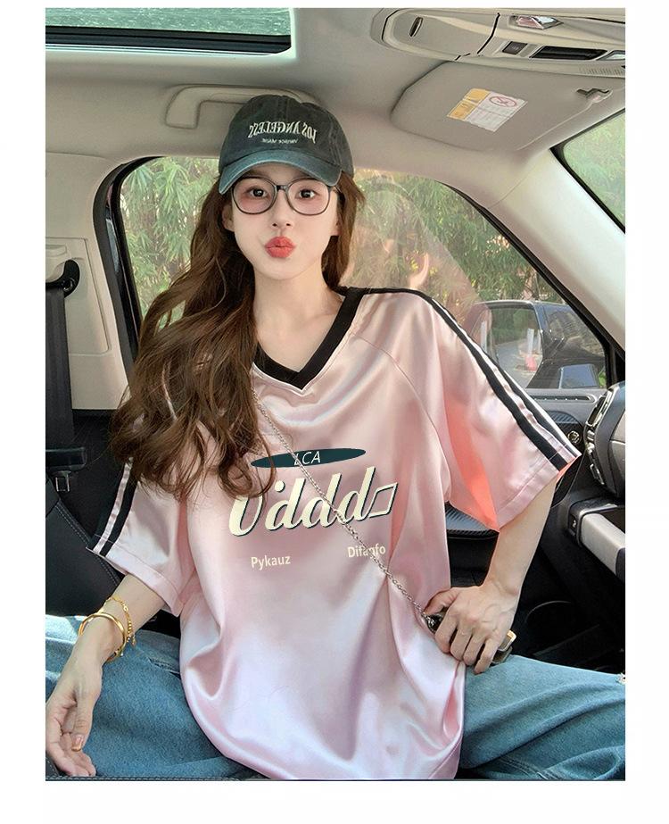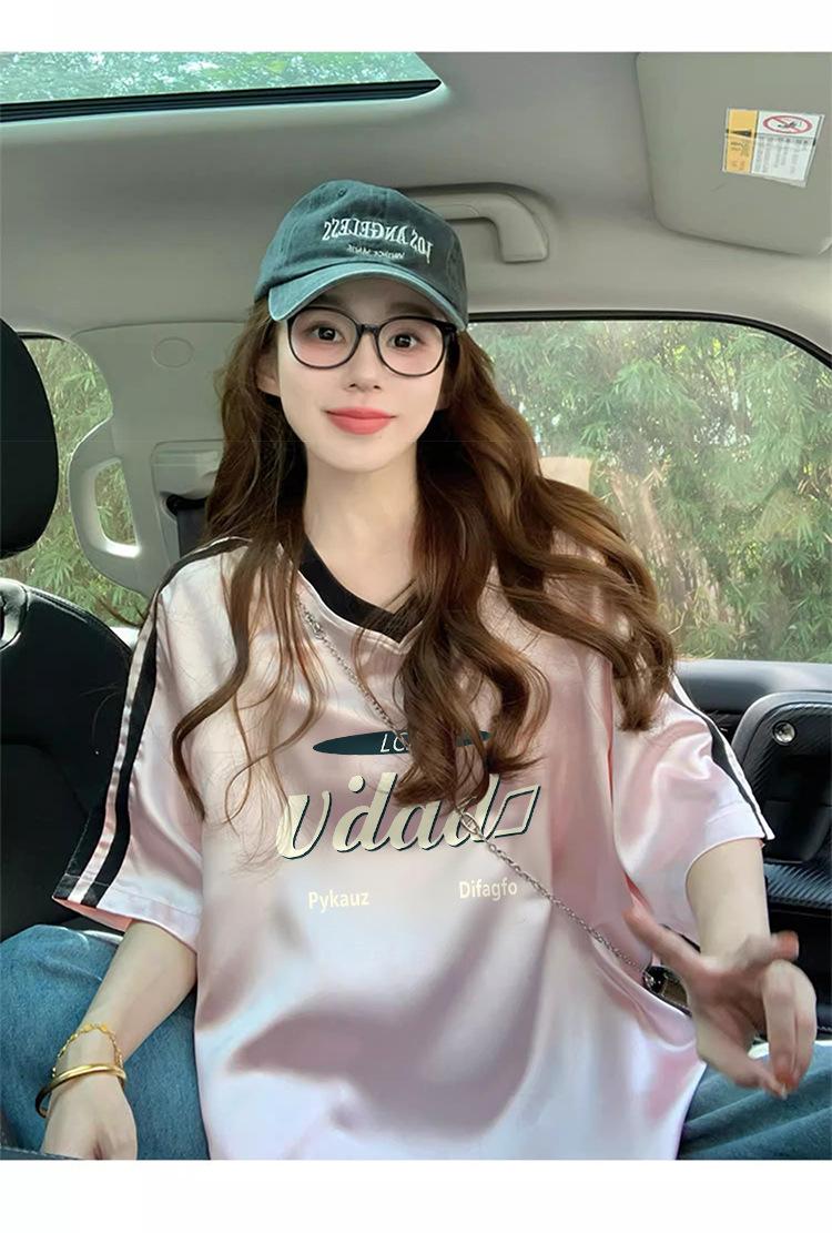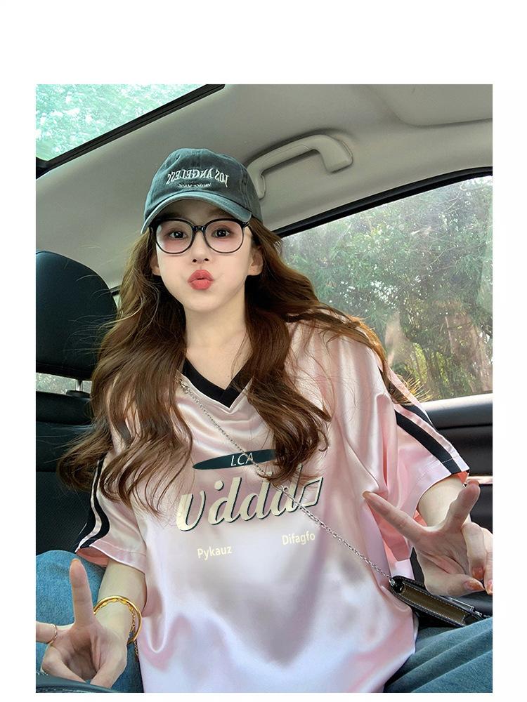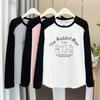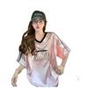 Camiseta Holgada Casual de Moda con Cuello en V y Letras para Mujer Chic Retro Manga Raglán Patchwork Largo Medio Elegante Versátil Top