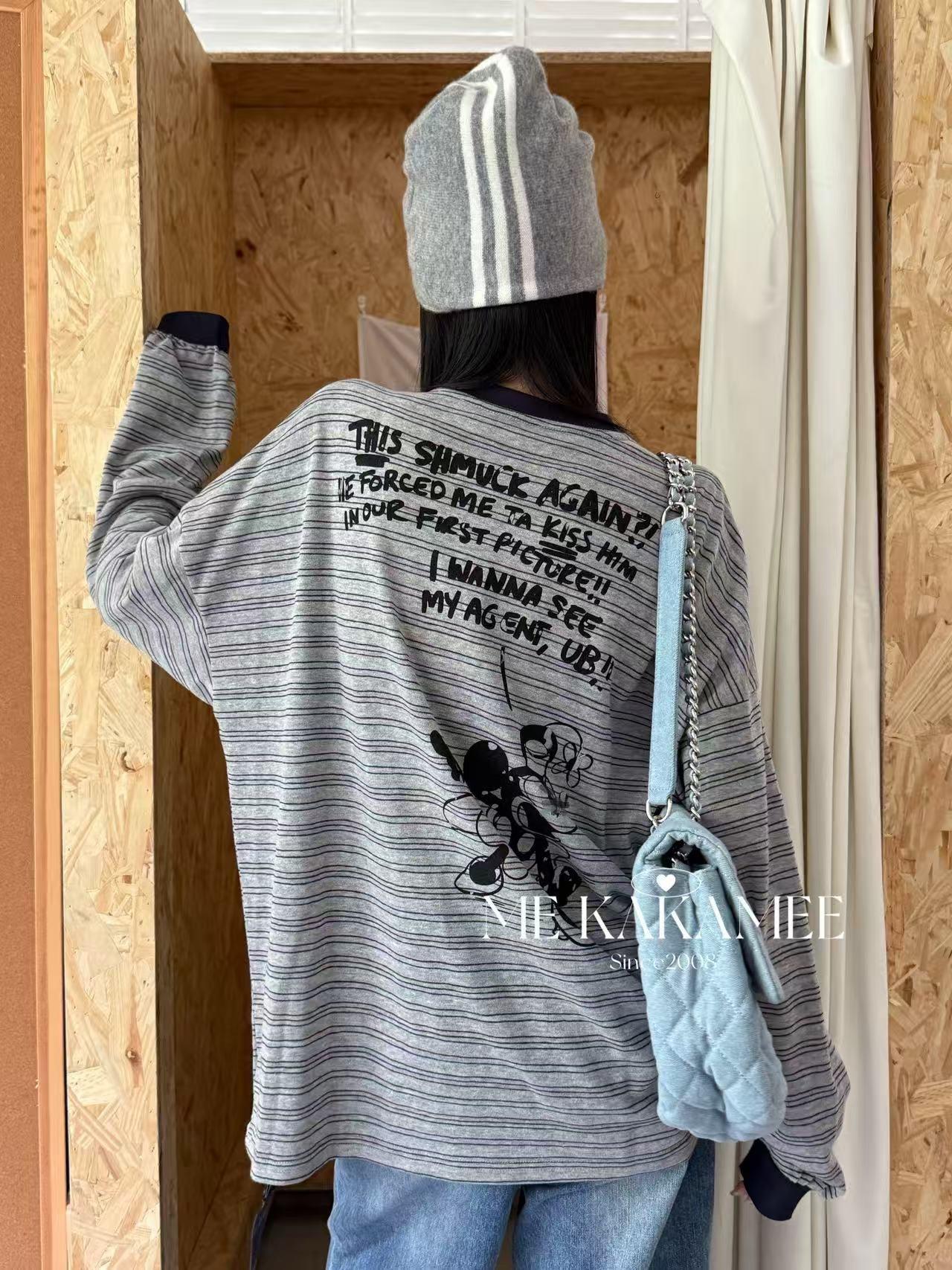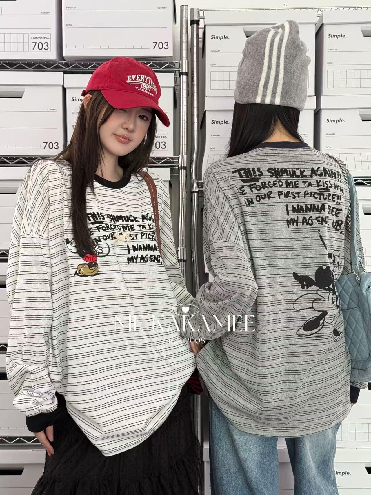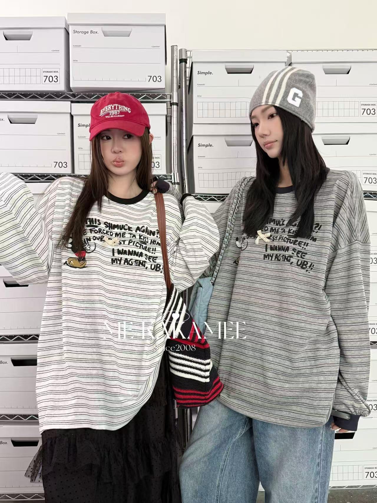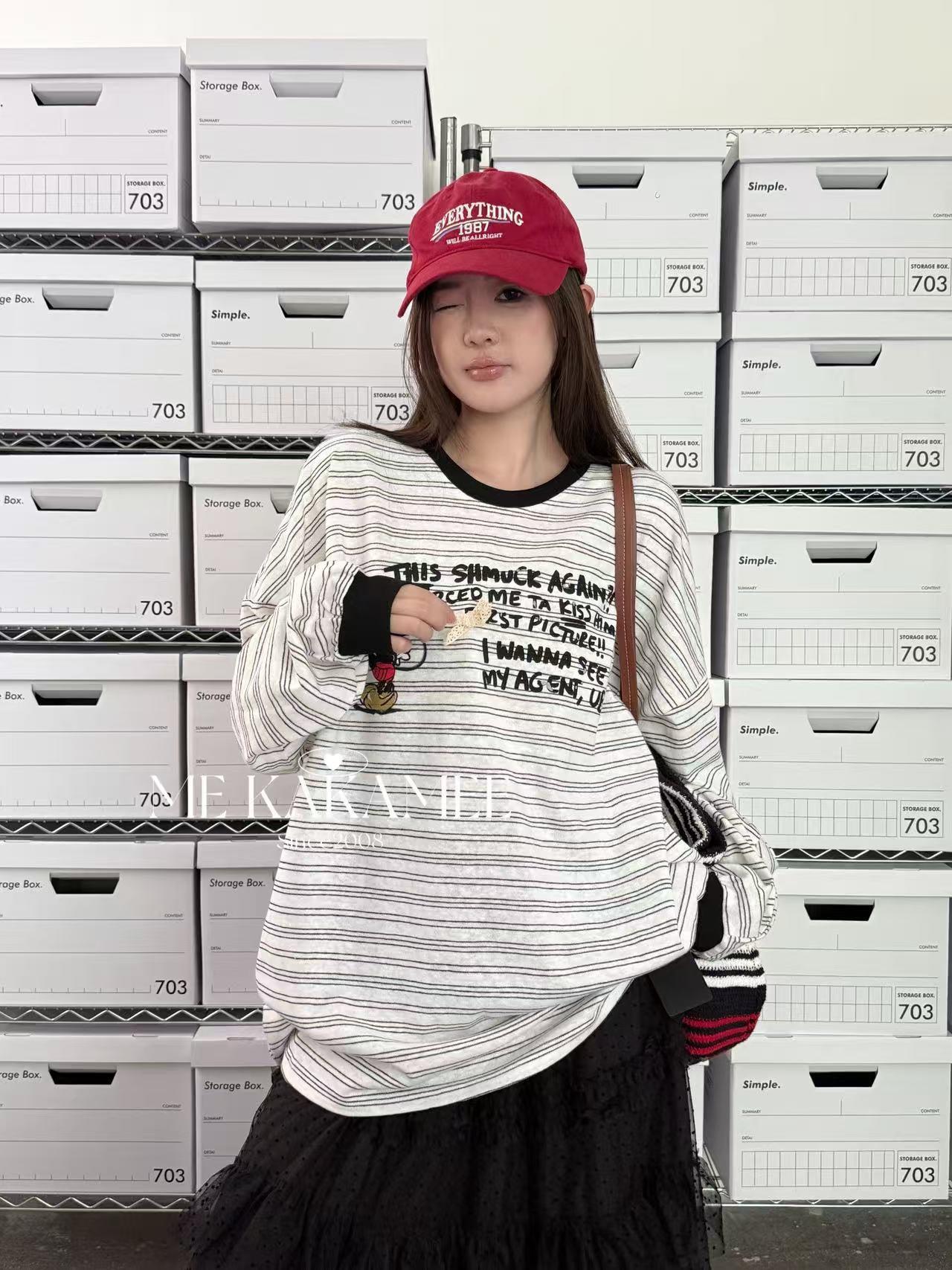 ME KAKAMEE Trece Líneas Otoño Nueva Tendencia American Graffiti Rayas MQ Camiseta de Manga Larga Holgada Mujer Coreana 8819