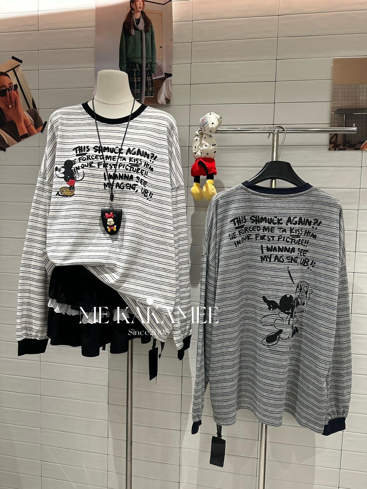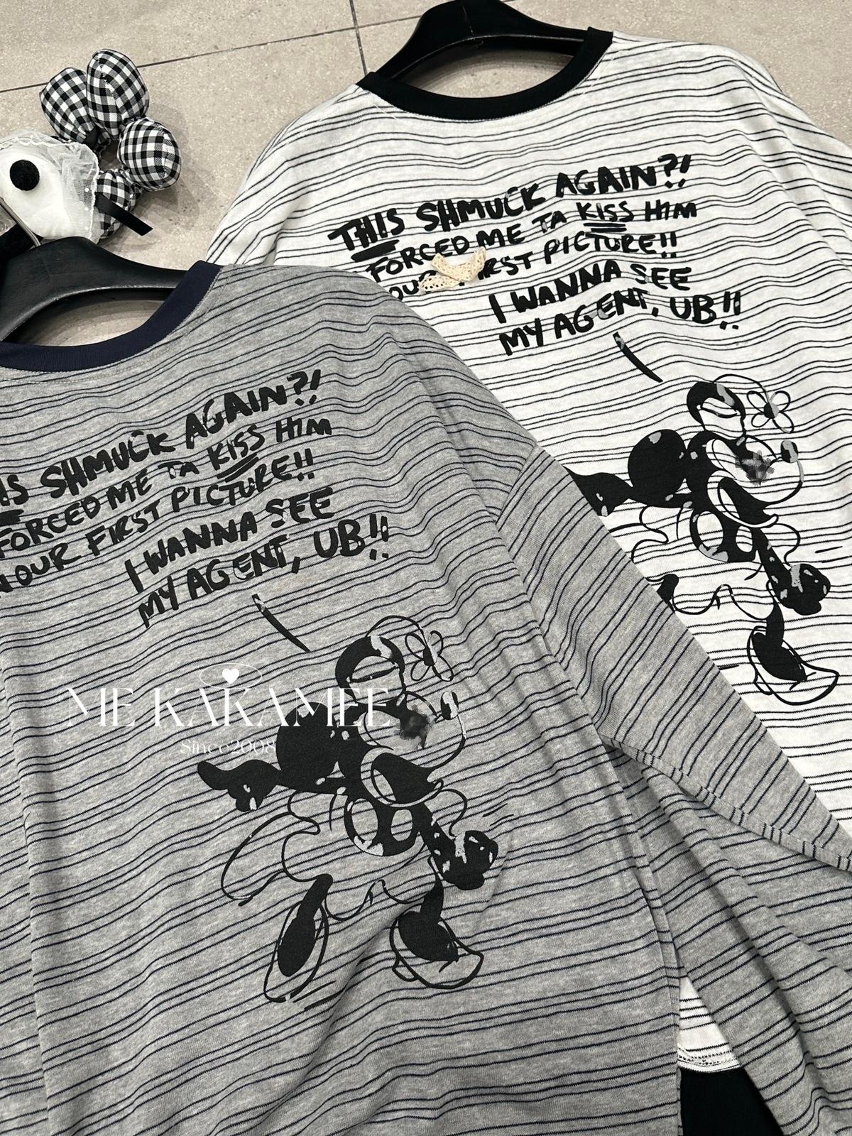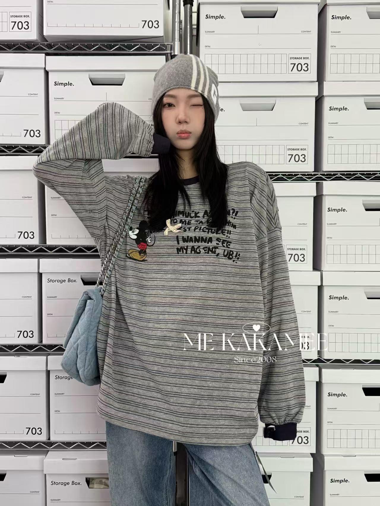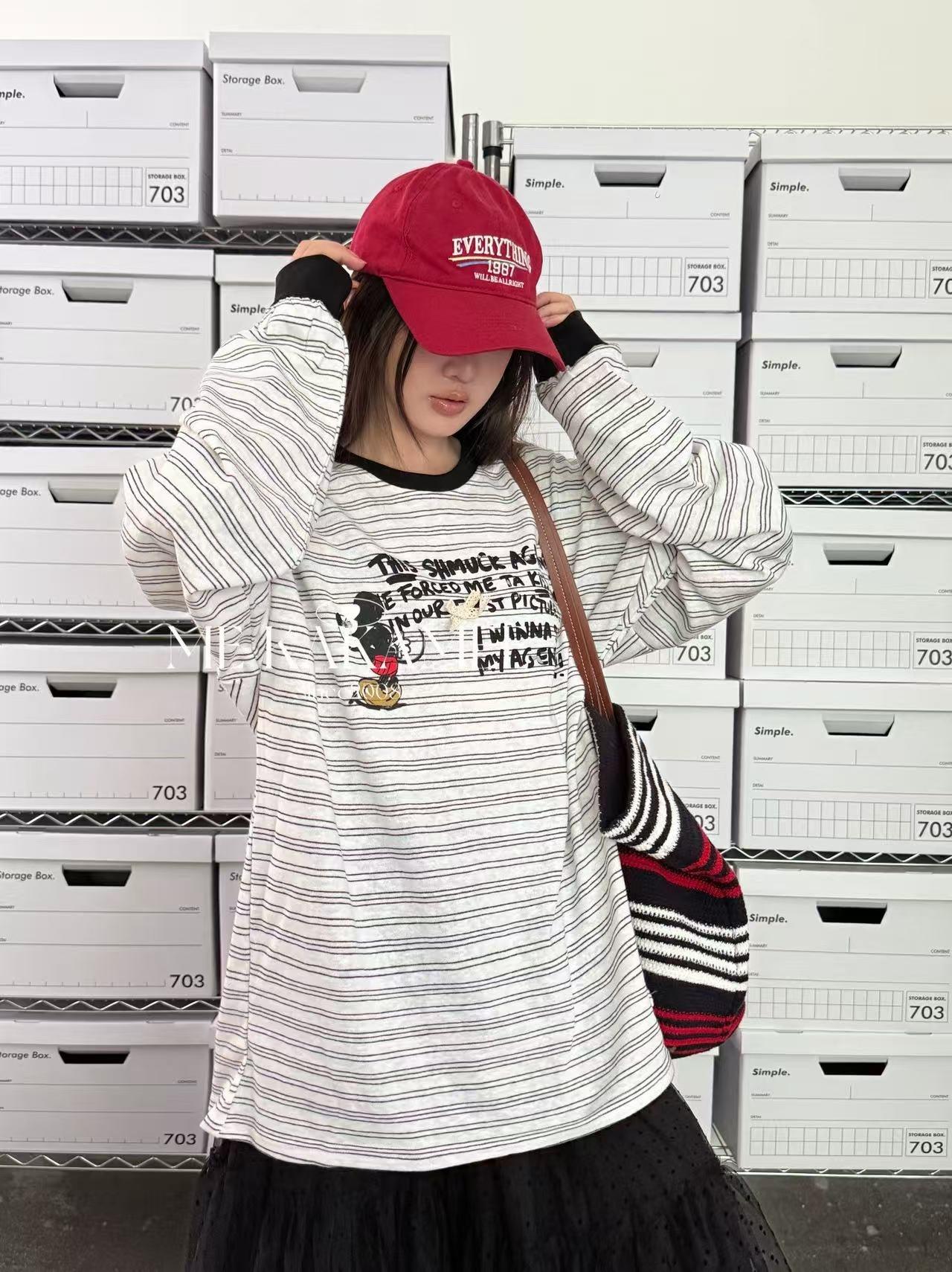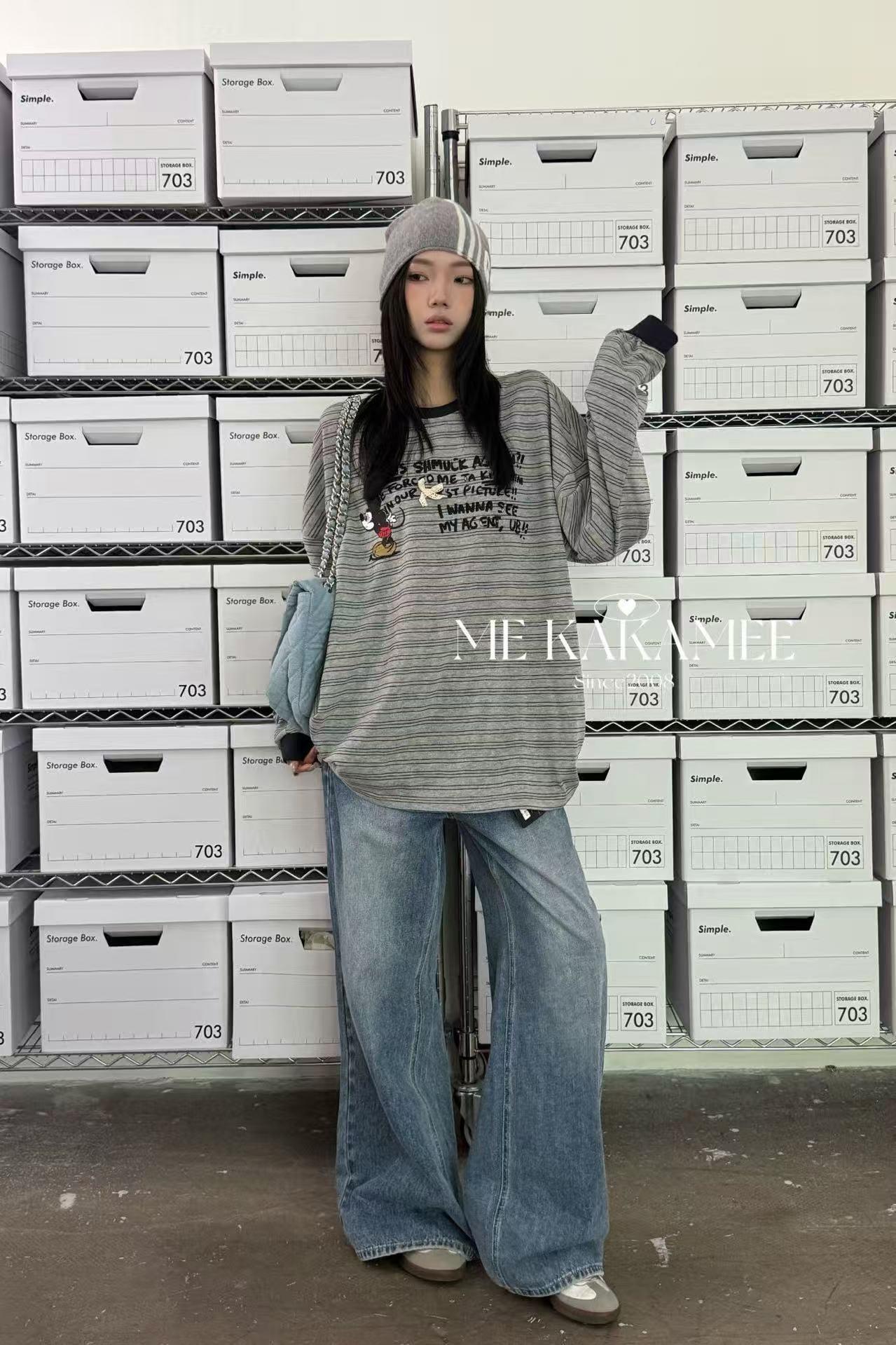 ME KAKAMEE Trece Líneas Otoño Nueva Tendencia American Graffiti Rayas MQ Camiseta de Manga Larga Holgada Mujer Coreana 8819