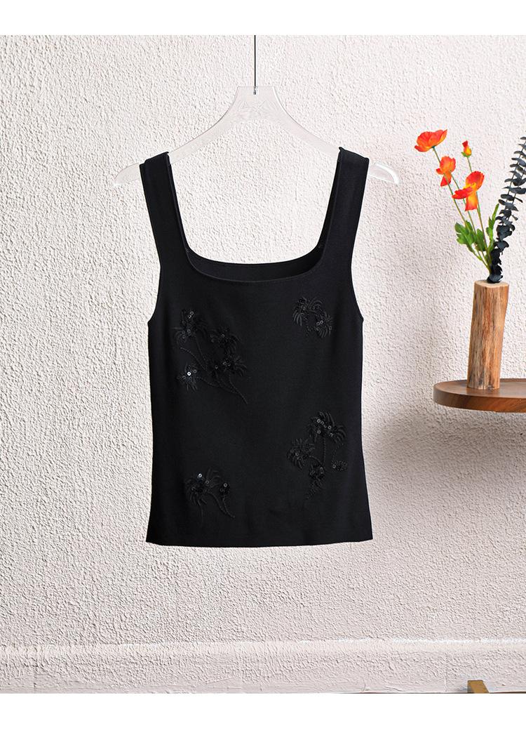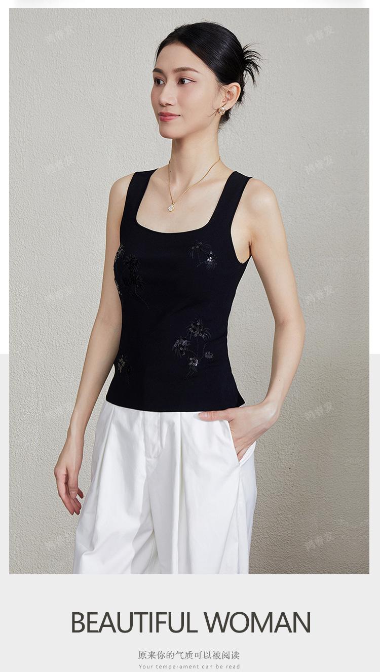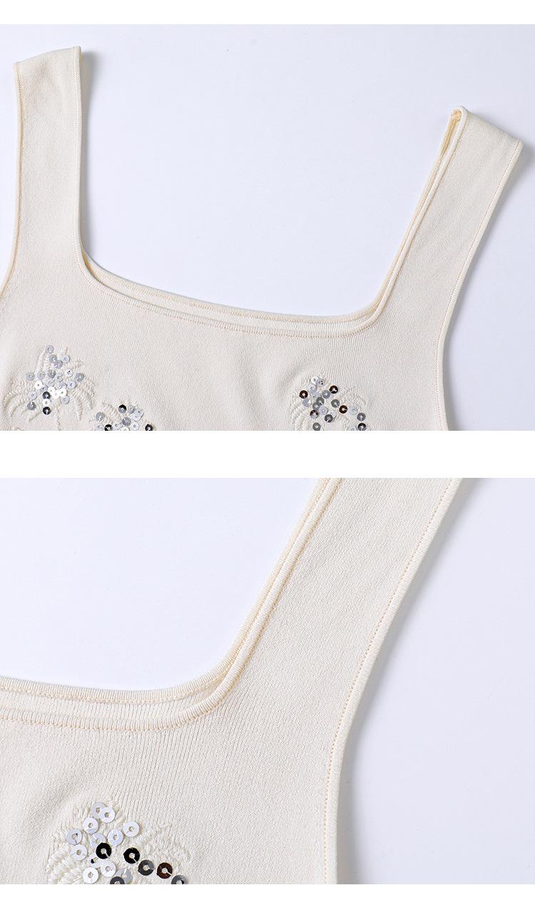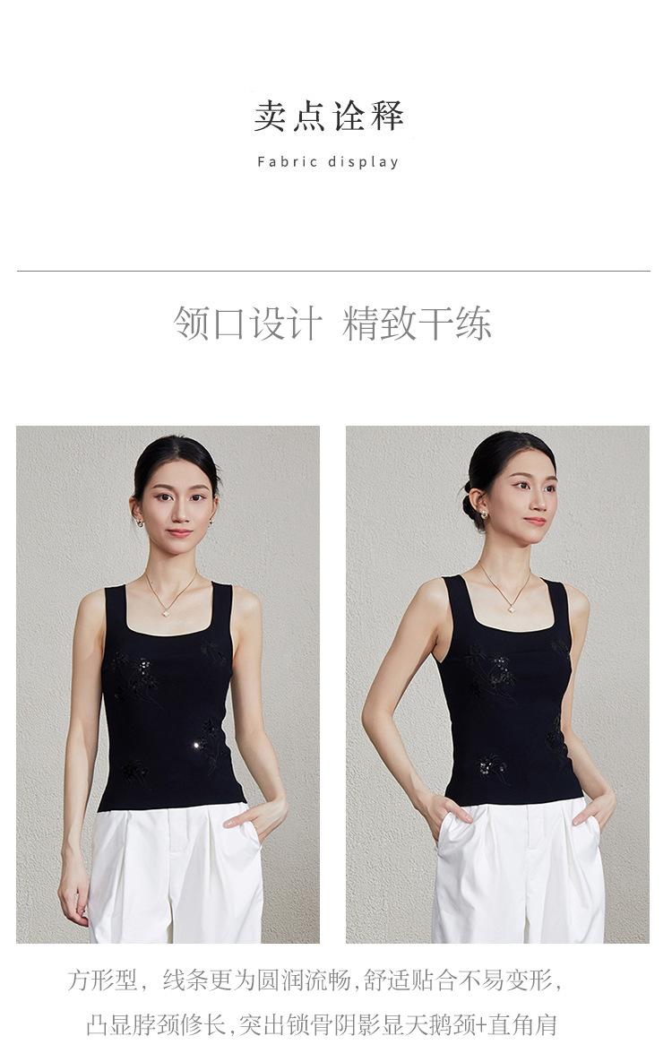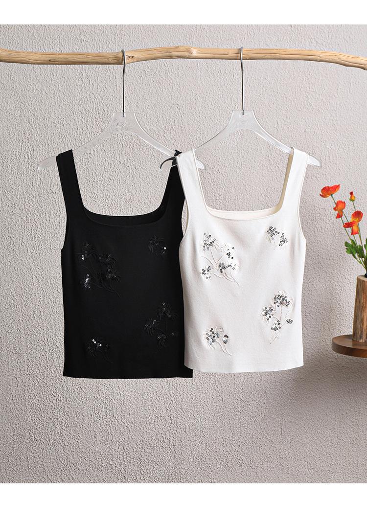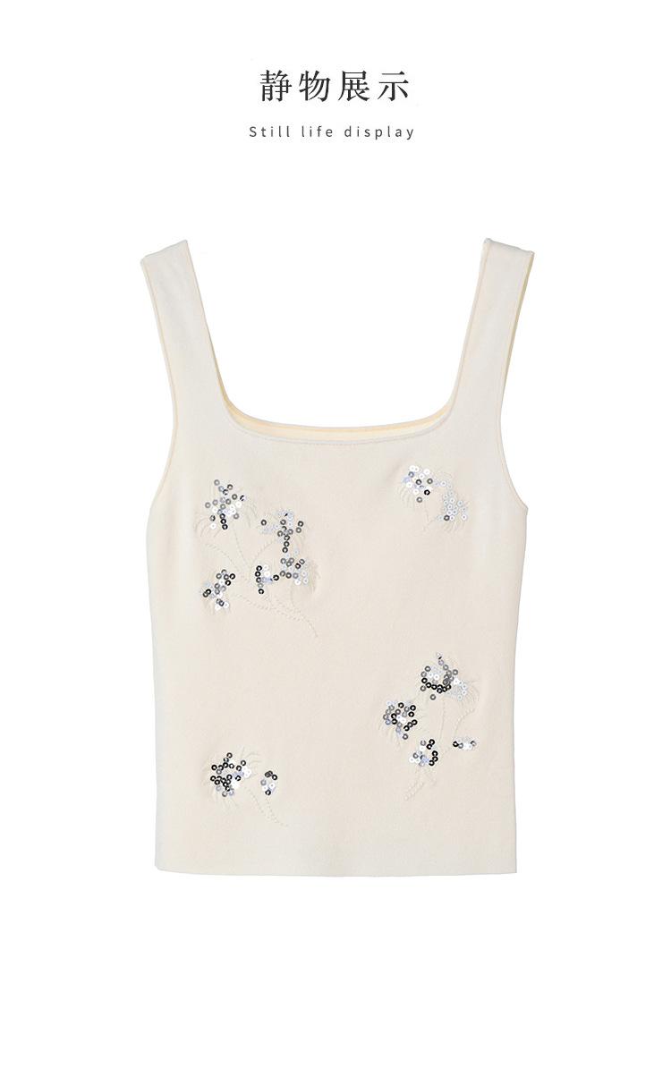 Verano 2025 Nuevo Camisola de Moda Slim Versátil de Punto con Cuello Cuadrado Bordado con Lentejuelas Pesadas Top de Seda Hielo