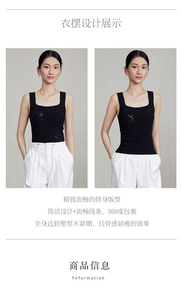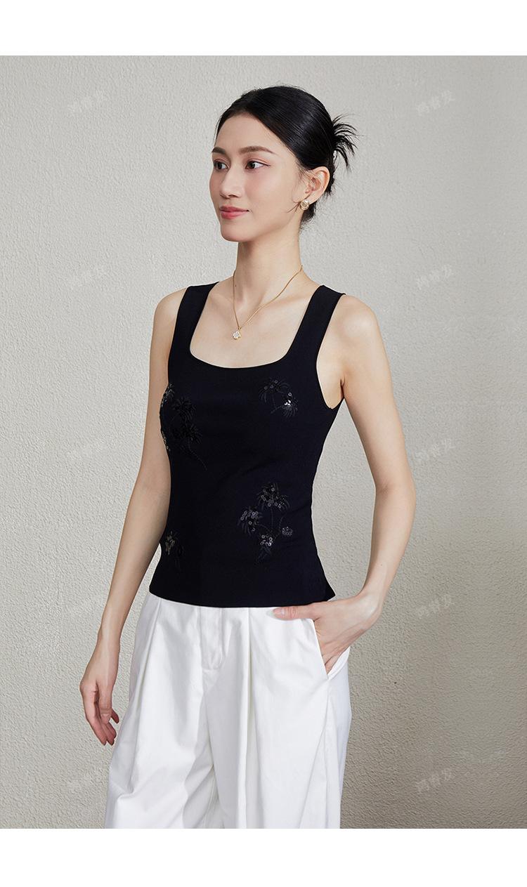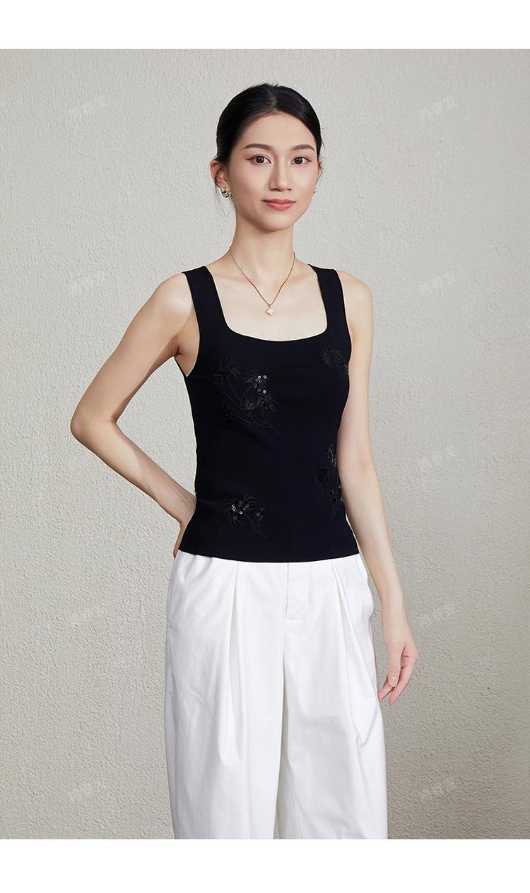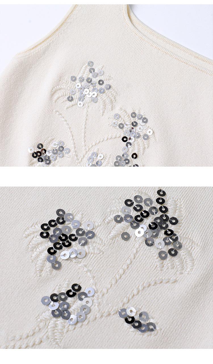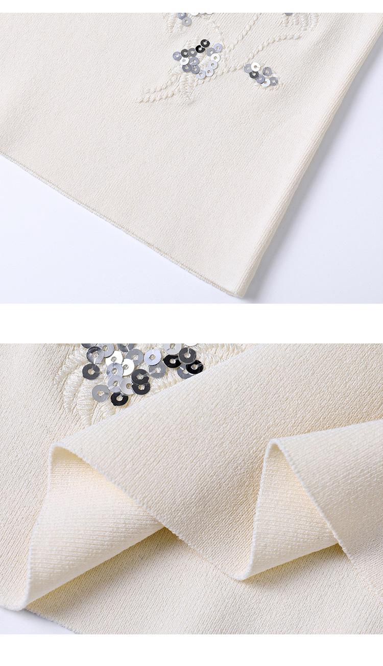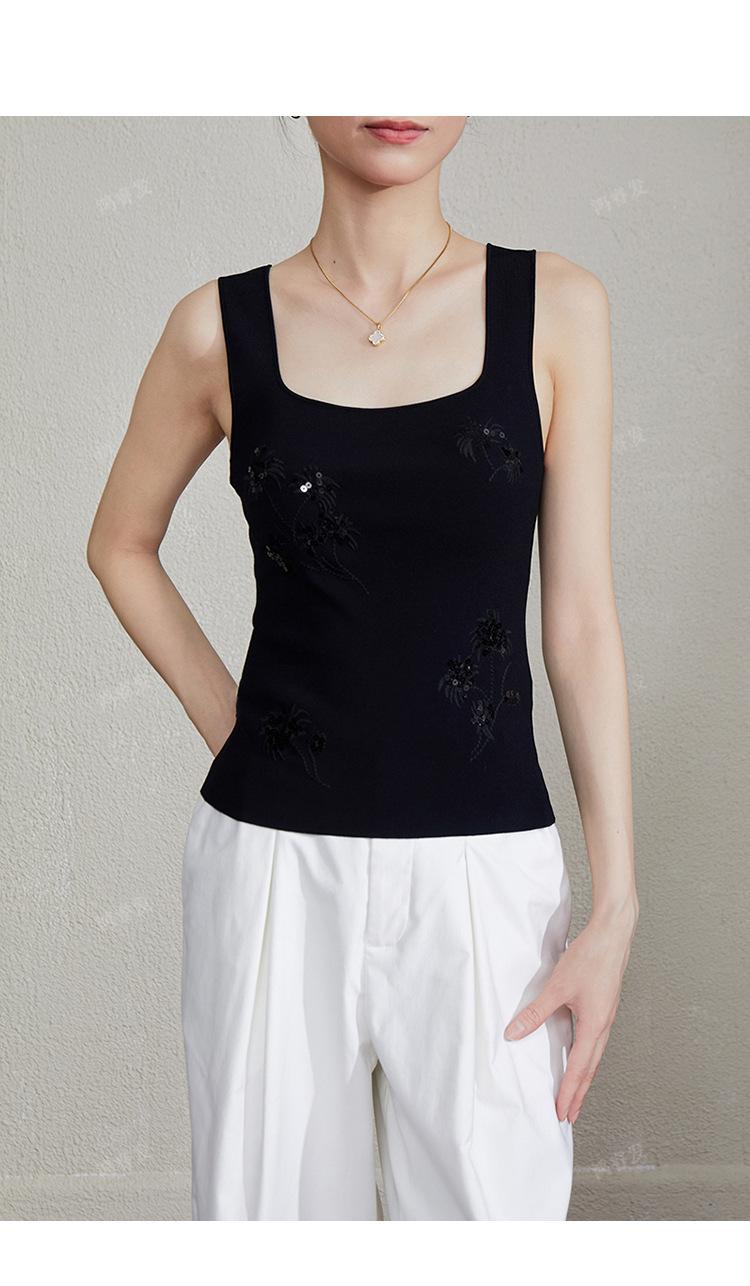 Verano 2025 Nuevo Camisola de Moda Slim Versátil de Punto con Cuello Cuadrado Bordado con Lentejuelas Pesadas Top de Seda Hielo