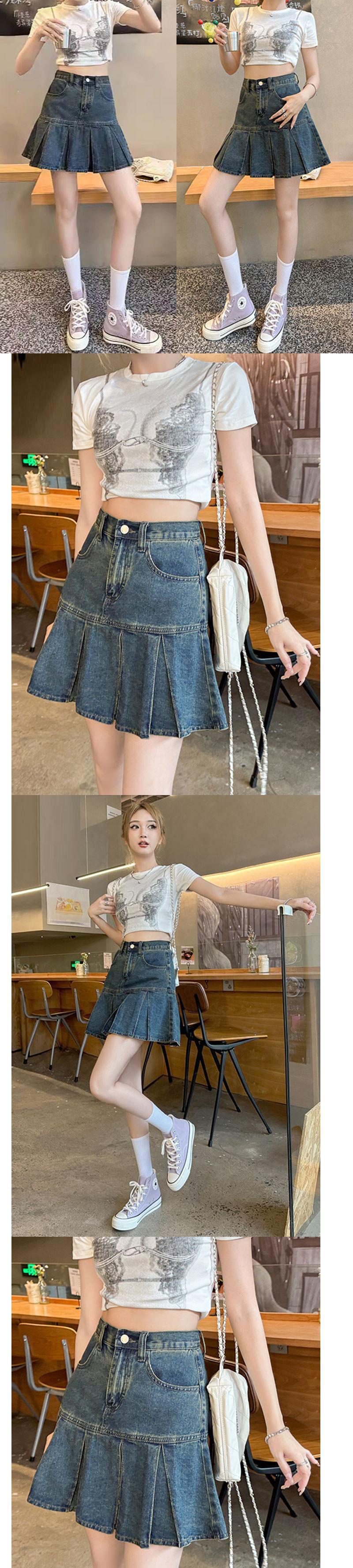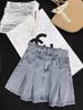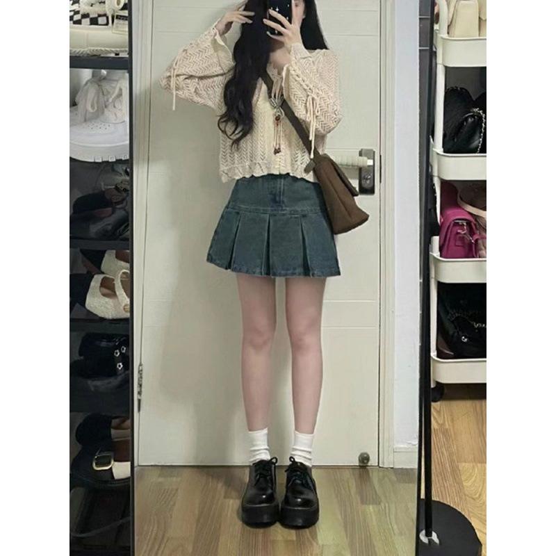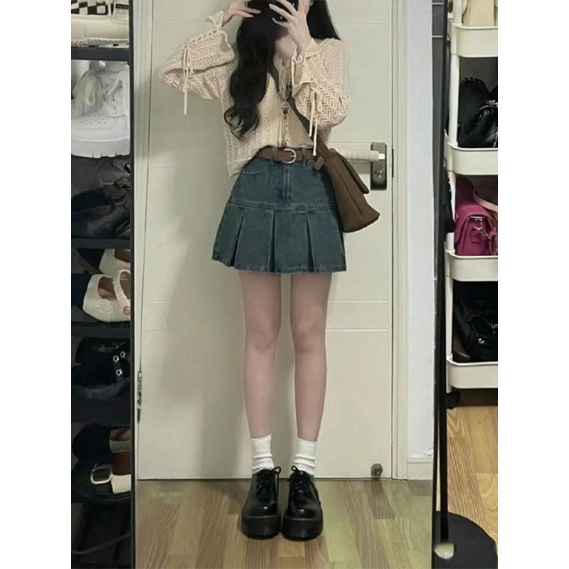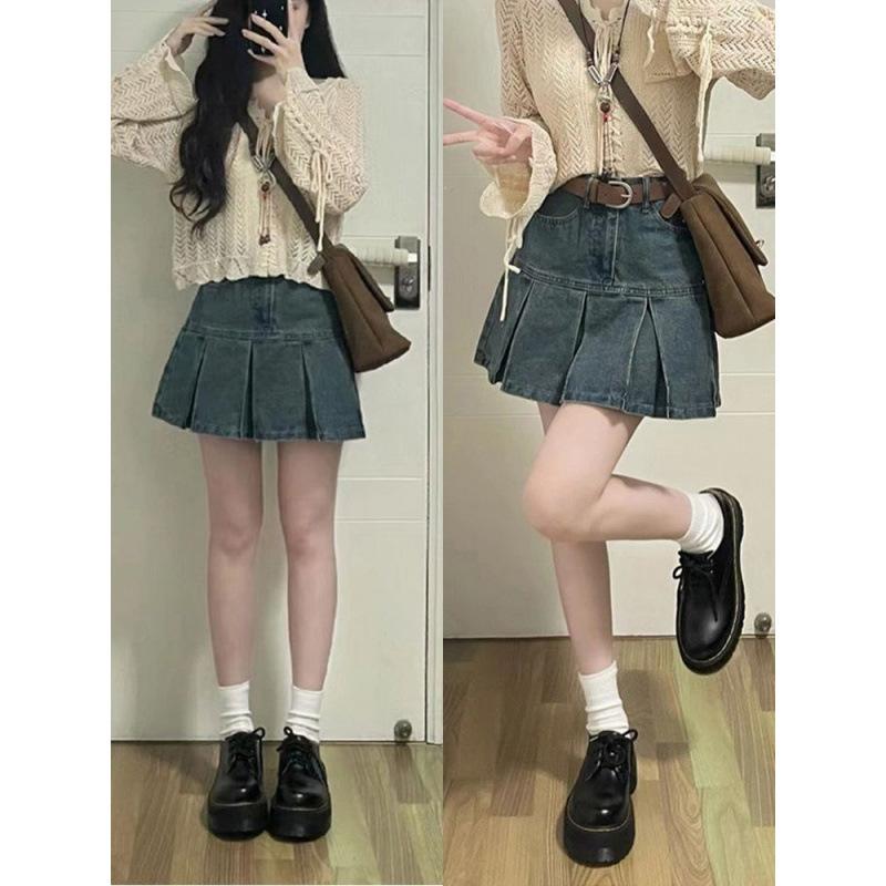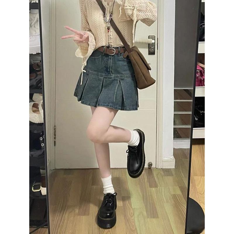 Falda de mezclilla plisada de diseño retro para mujer 2025 verano nuevo cintura alta talla grande adelgazante look estilo pura lujuria