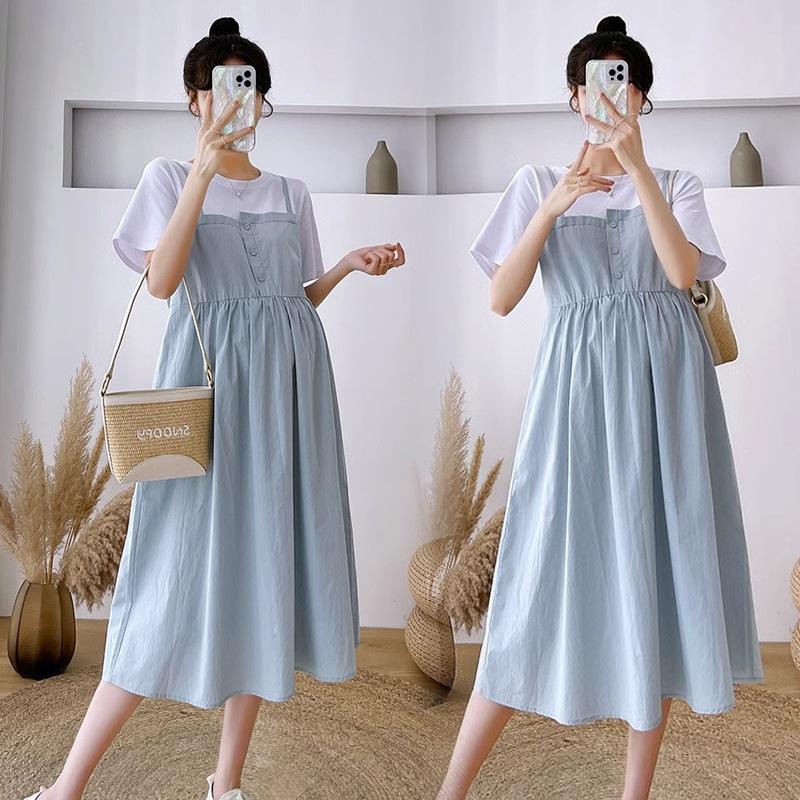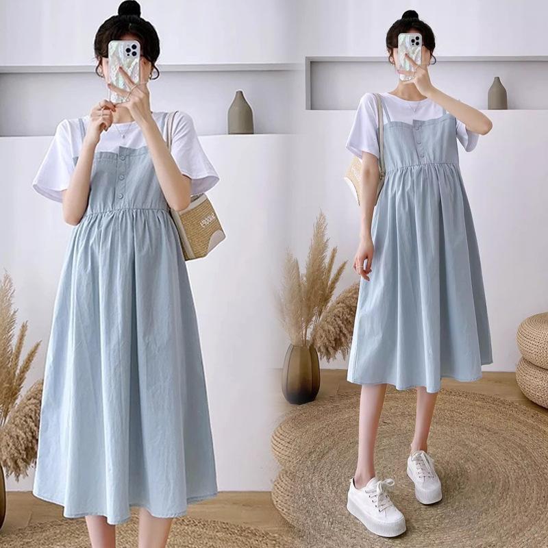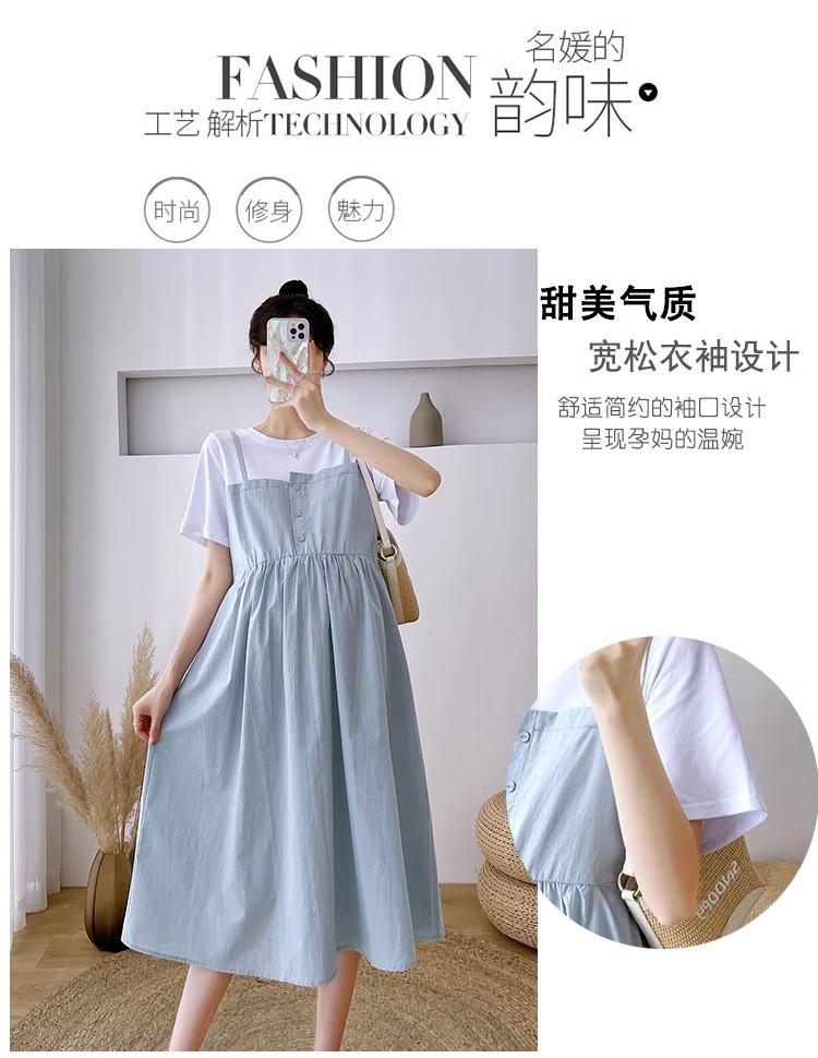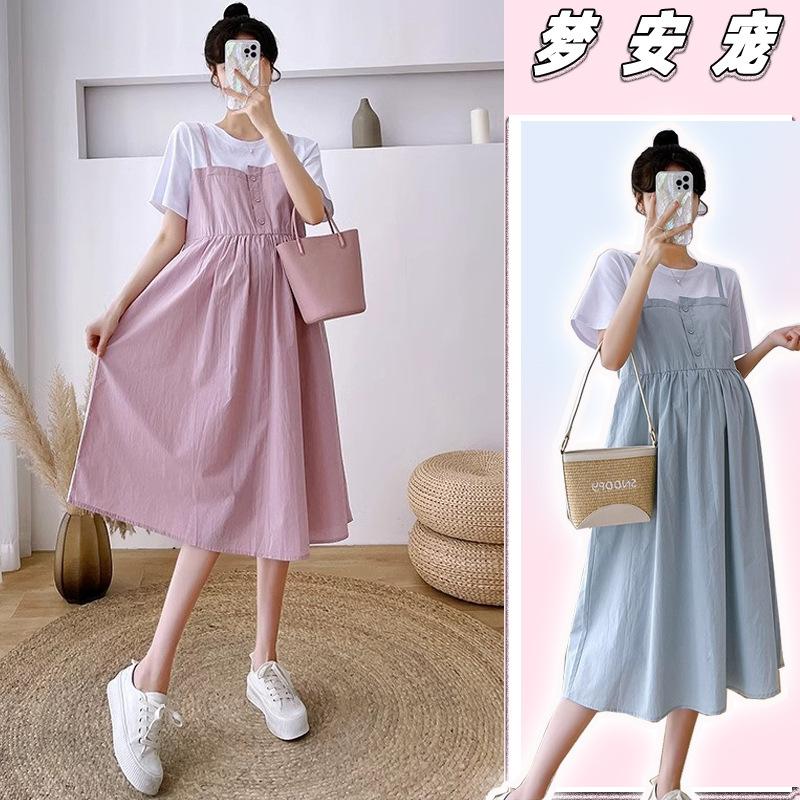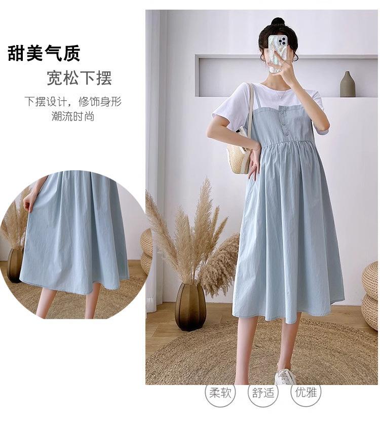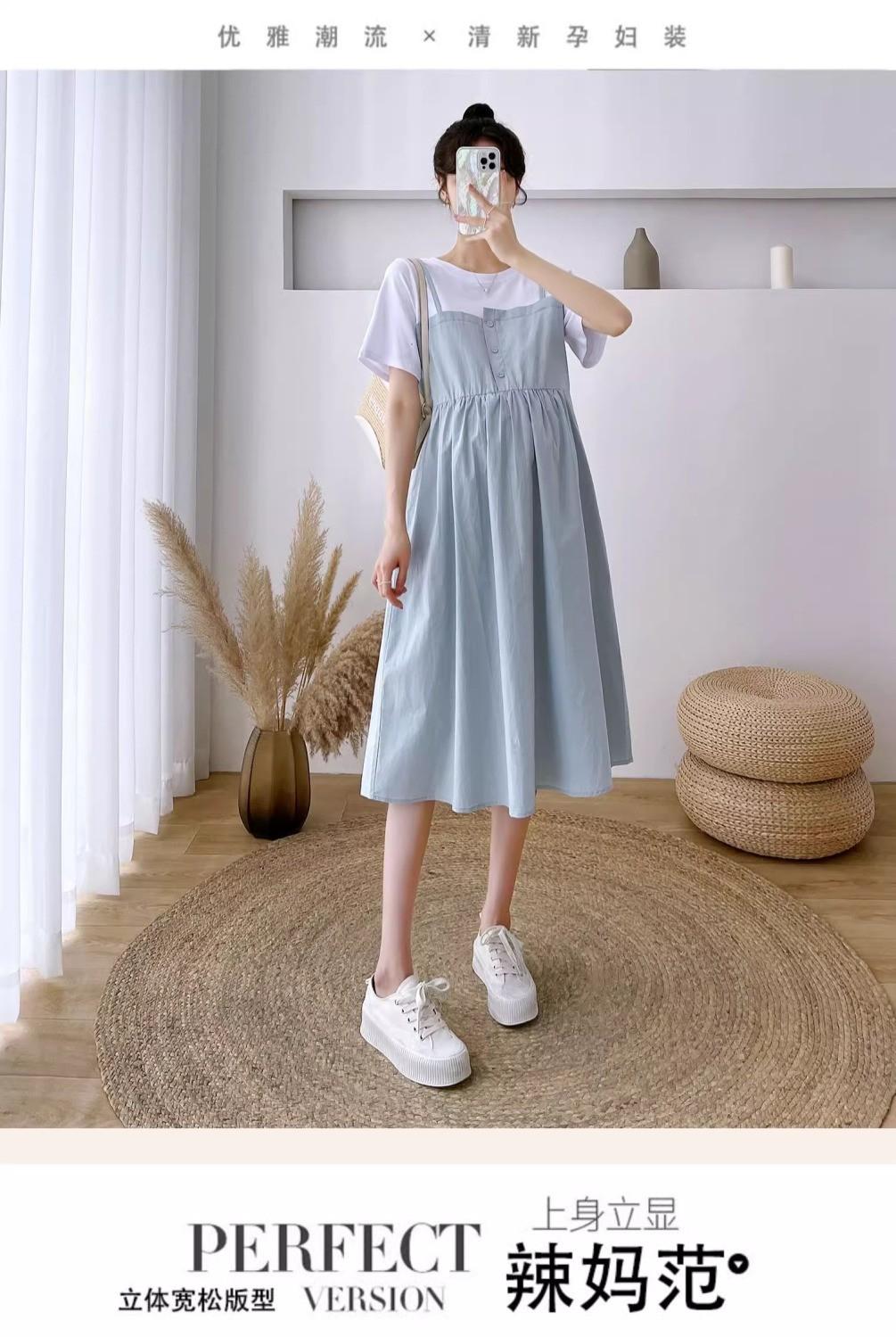 Vestido de Maternidad Estilo Coreano Nuevo Verano Delgado Falso Dos Piezas Falda Media Longitud Cintura Alta Cubre Abdomen Traje Adelgazante de Vientre