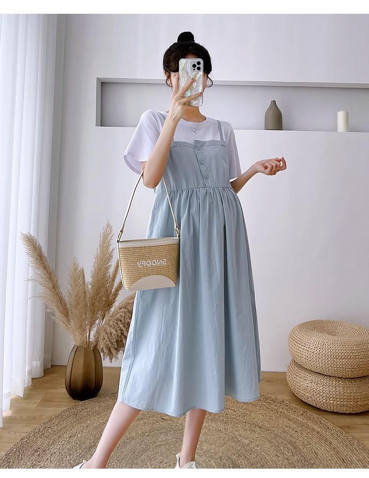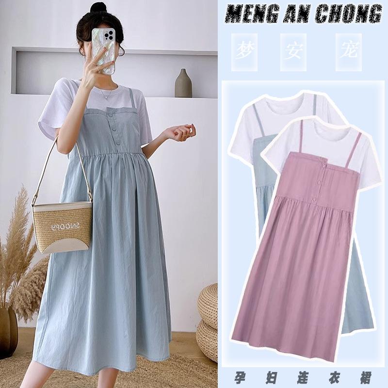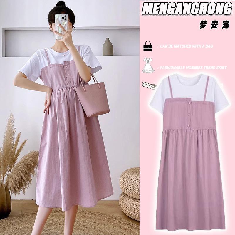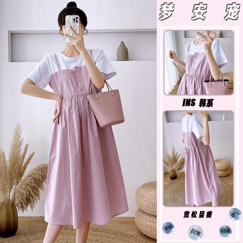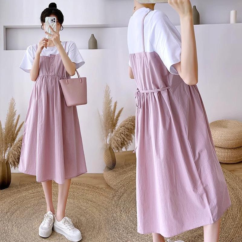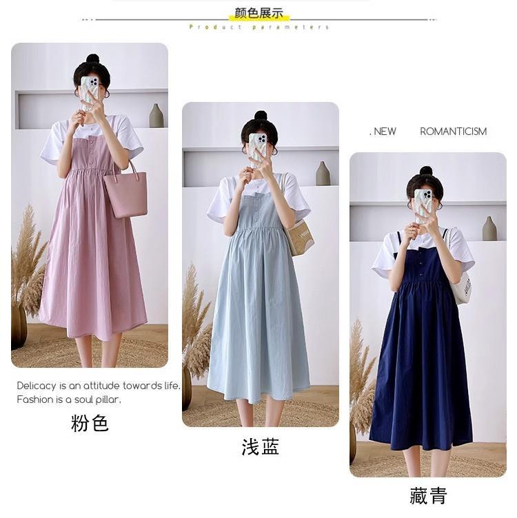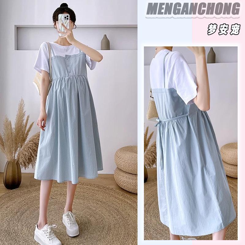 Vestido de Maternidad Estilo Coreano Nuevo Verano Delgado Falso Dos Piezas Falda Media Longitud Cintura Alta Cubre Abdomen Traje Adelgazante de Vientre