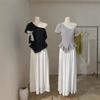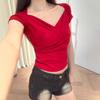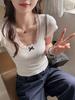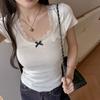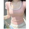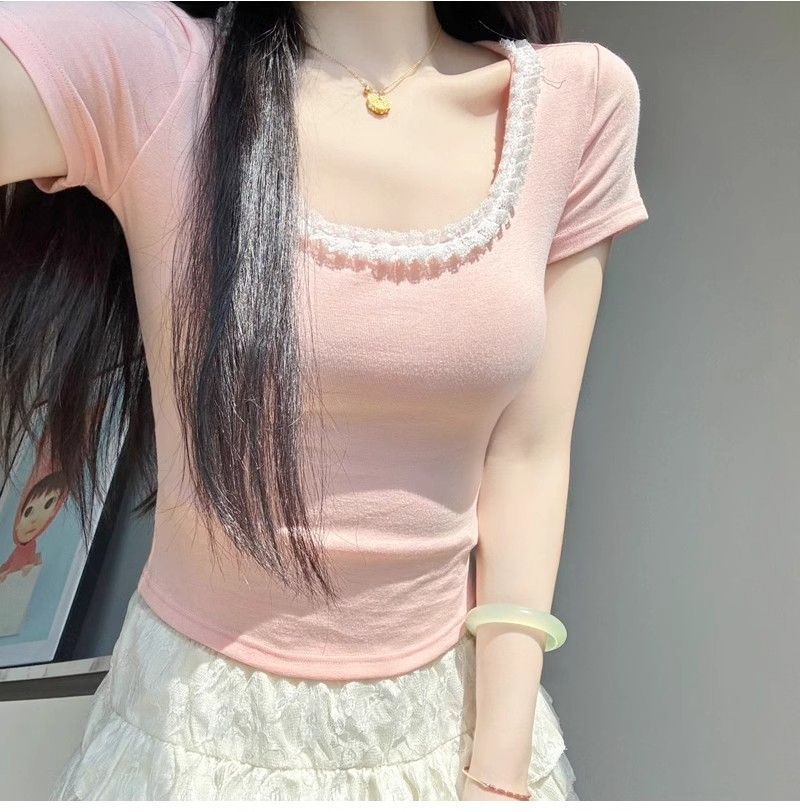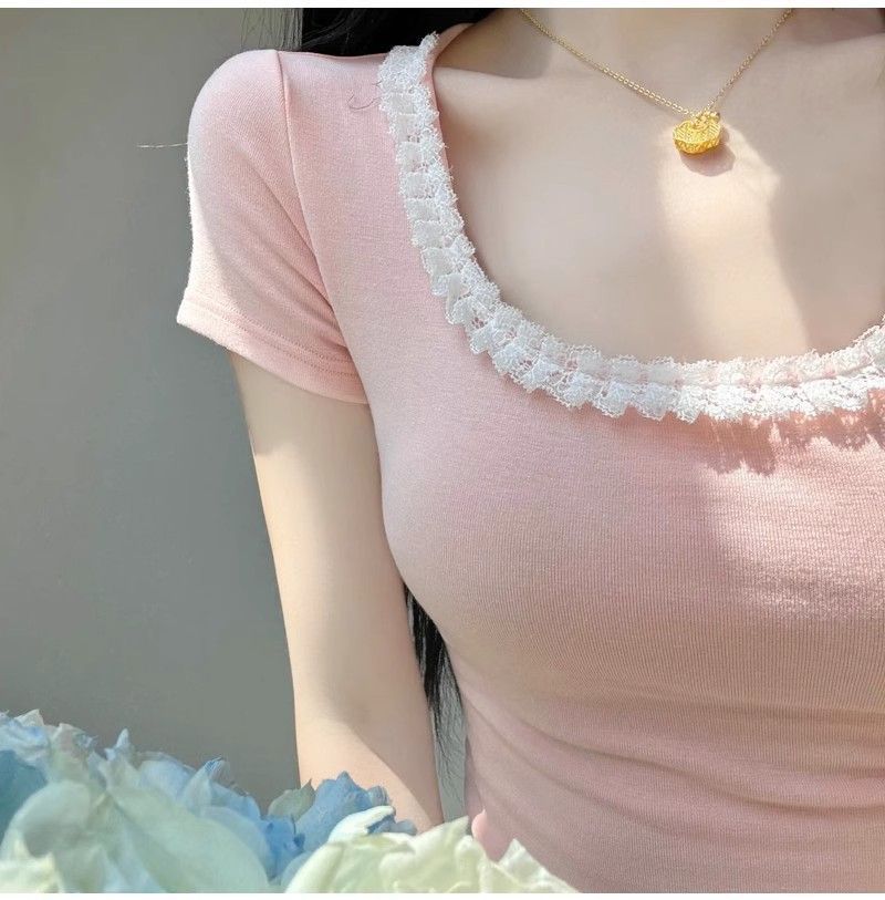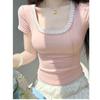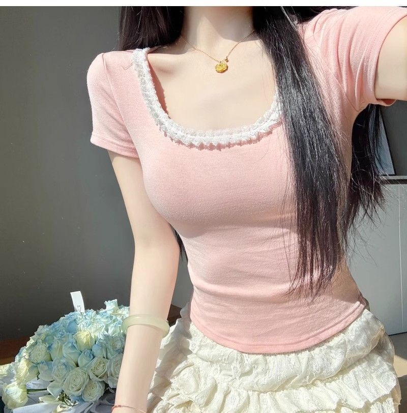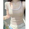 Deseo Puro Encaje Costuras Manga Corta Hombro Camiseta Mujer Verano Super Caliente Sexy Ajustada Cuello U Clavícula Expuesta Camiseta Base Top