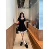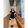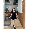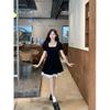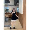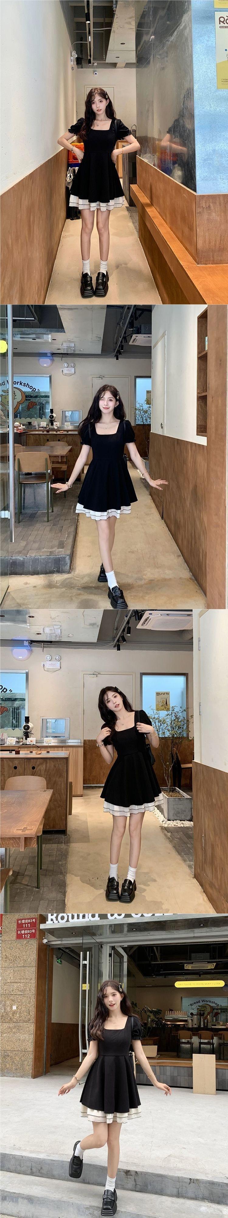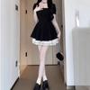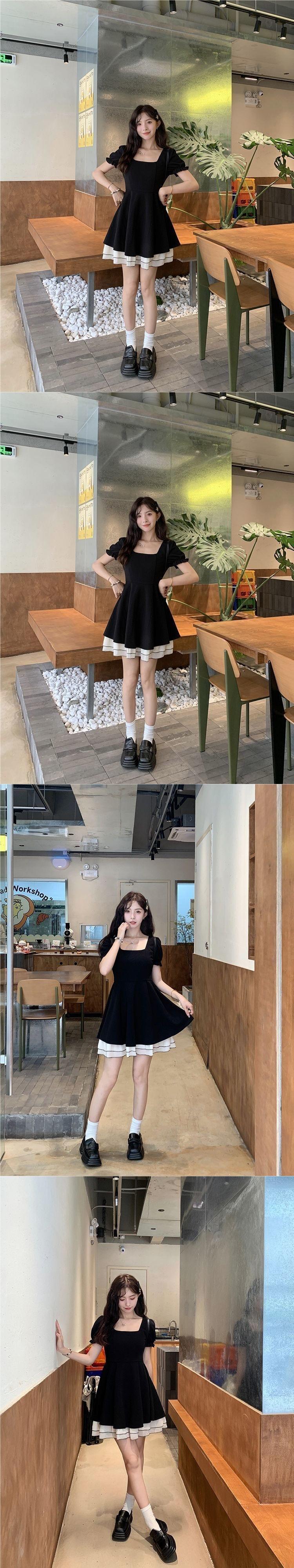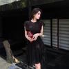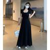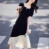 Vestido Negro Corto Hepburn Francés Verano Adelgazante de Cintura de Alta Gama Dulce Bloque de Color Costuras Petit Escote Cuadrado