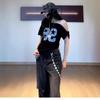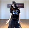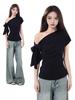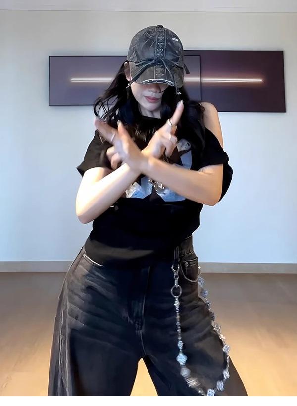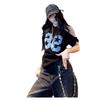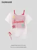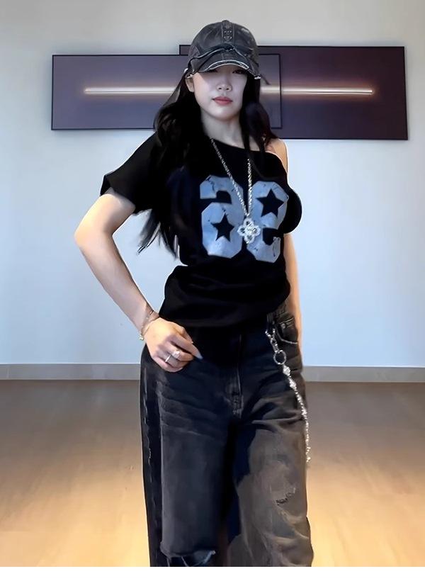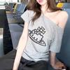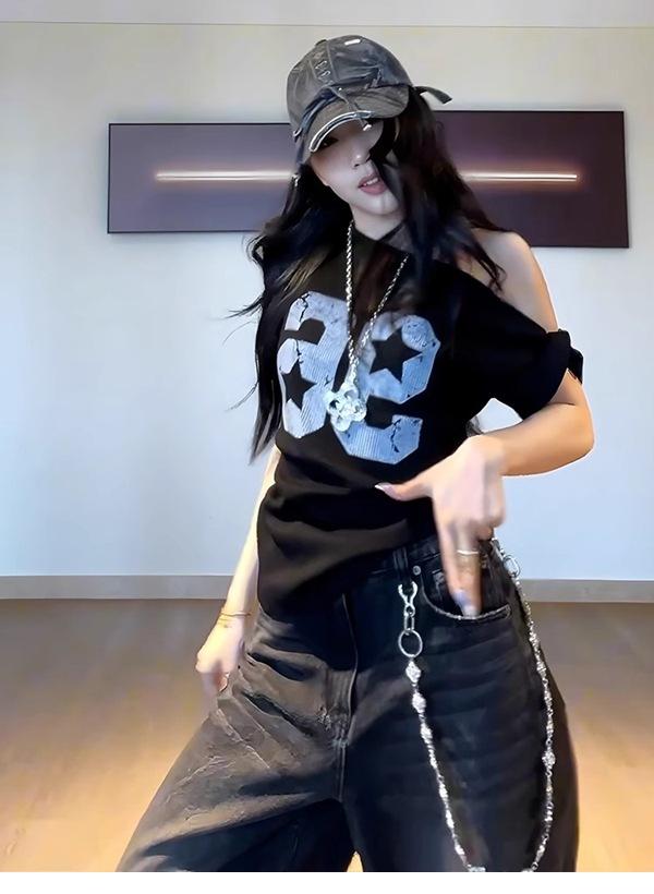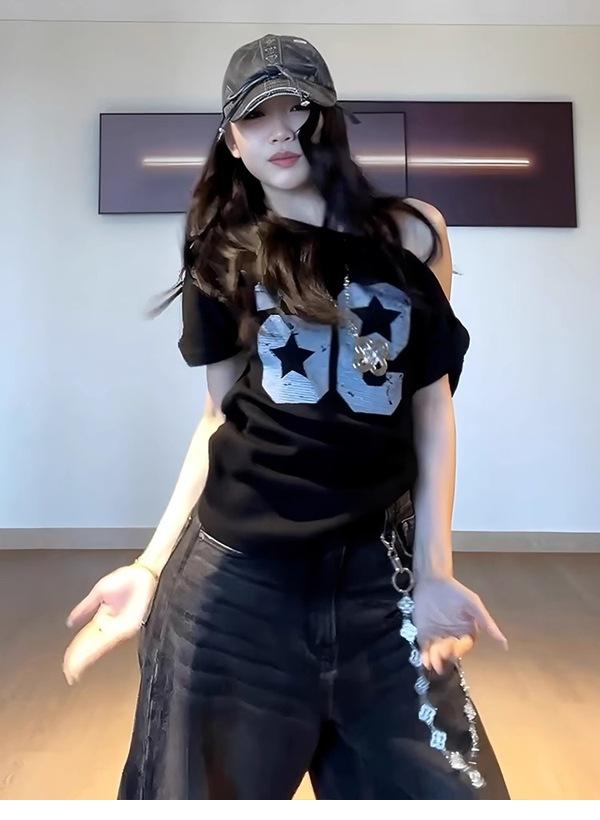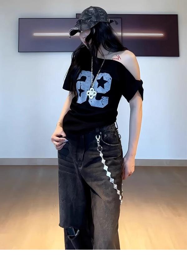 Camiseta de Verano para Mujer con Diseño de Hombro Descubierto y Hombro Inclinado, Estilo Retro Americano Sexy, con Estampado de Letras, Holgada y de Manga Corta
