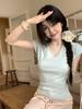 Playera de Diseño Coreano con Cuello en V y Manga Corta para Mujer 2025 Verano Nuevo Estilo Coreano Slim y Versátil Tops Cortos para Estudiante Trendy