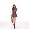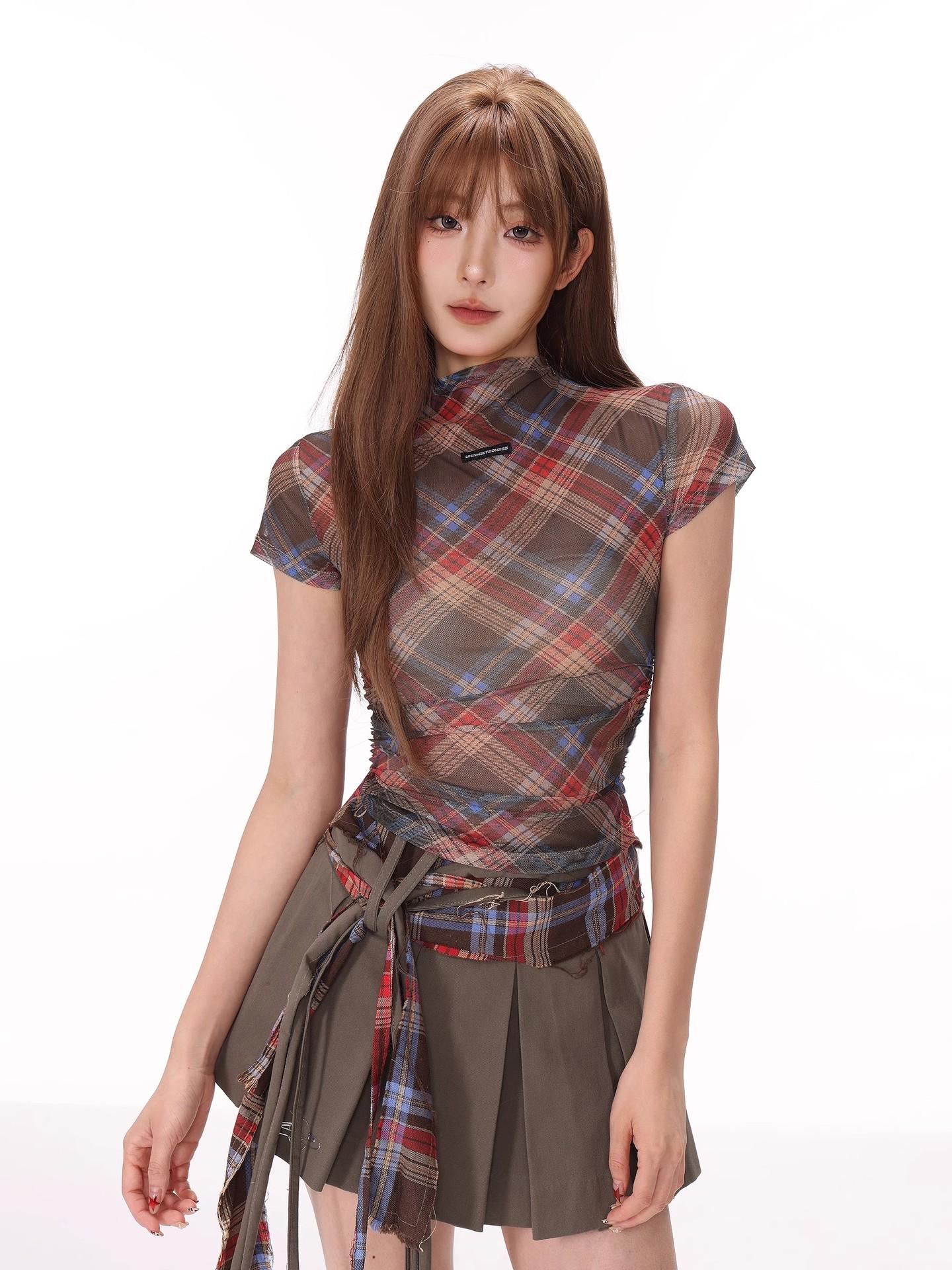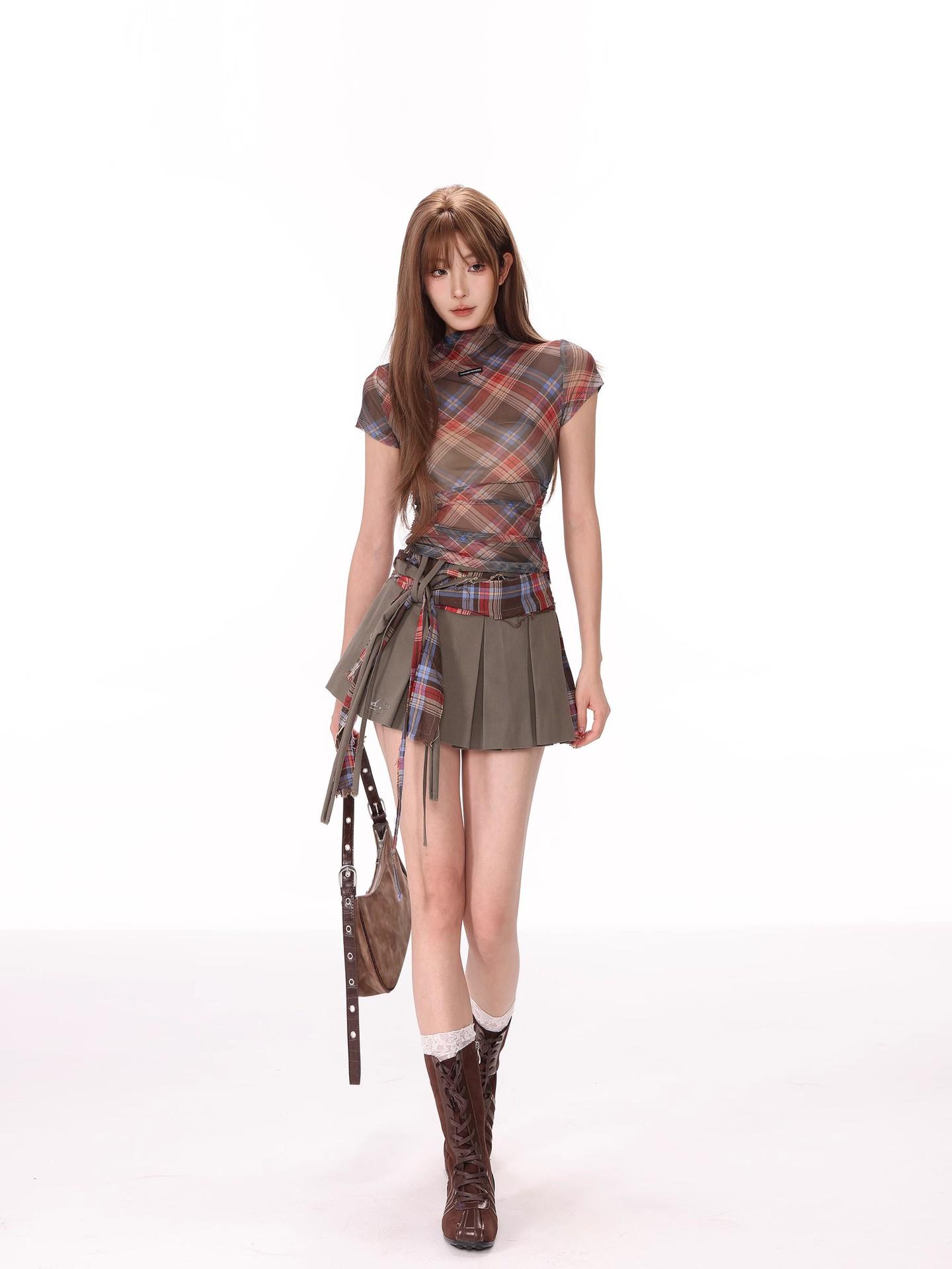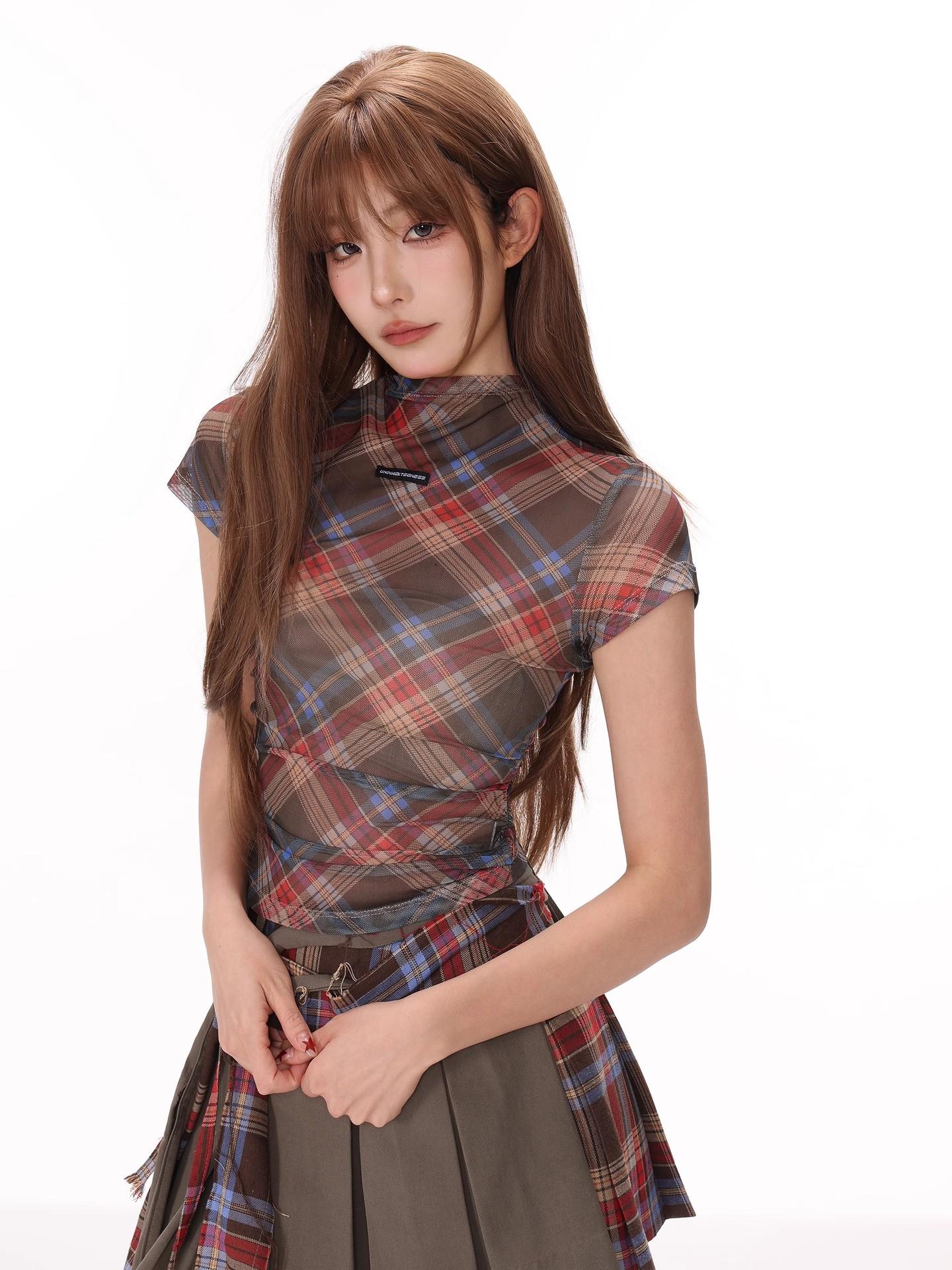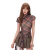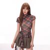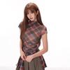 Playera Retro de Cuadros con Cuello Mao de Manga Corta y Hombro Recto para Mujer Verano Nuevo Sexy Chica Caliente Fruncido Bodycon Adelgazante