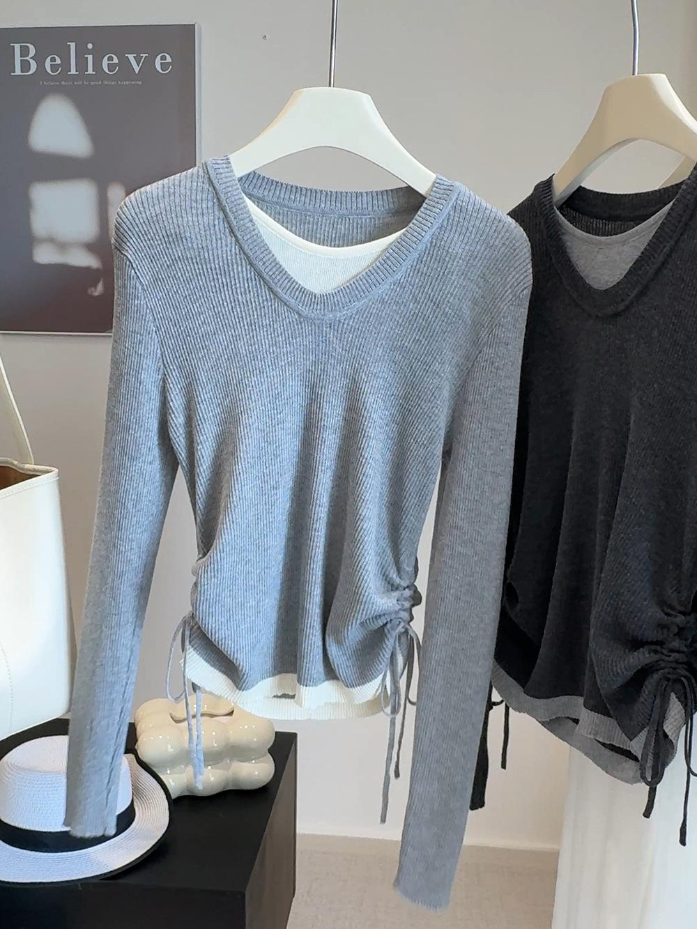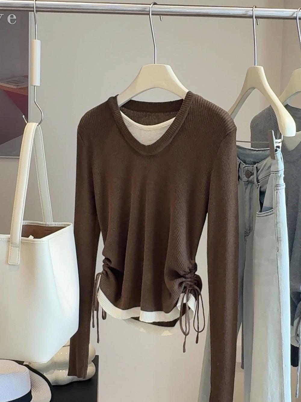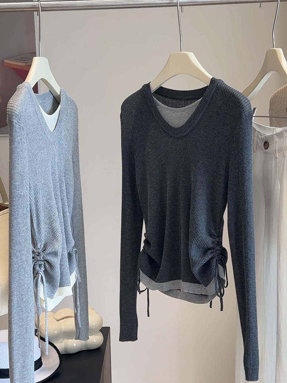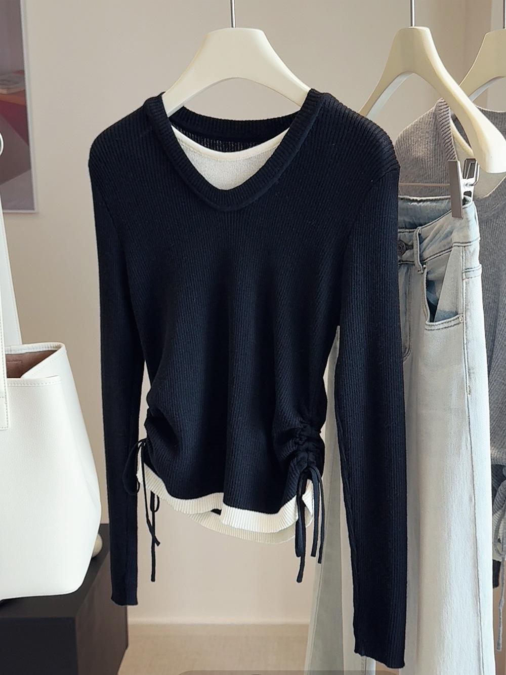 Principios de Otoño Estilo Coreano de Alta Gama 2025 Nuevo Camiseta Básica de Cuello Redondo para Mujer Falso Dos Piezas Manga Larga Cintura con Cordón Top de Punto