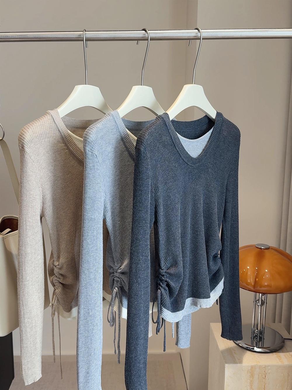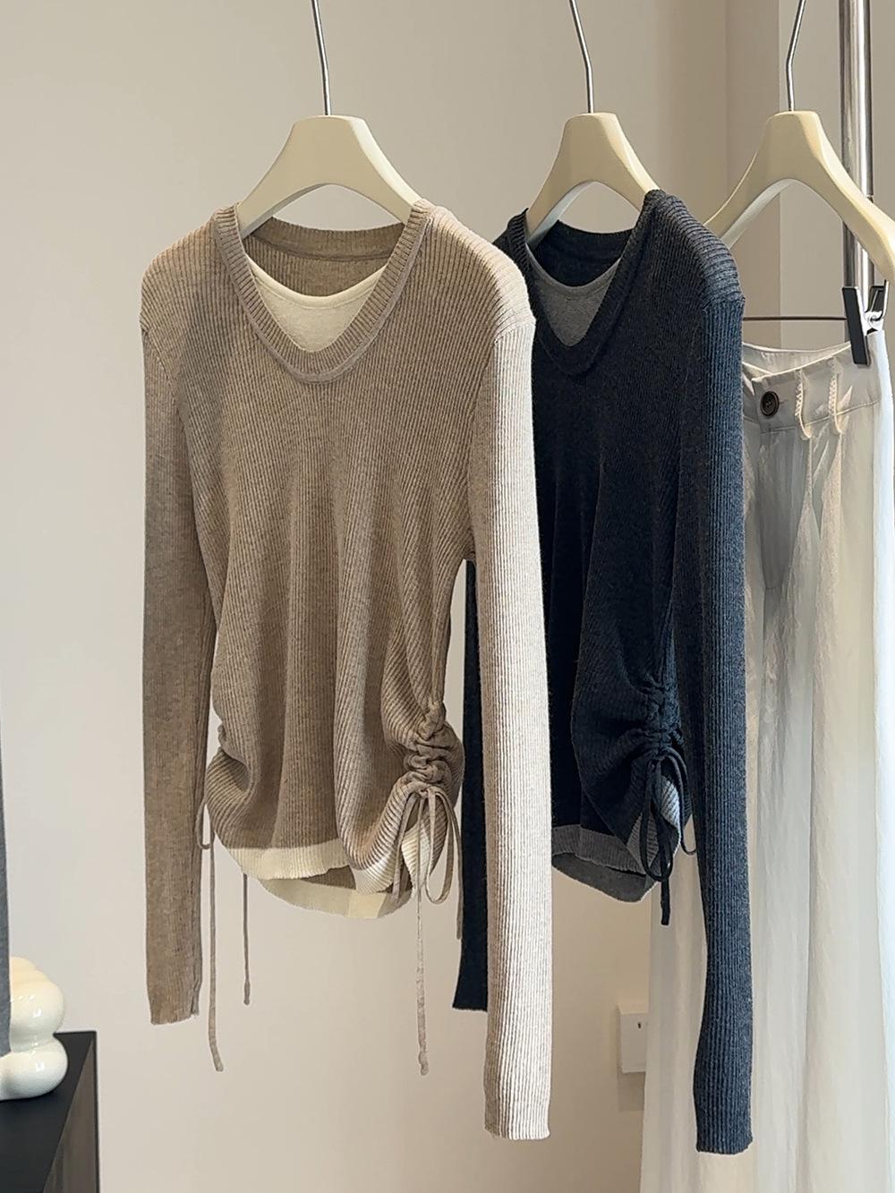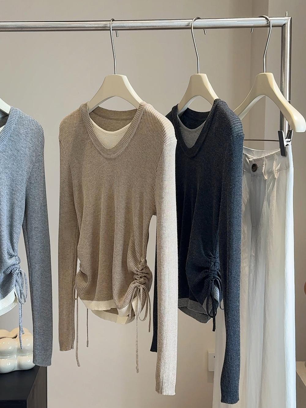 Principios de Otoño Estilo Coreano de Alta Gama 2025 Nuevo Camiseta Básica de Cuello Redondo para Mujer Falso Dos Piezas Manga Larga Cintura con Cordón Top de Punto