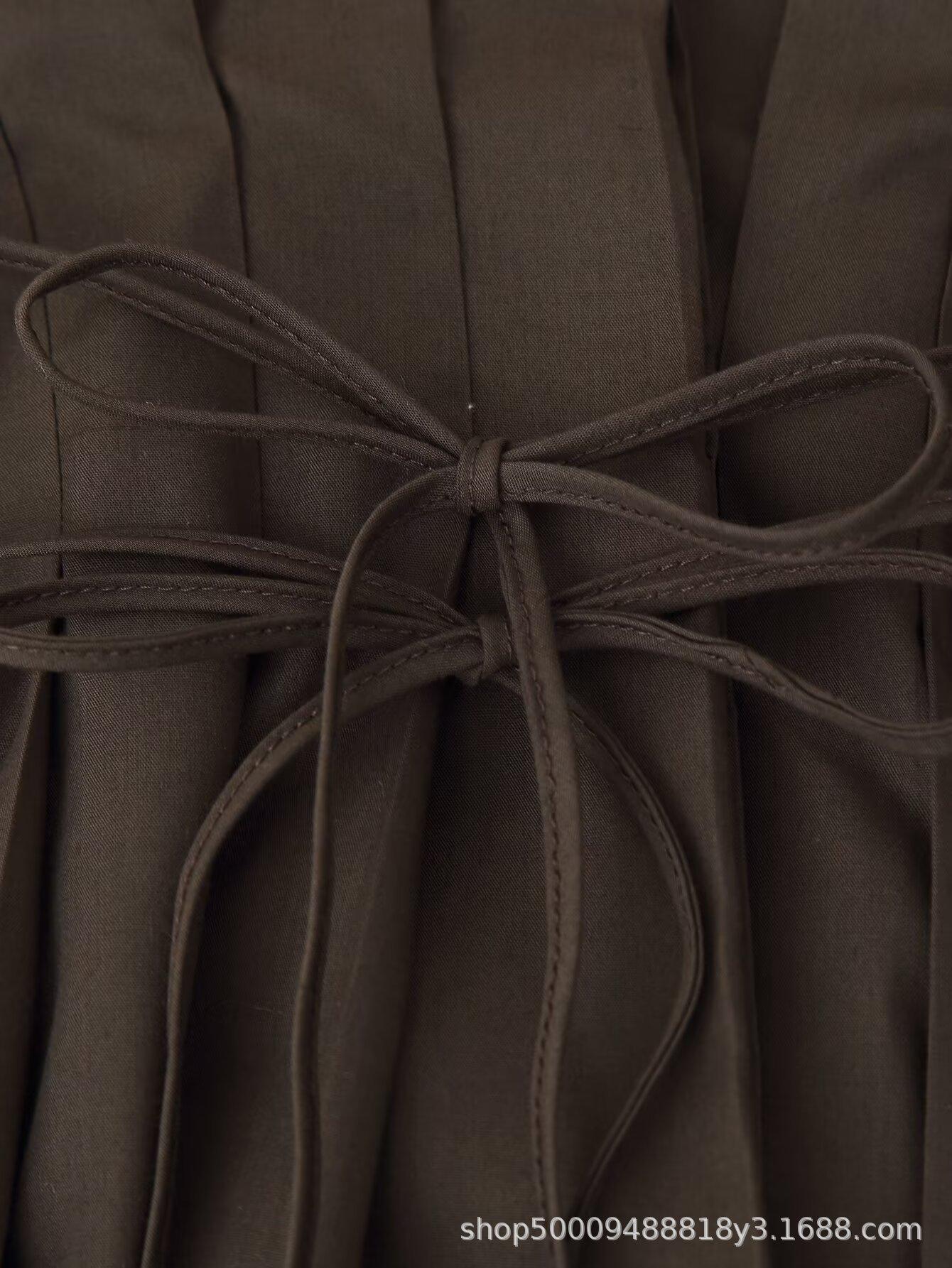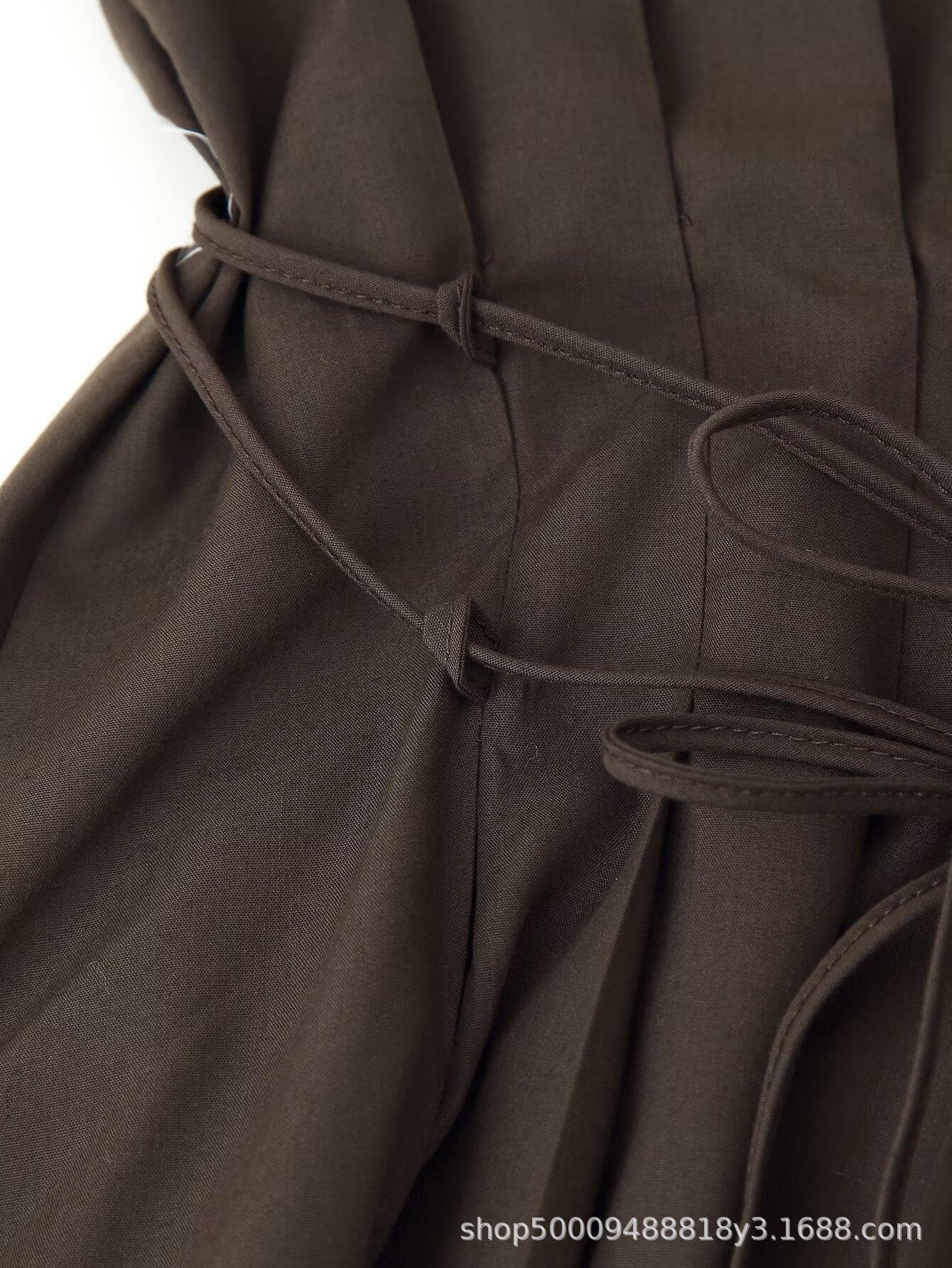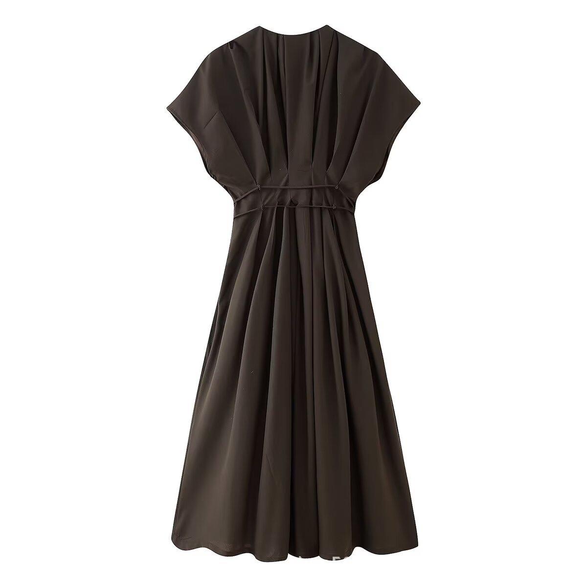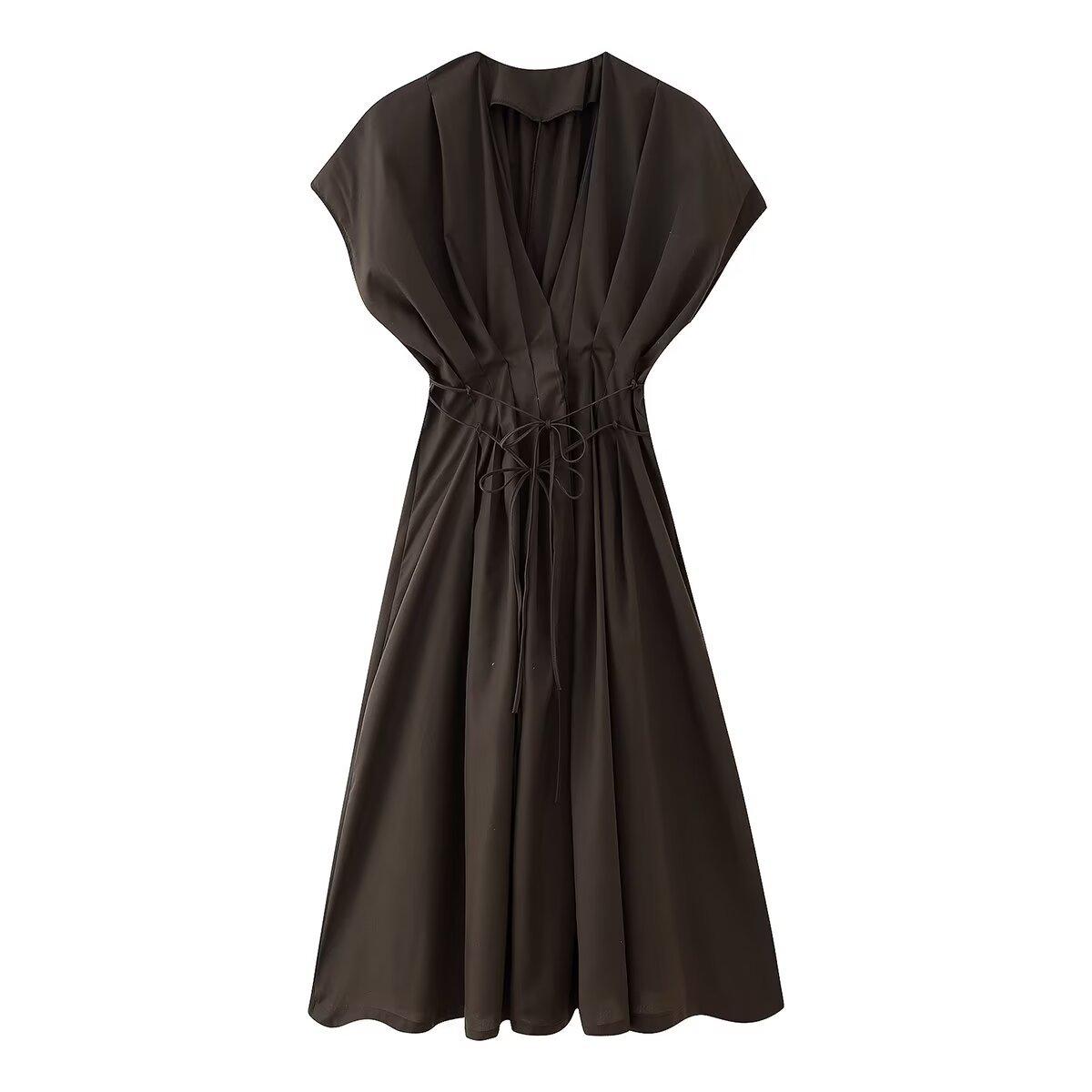 Exportación Transfronteriza 2025 Nueva Ropa de Verano para Mujer Aspecto Elegante y Adelgazante Cintura con Cordones Cuello en V Vestido Plisado