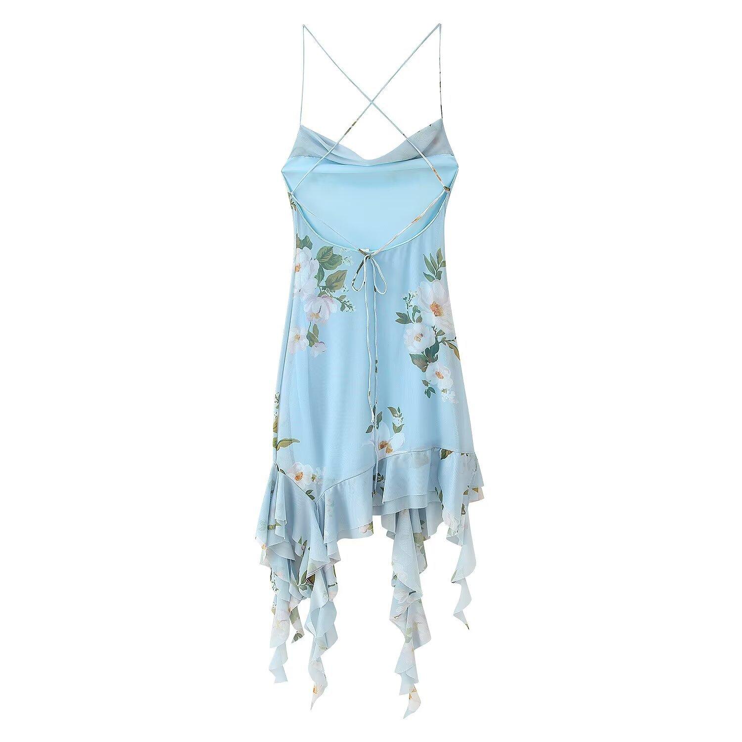 Venta al por Mayor Transfronteriza 2025 Verano Nuevo Estilo Europeo y Americano Vestido de Tirantes de Tul Estampado Sexy Ajustado Sin Espalda