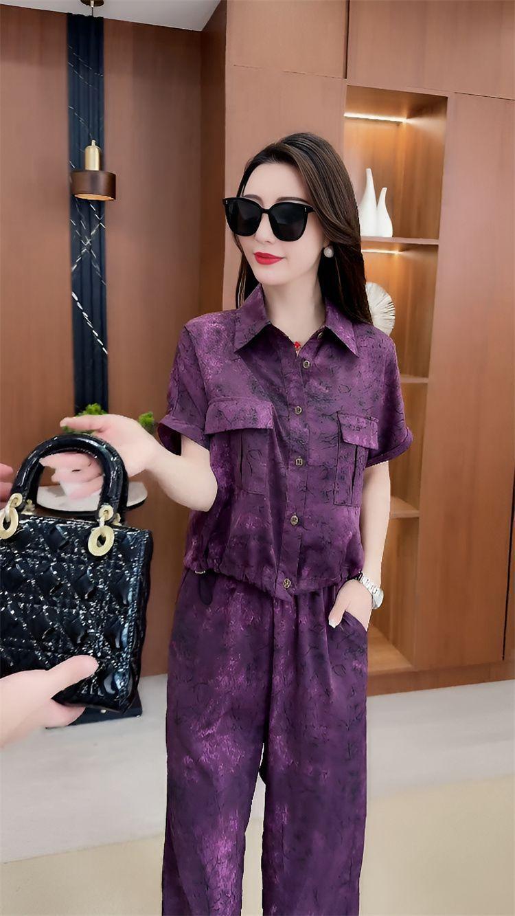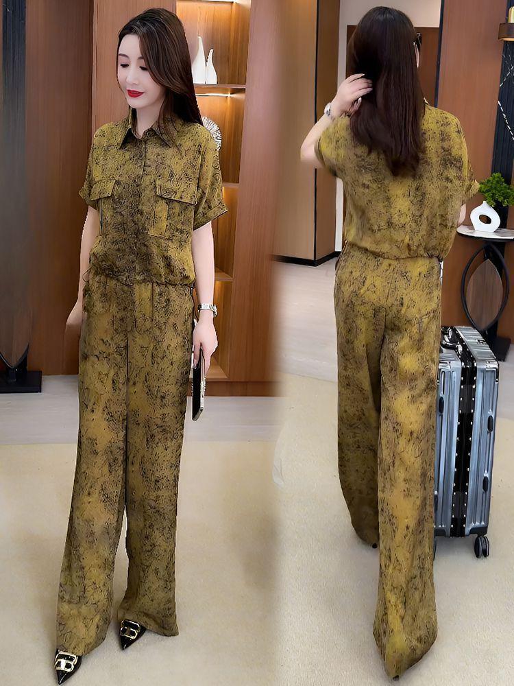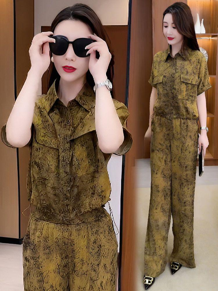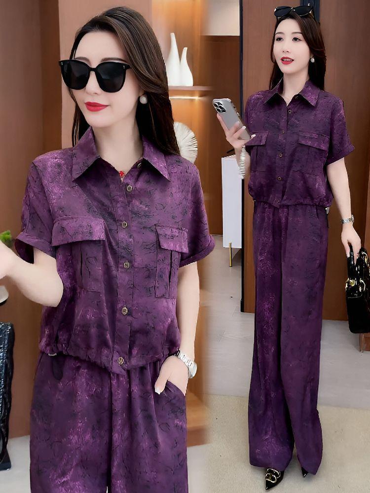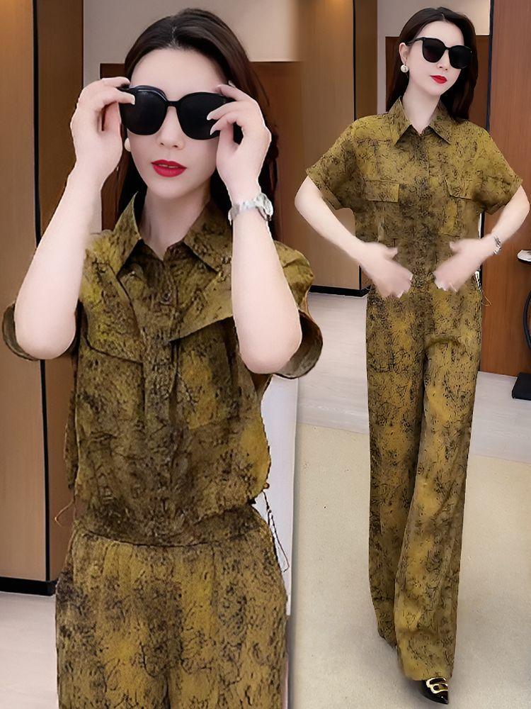 Verano Nueva Moda Camisa Reductora de Edad Pantalones de Pierna Ancha Adelgazantes Conjunto de Dos Piezas Talla Grande Casual Retro Traje de Manga Corta para Mujer