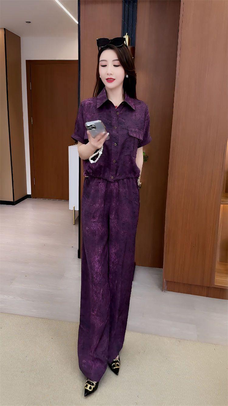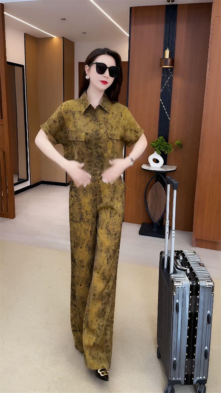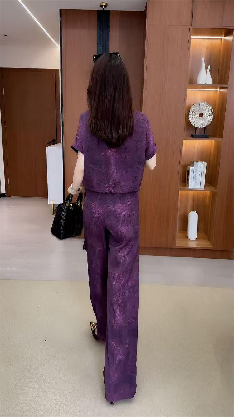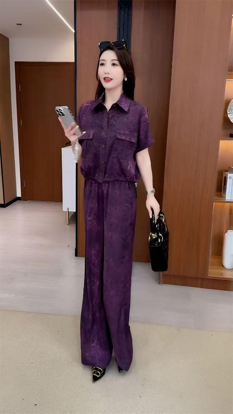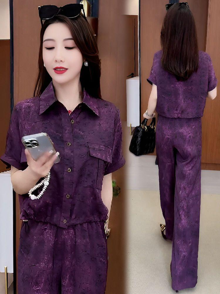 Verano Nueva Moda Camisa Reductora de Edad Pantalones de Pierna Ancha Adelgazantes Conjunto de Dos Piezas Talla Grande Casual Retro Traje de Manga Corta para Mujer